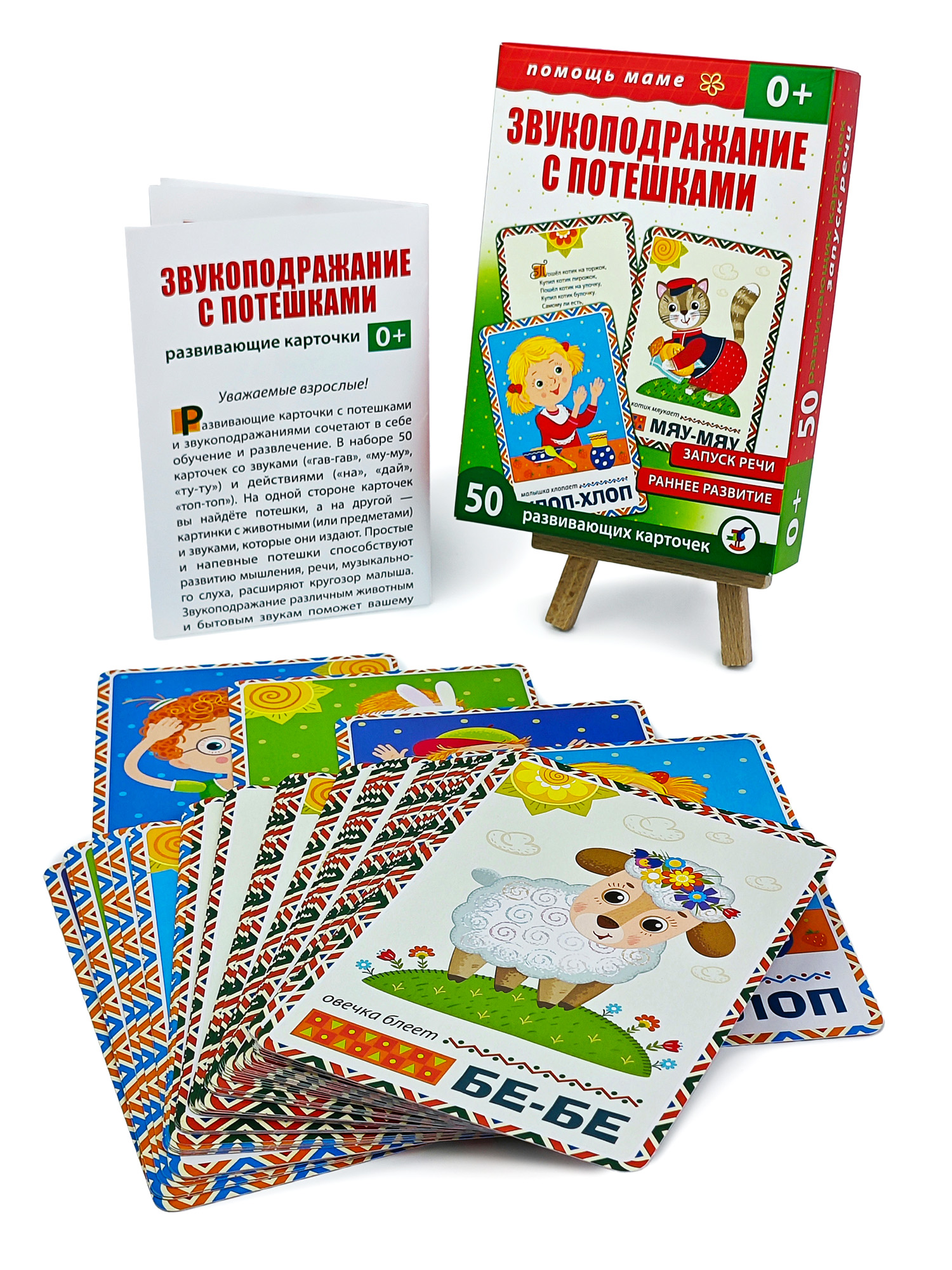 В наборе 50 карточек: с подражанием животным или предметам («гав-гав», «му-му», «ту-ту») и с действиями («на», «дай», «топ-топ»). Карточки двусторонние — на одной стороне дана иллюстрация и пример звукоподражания, а на другой — тематическая потешка. Мама может прочитать ребёнку потешку, а затем, перевернув карточку, показать животное, про которое была потешка, и побудить ребёнка повторить звуки, которые издаёт это животное. Подобные занятия помогут малышу начать говорить.