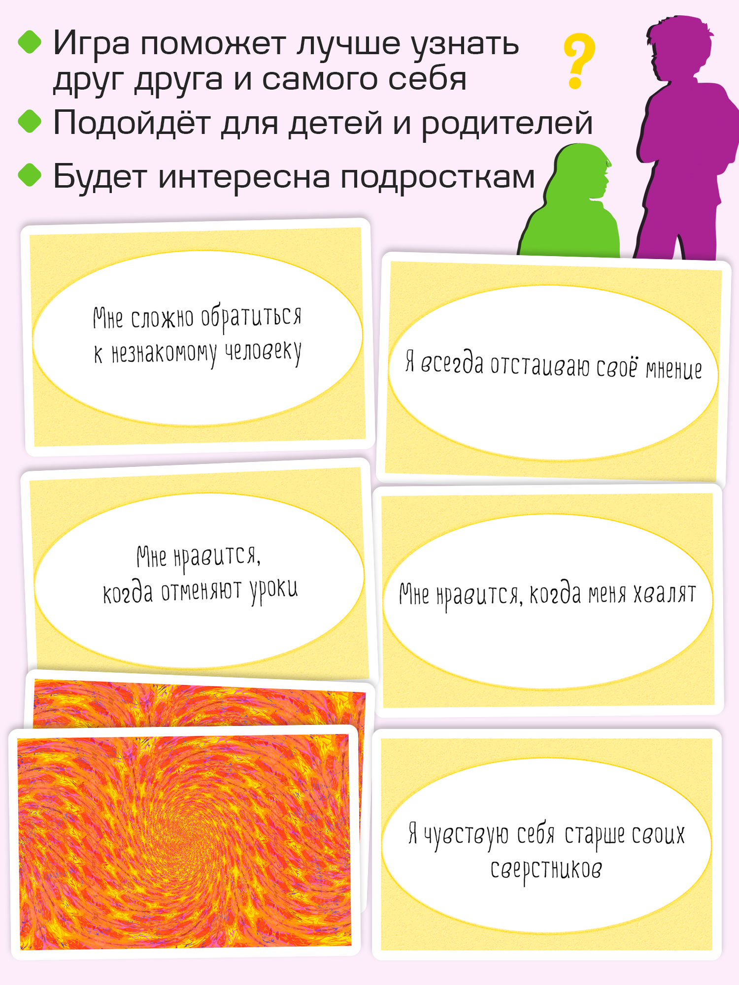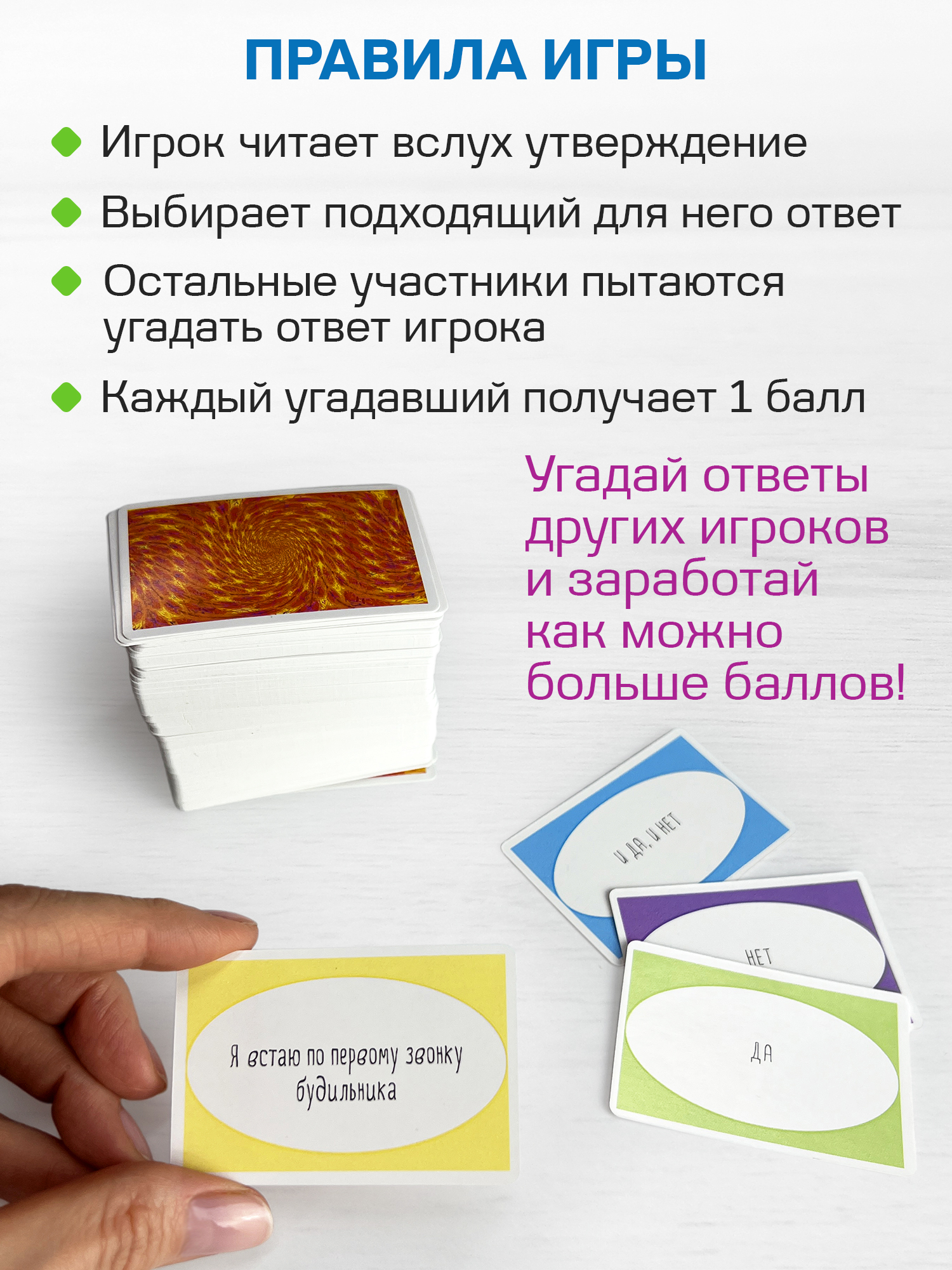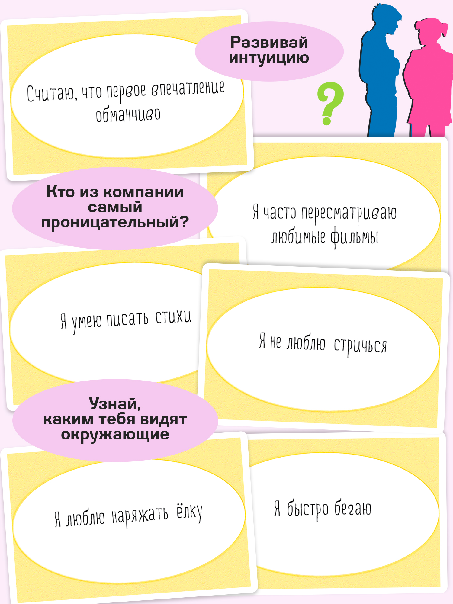 Вы хорошо знаете своих друзей и членов семьи? А может быть вообще, чувствуете людей и умеете читать мысли? Приготовьтесь удивиться и узнать друг друга и самих себя с новой стороны. Эта игра проверит наличие у вас шестого чувства и покажет, кто из компании самый проницательный. Отвечайте на вопросы, угадывайте ответы других игроков, получайте баллы и выигрывайте с помощью интуиции!