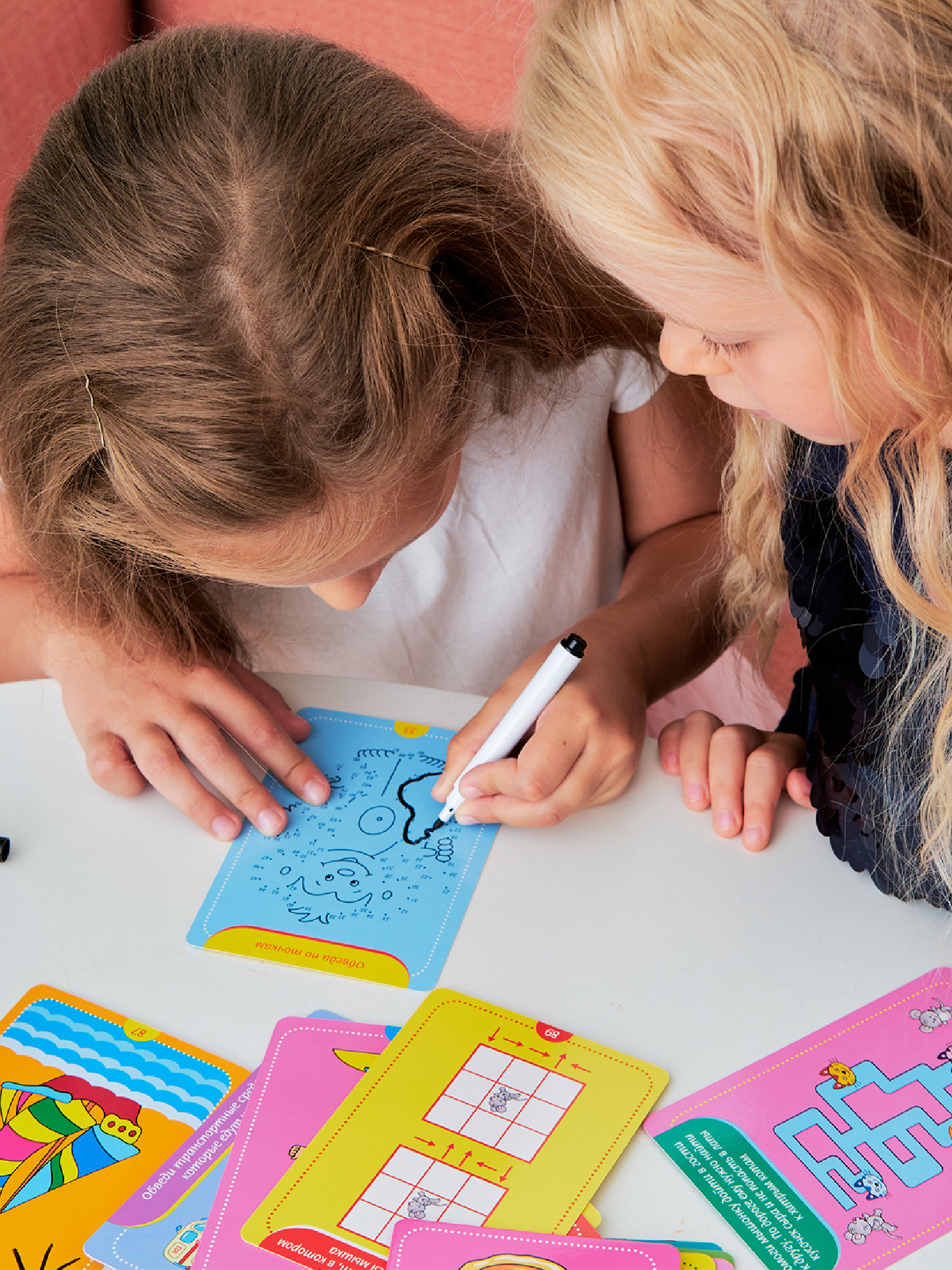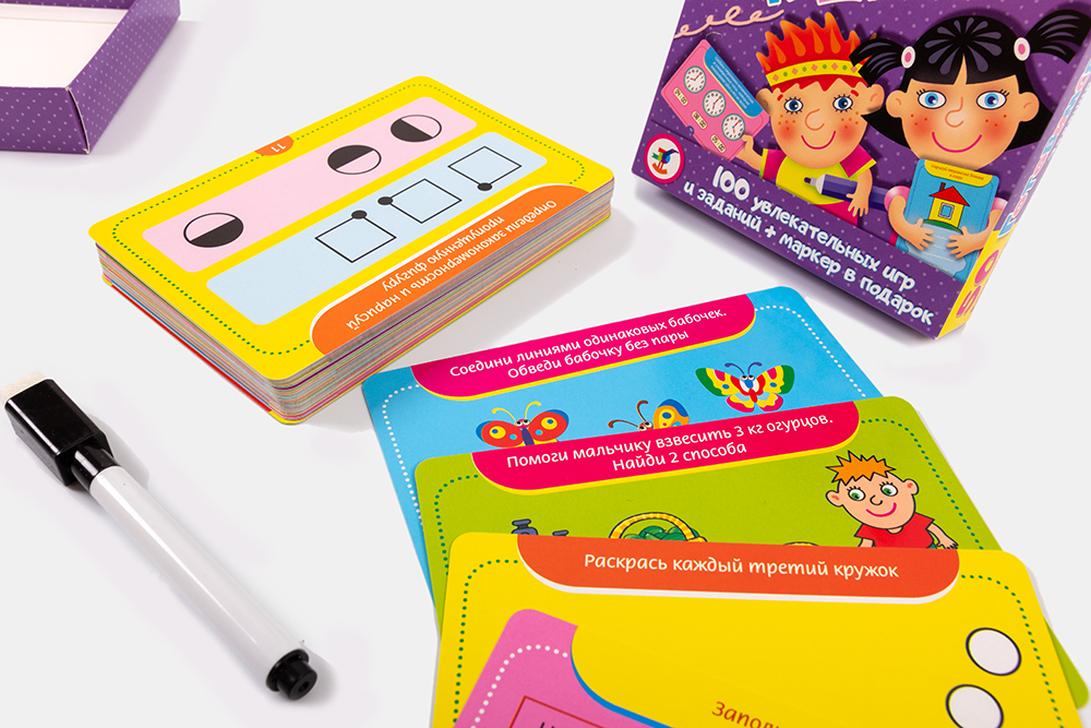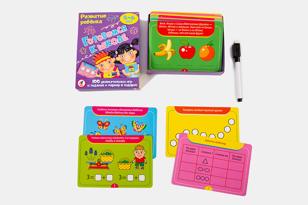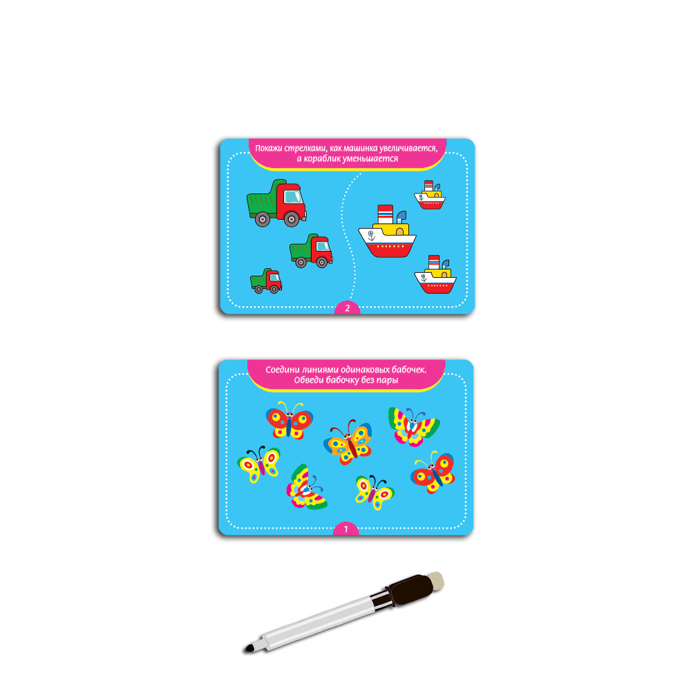 В наборе 50 двусторонних карточек с закруглёнными безопасными краями и смываемый фломастер.
