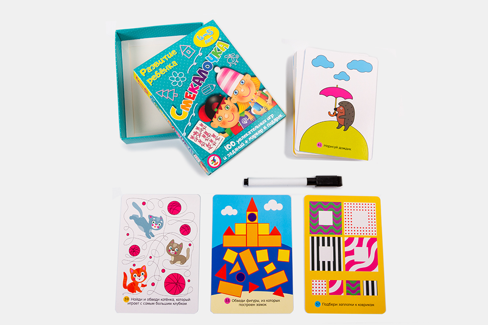 В наборе 50 двусторонних карточек с закруглёнными безопасными краями и смываемый фломастер.