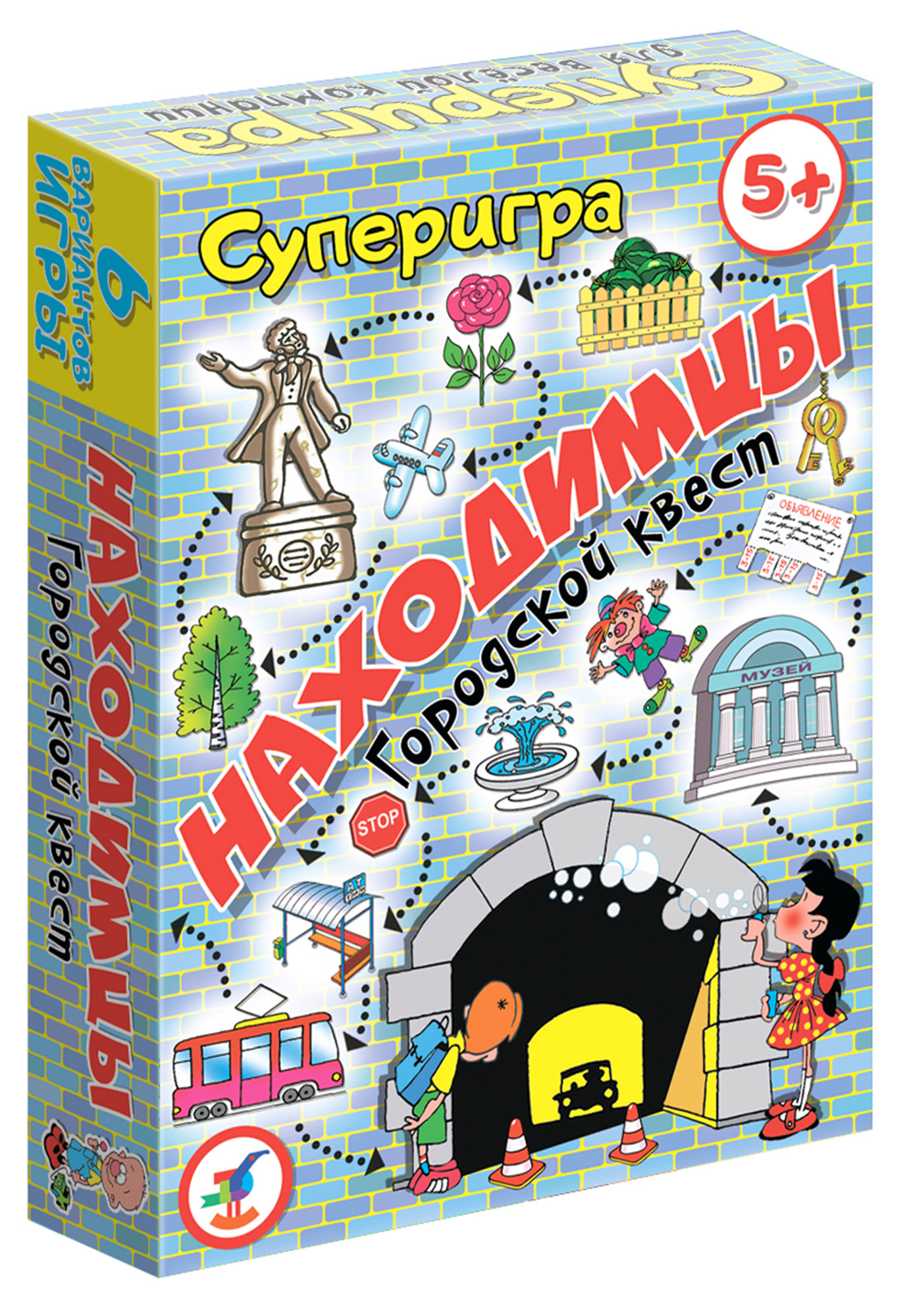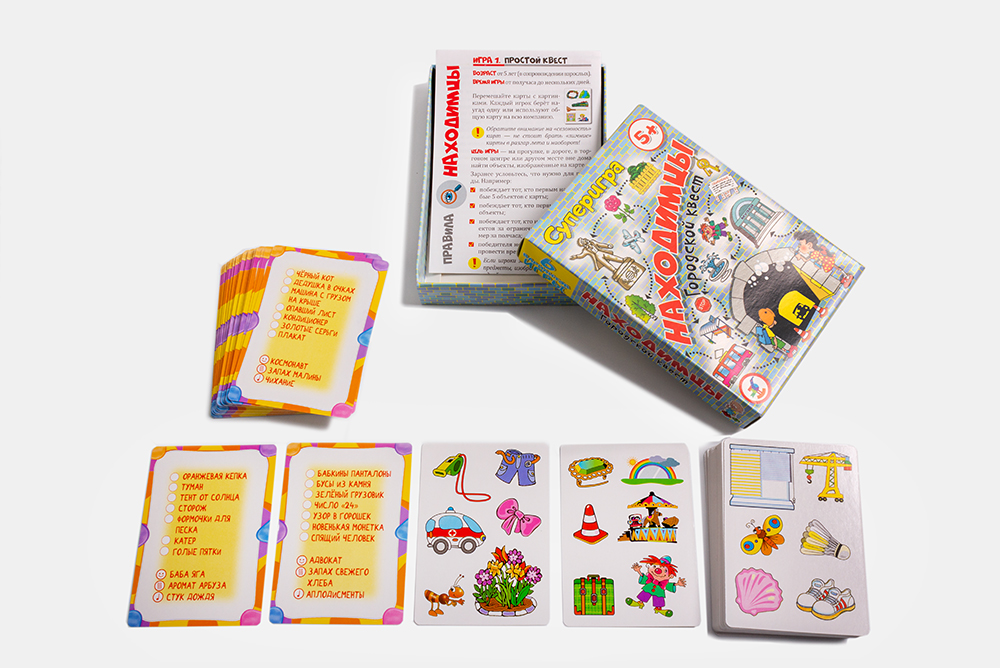 Перед вами городской квест. В коробочке 100 карт с заданиями по поиску предметов в городе и за его пределами (для малышей – карты с картинками, для игроков постарше – текстовые). В правилах описаны 5 вариантов проведения игры.
