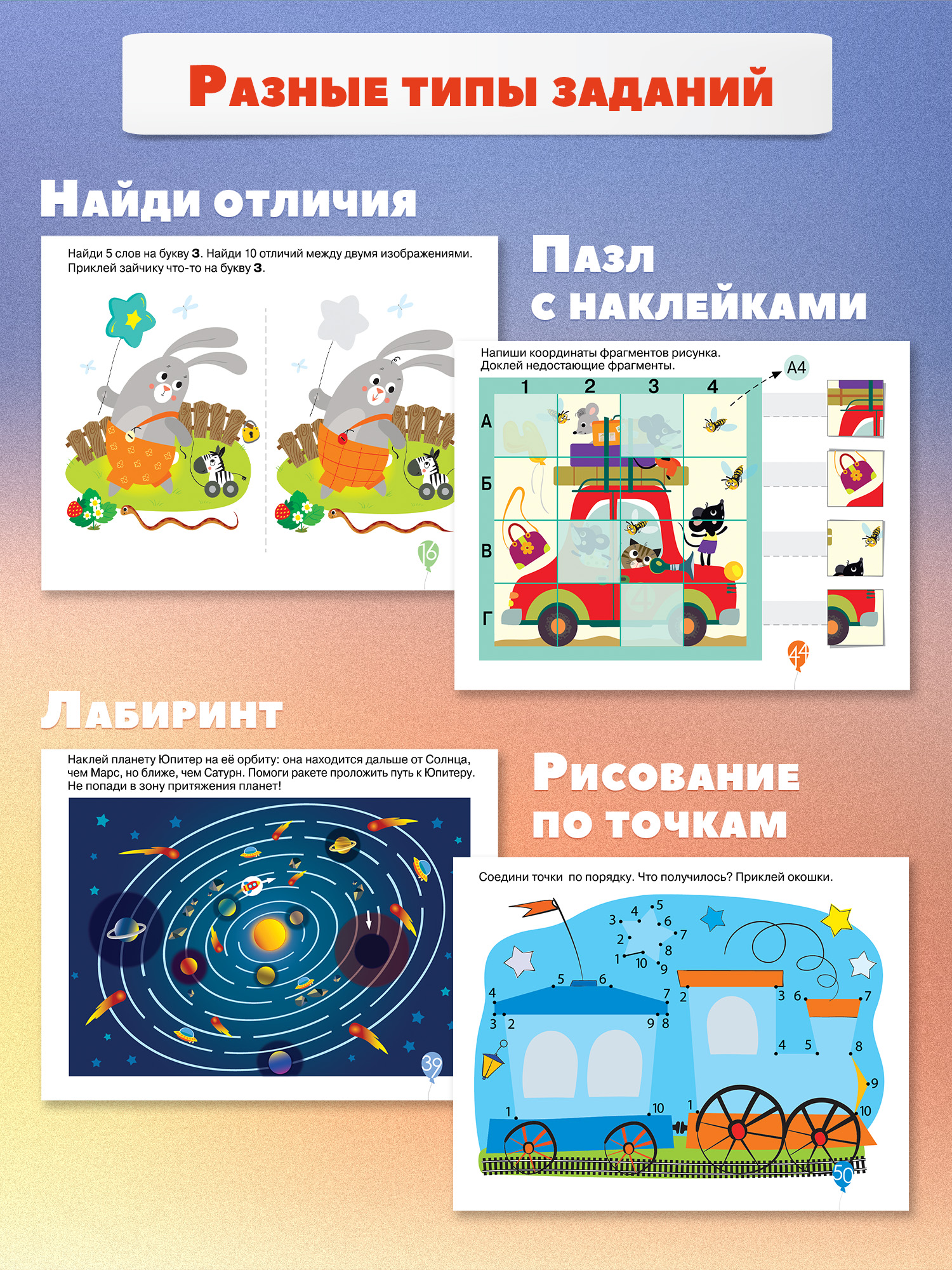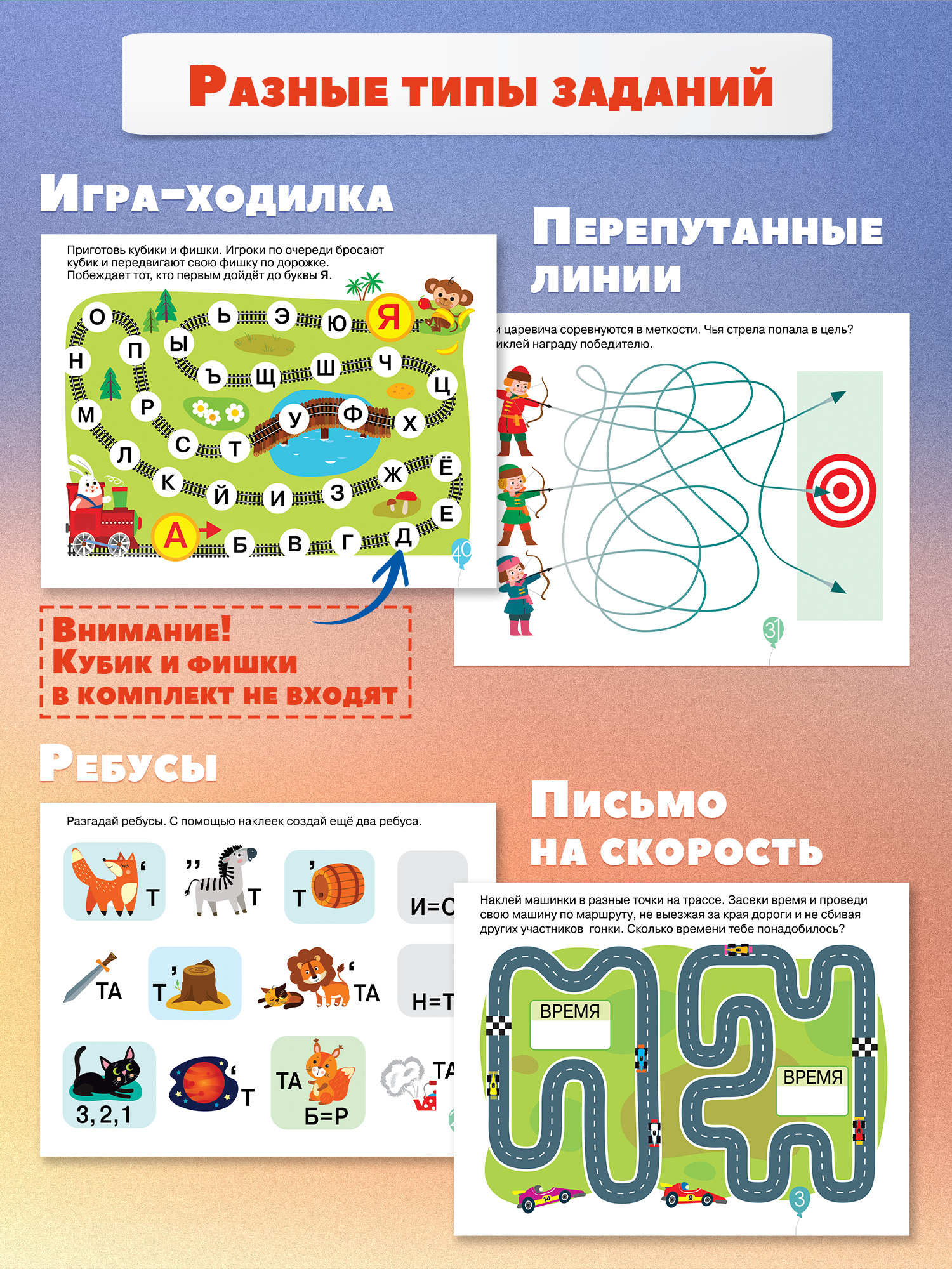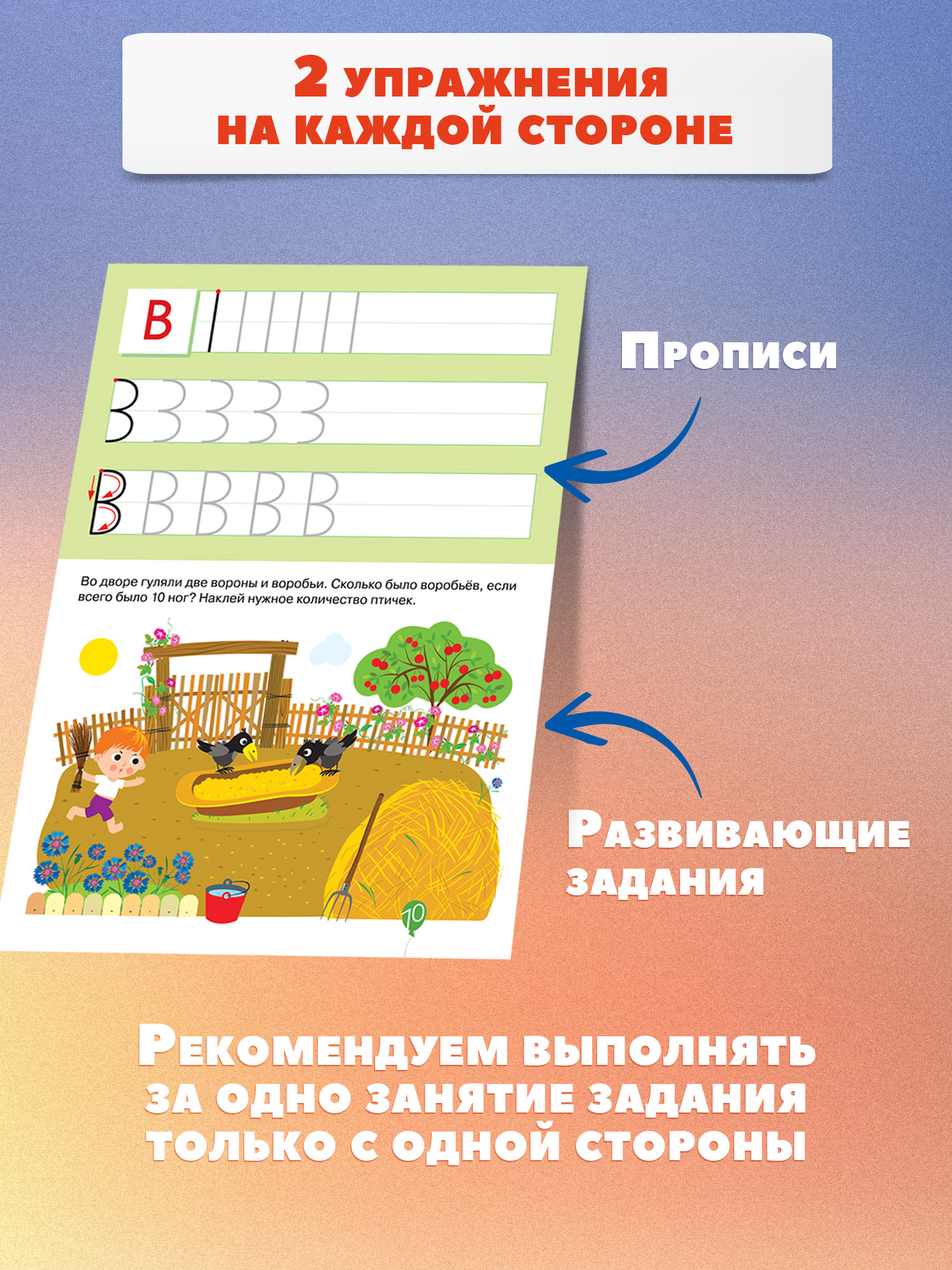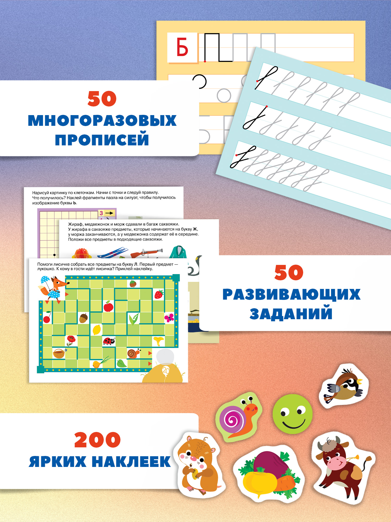 На каждой страничке – прописи и занимательное задание с наклейками (всего 50 заданий). Ребусы, лабиринты, перепутанные линии, найди отличия и даже мини игра-ходилка с алфавитом. Учиться весело!