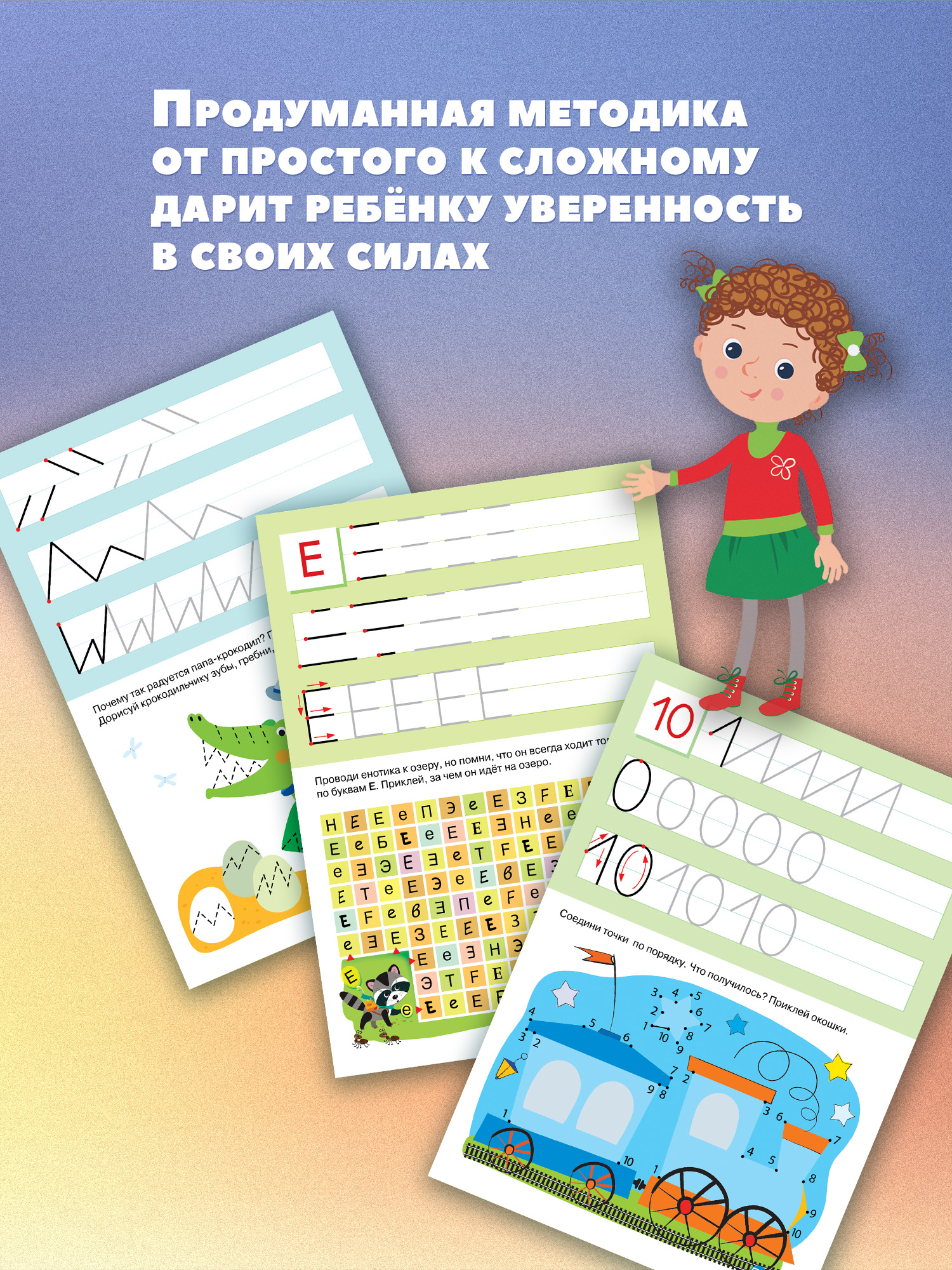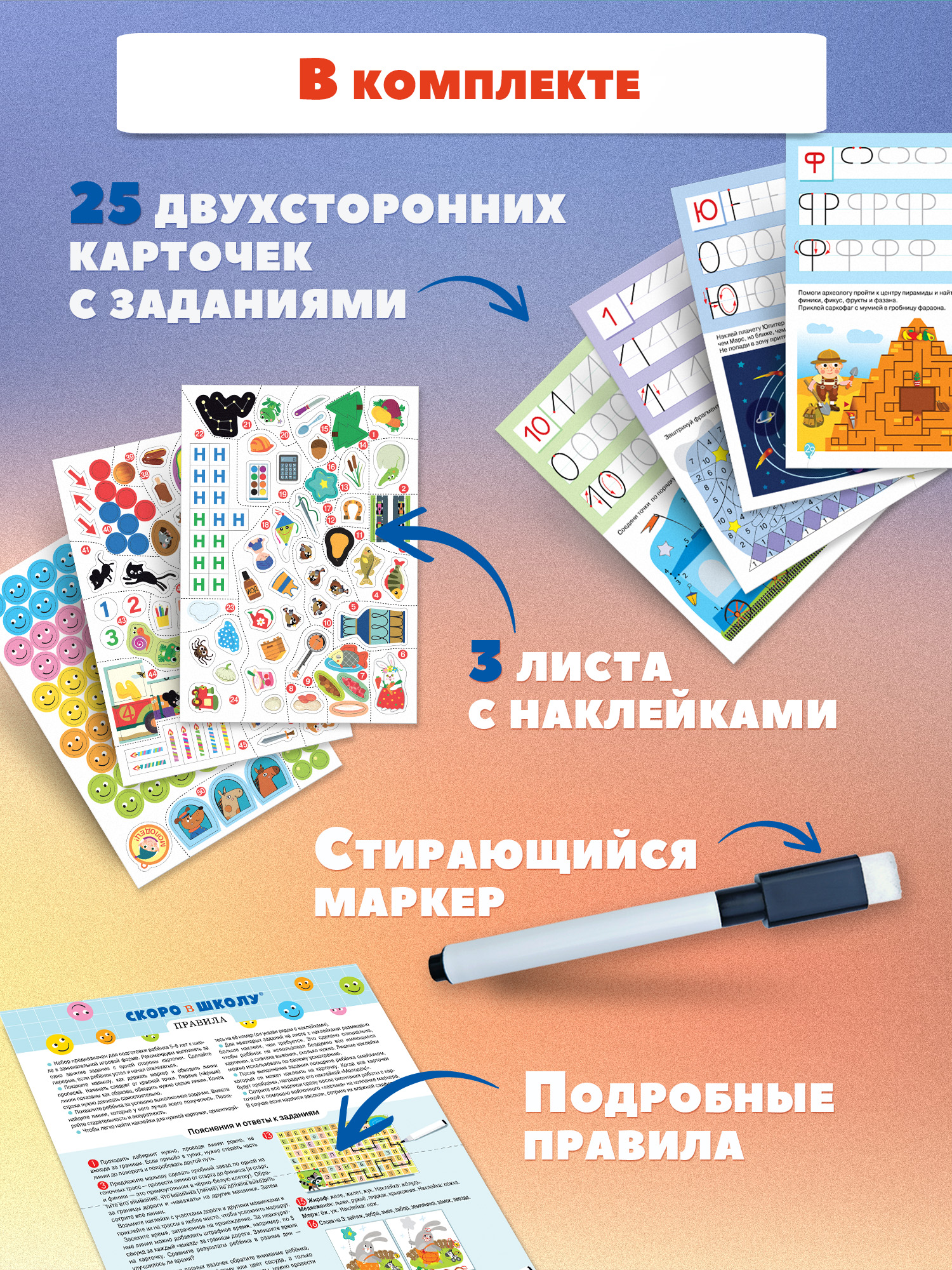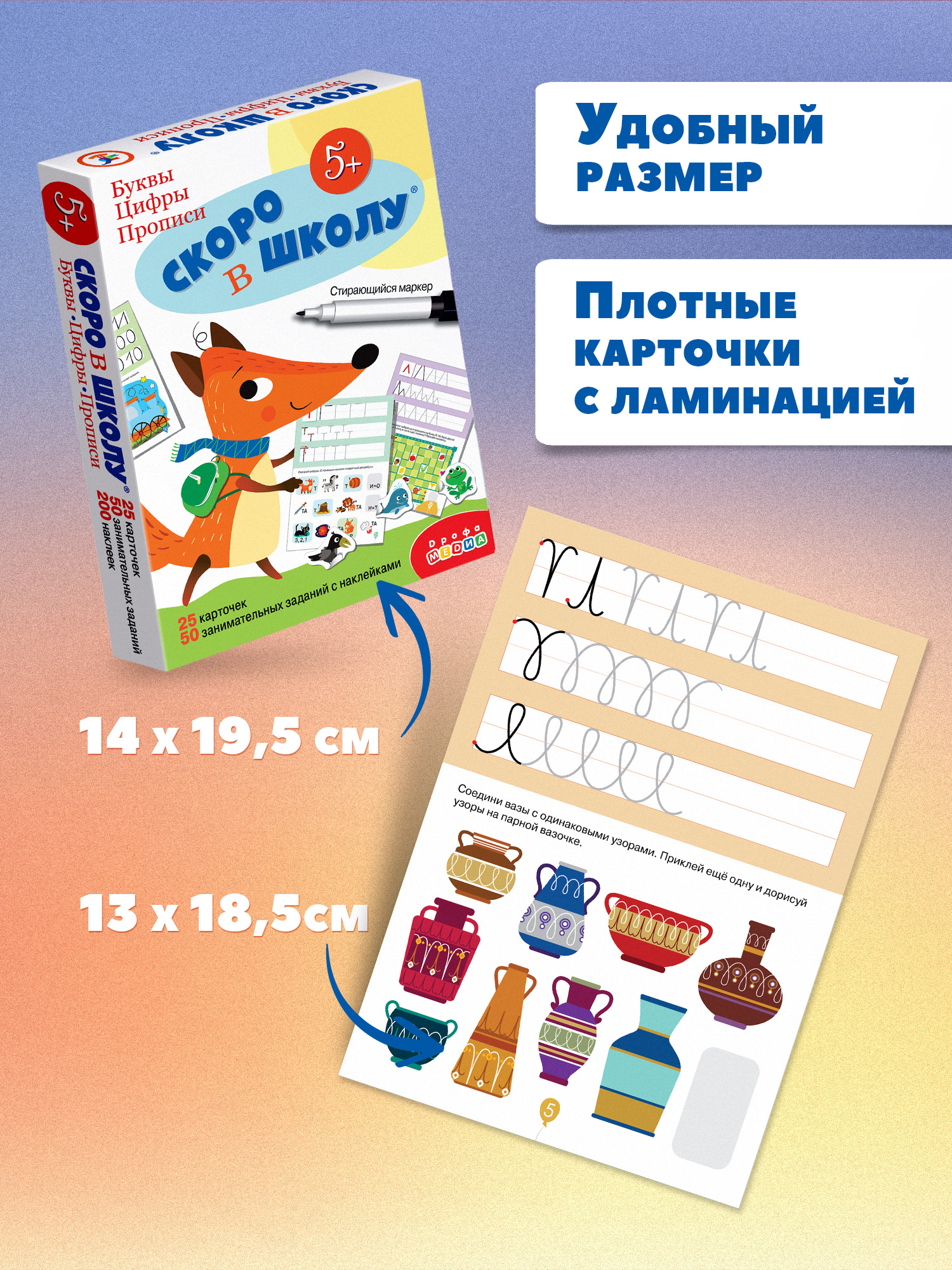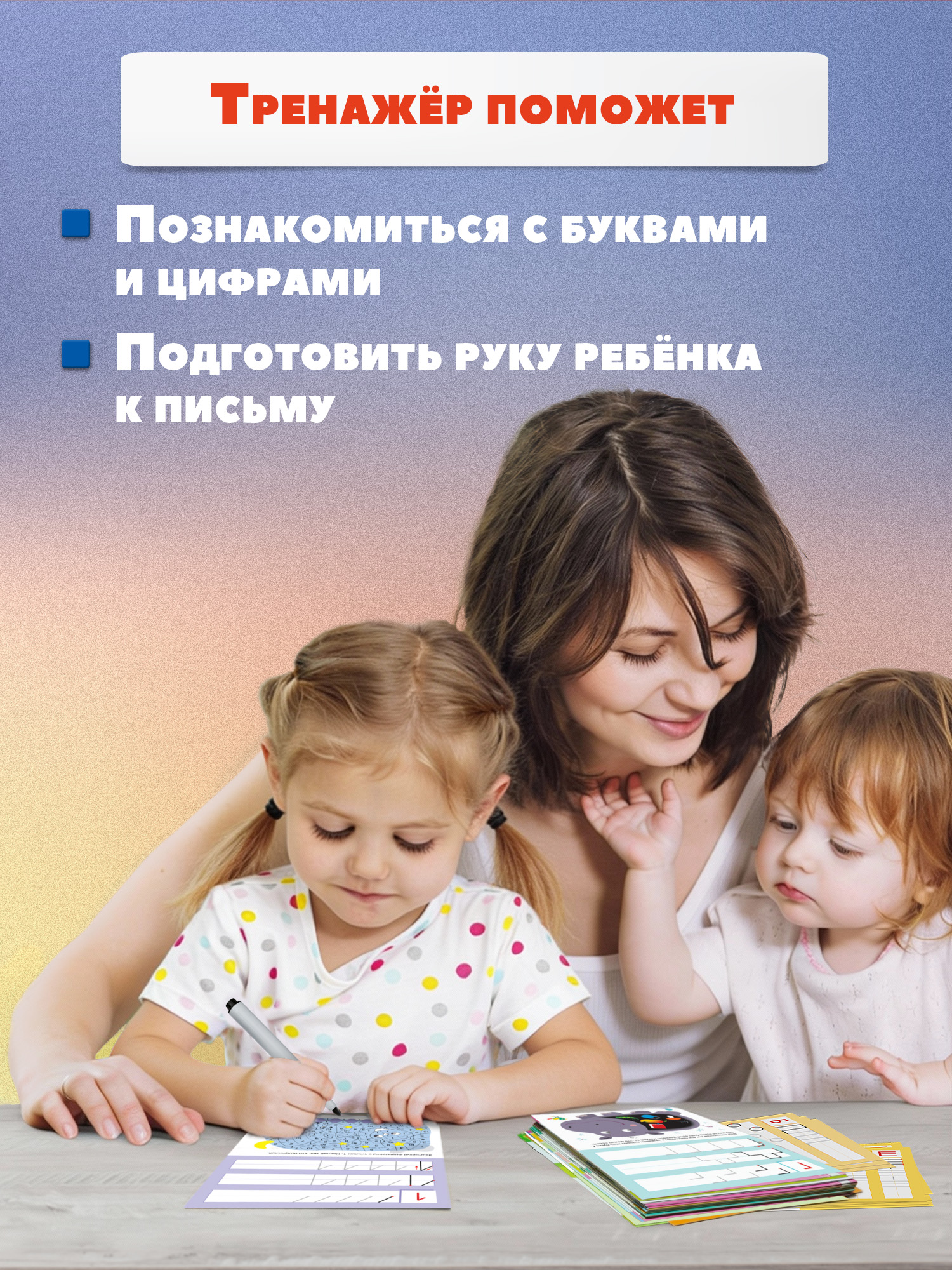 Занимательная игра-тренажёр для будущих первоклассников. В наборе вы найдёте всё, что необходимо при подготовке к школе.