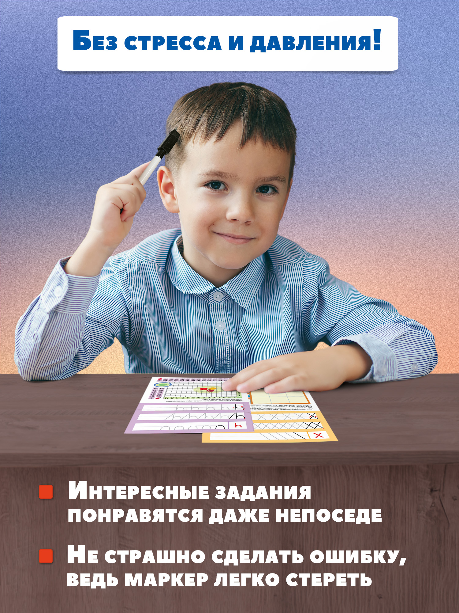 Многоразовые прописи (линии, узоры, печатные буквы, цифры и их элементы). В комплекте стирающийся маркер на водной основе.