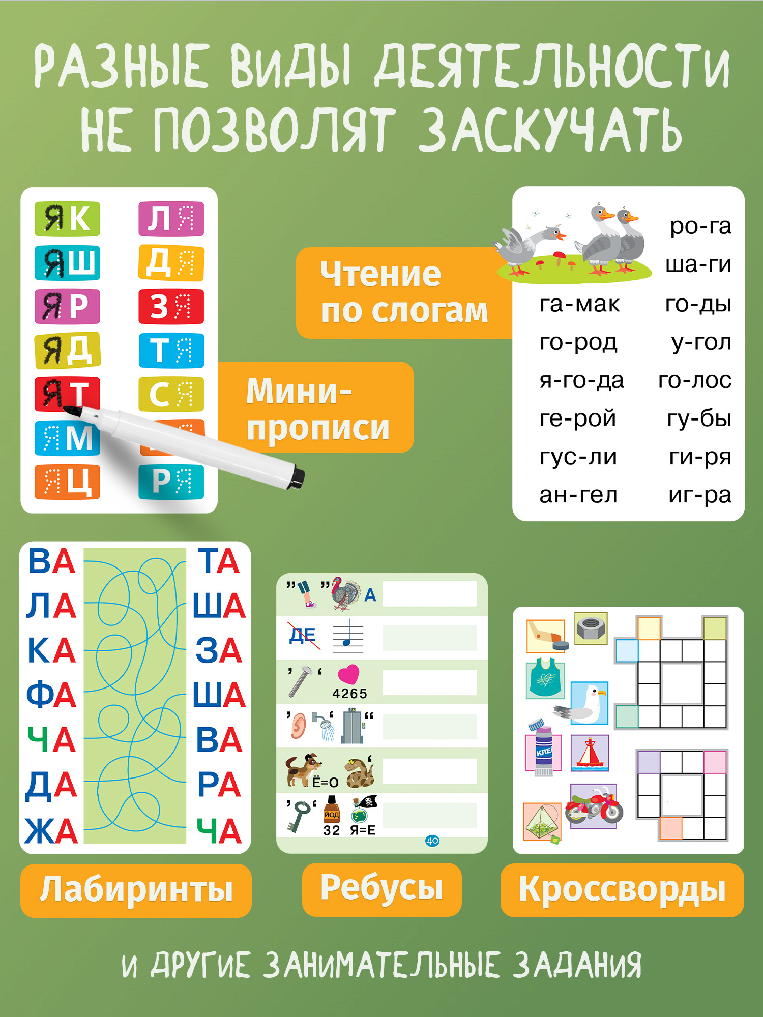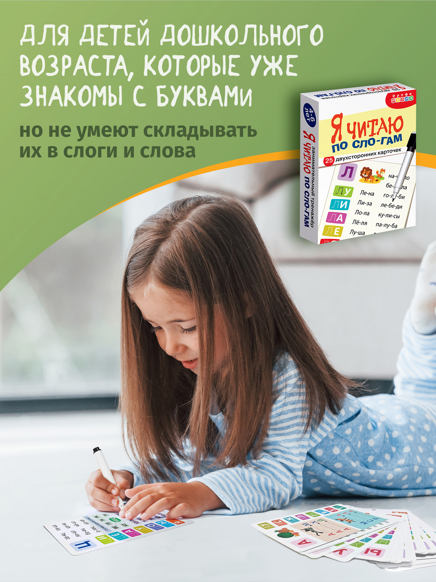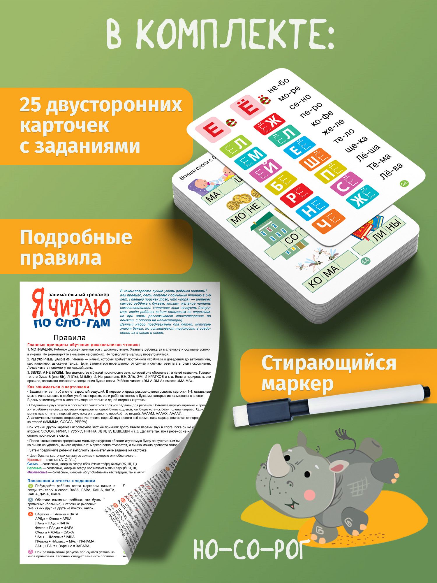 Каждая карточка посвящена одной из букв (простые слова для чтения, разделенные на слоги; мини-пропись; занимательное задание с маркером).