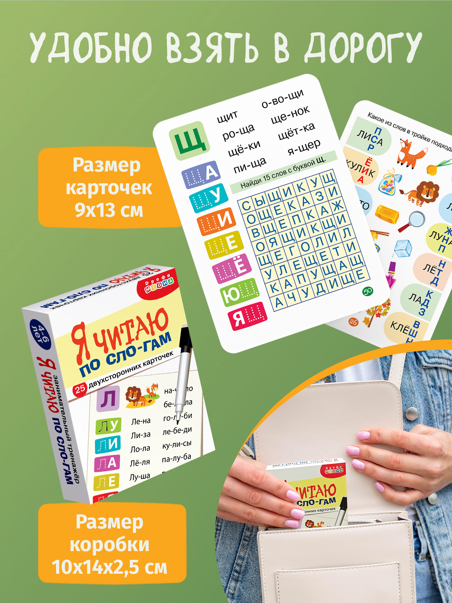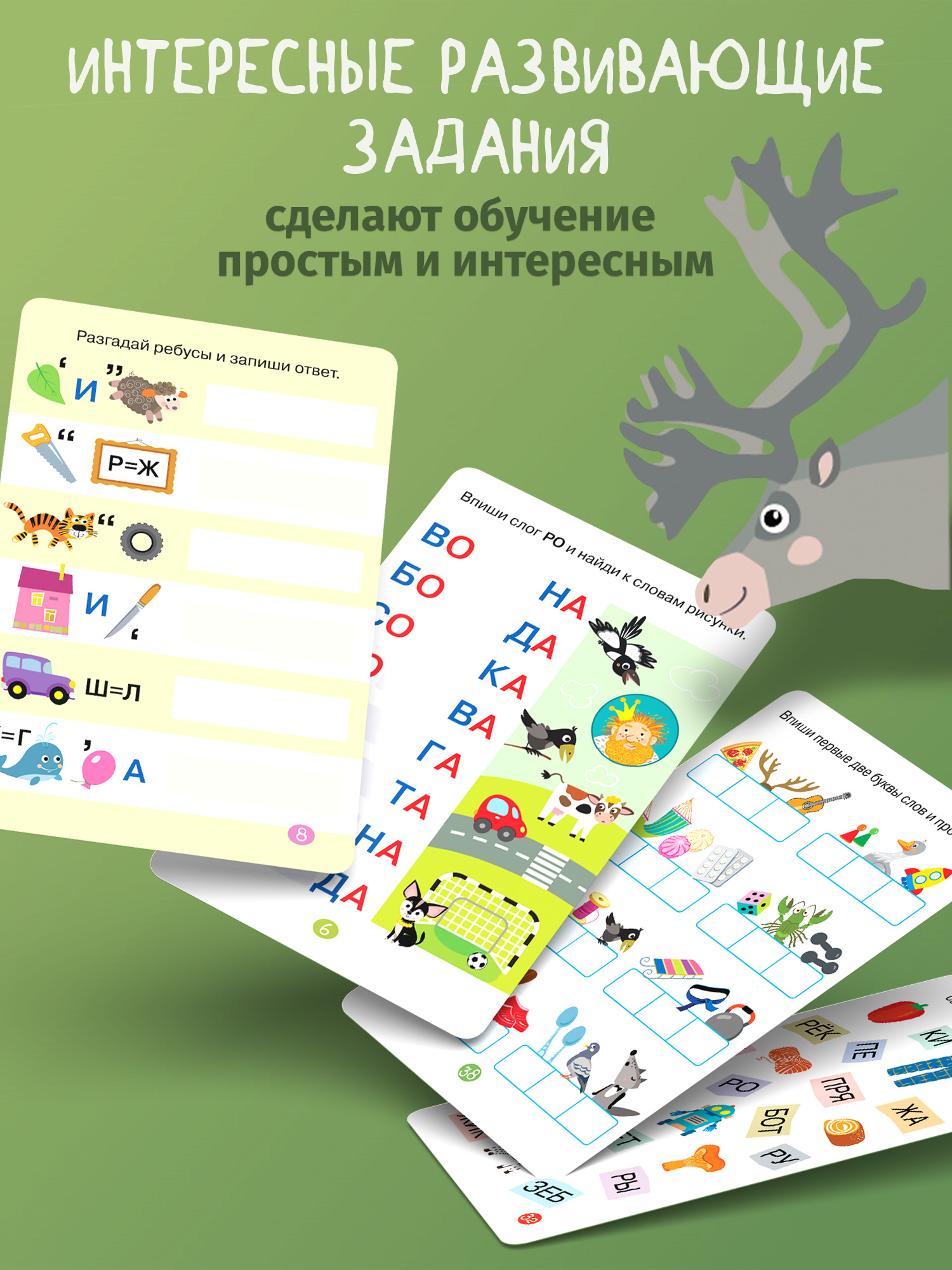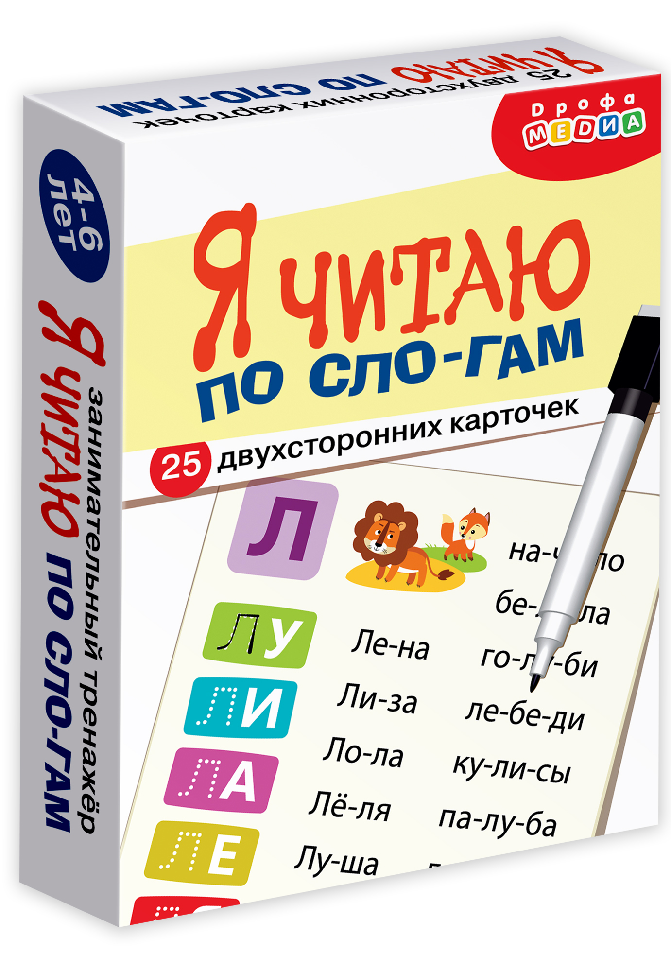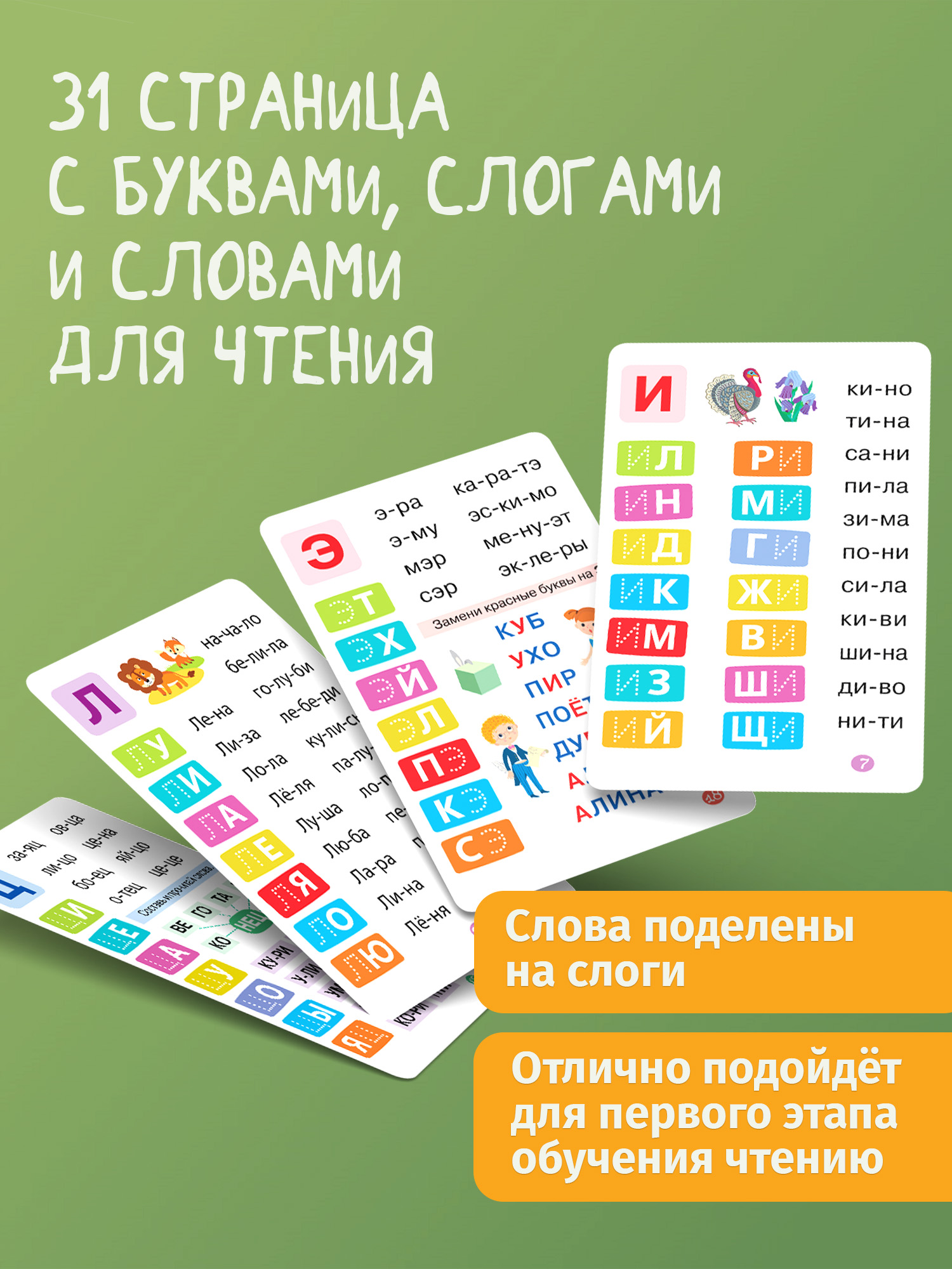 Каждая карточка посвящена одной из букв (простые слова для чтения, разделенные на слоги; мини-пропись; занимательное задание с маркером).