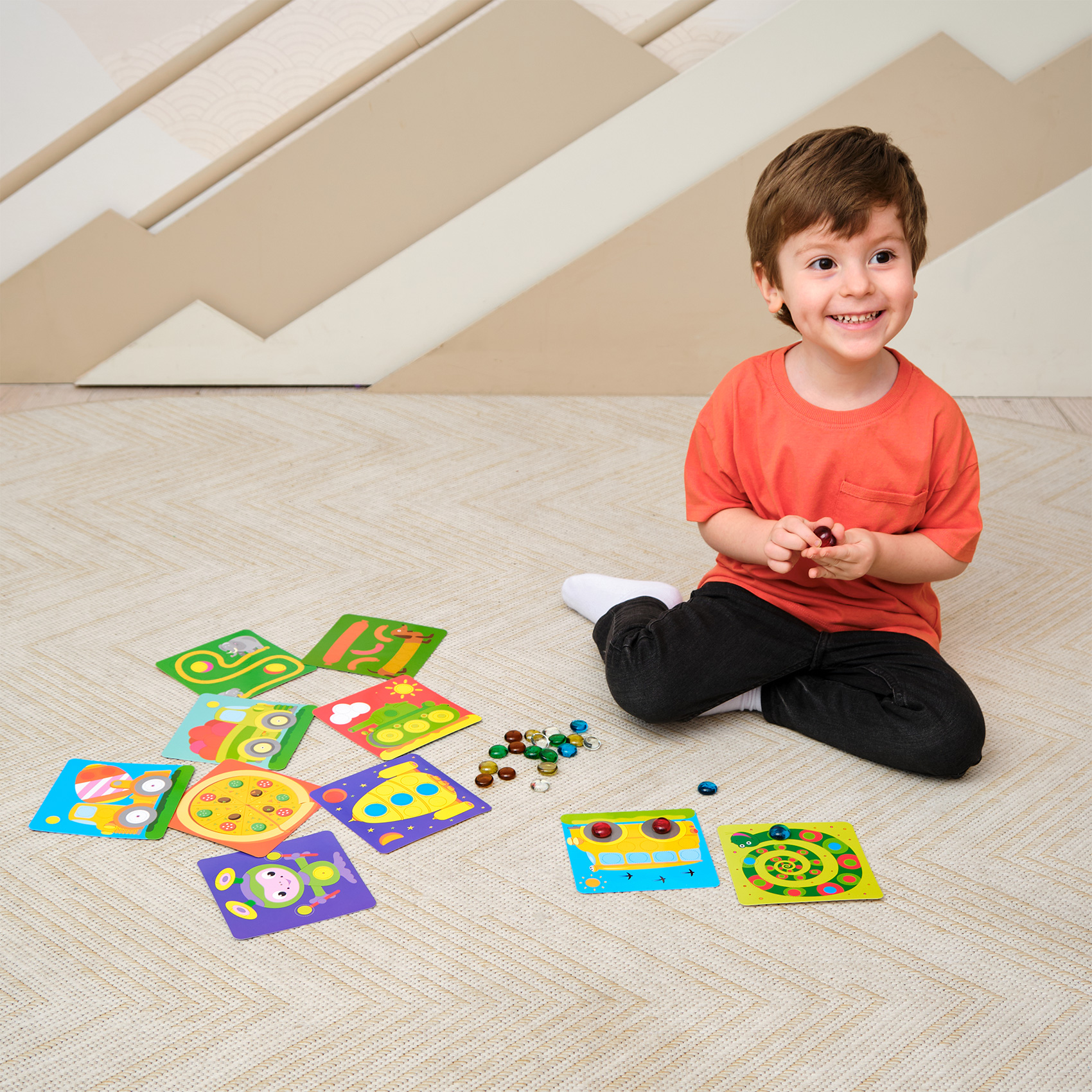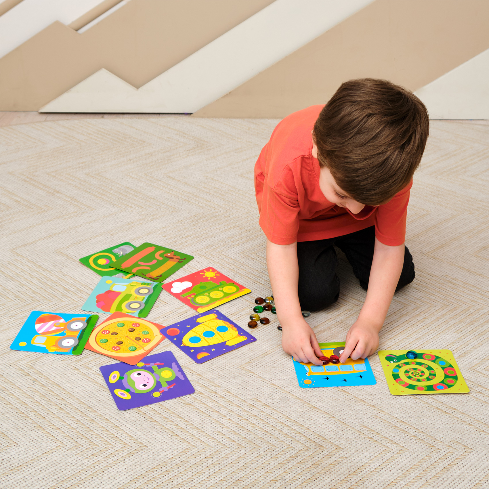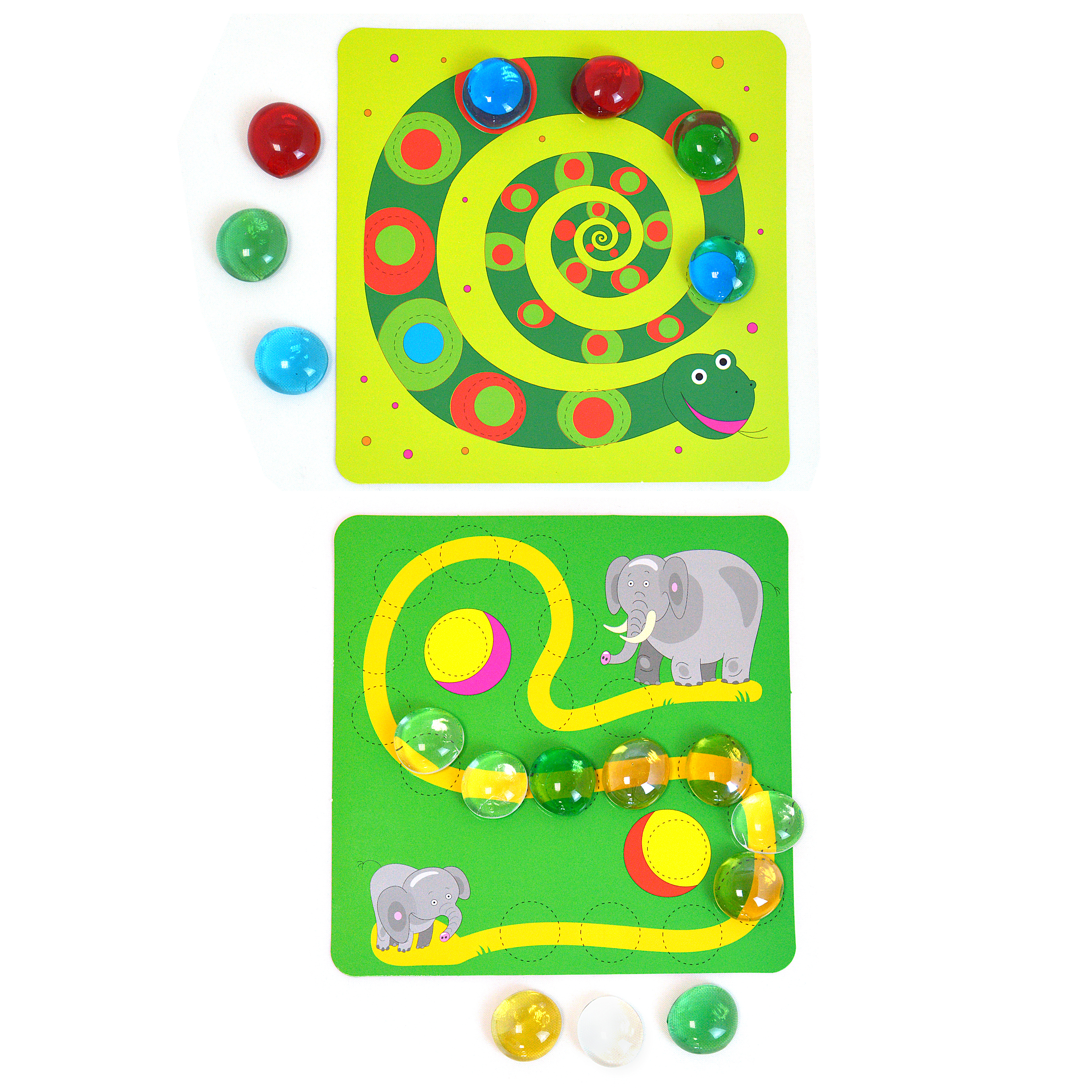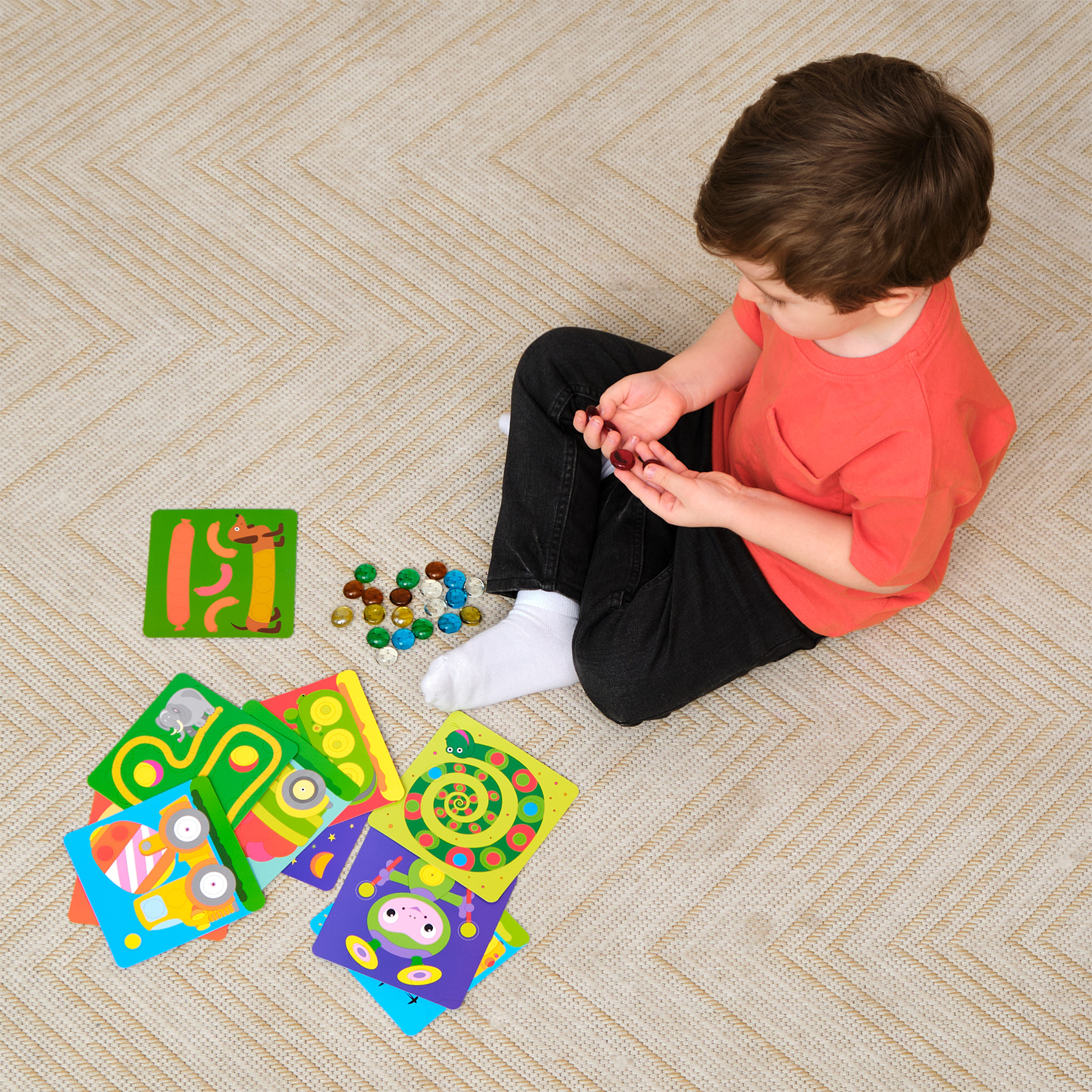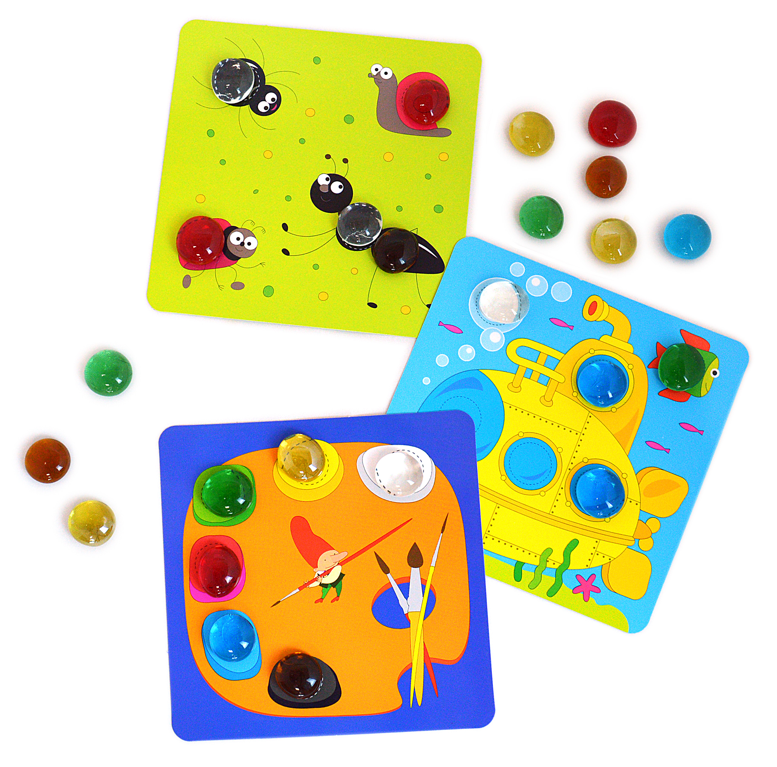 В коробке вы найдёте камешки шести цветов и карточки с яркими детскими рисунками. Задание понятно ребёнку интуитивно - нужно дополнить картинки. Есть карточки, на которых цвет камешков «подсказан», и те, которые нужно украсить на своё усмотрение.