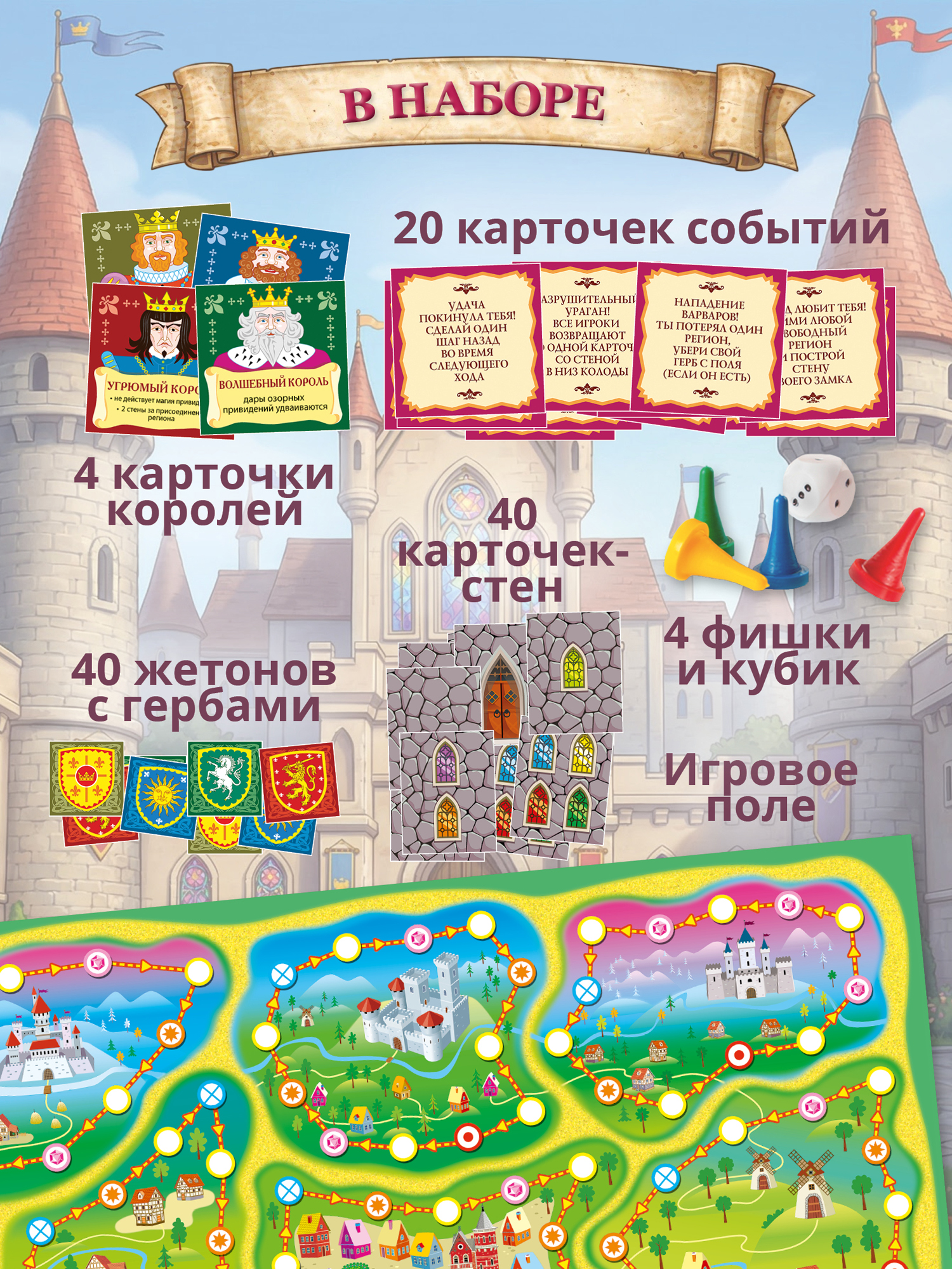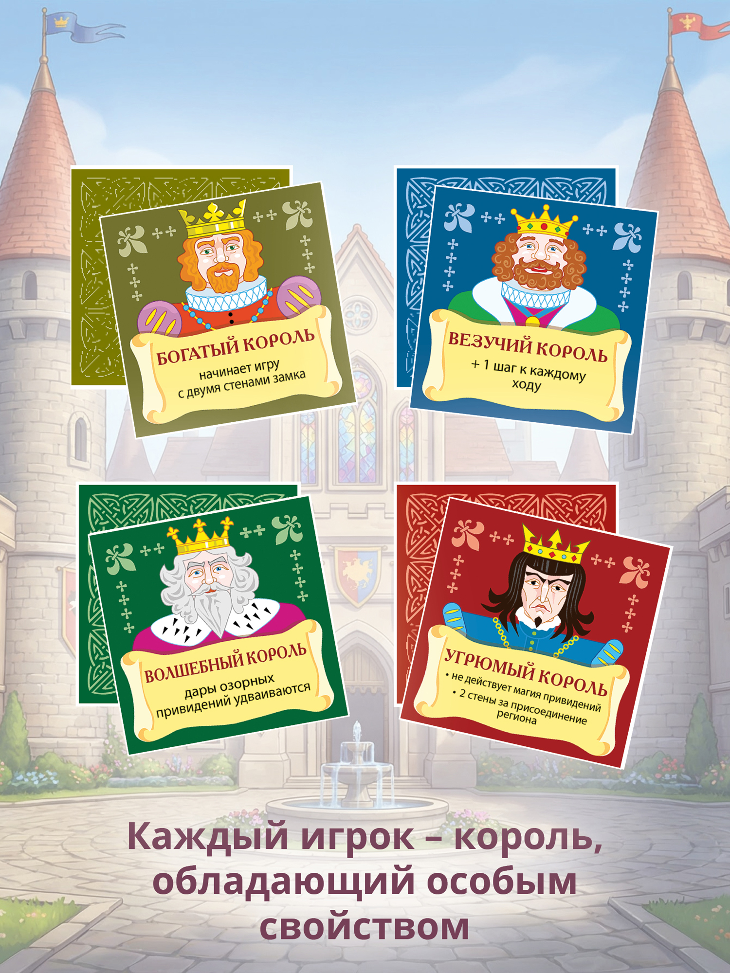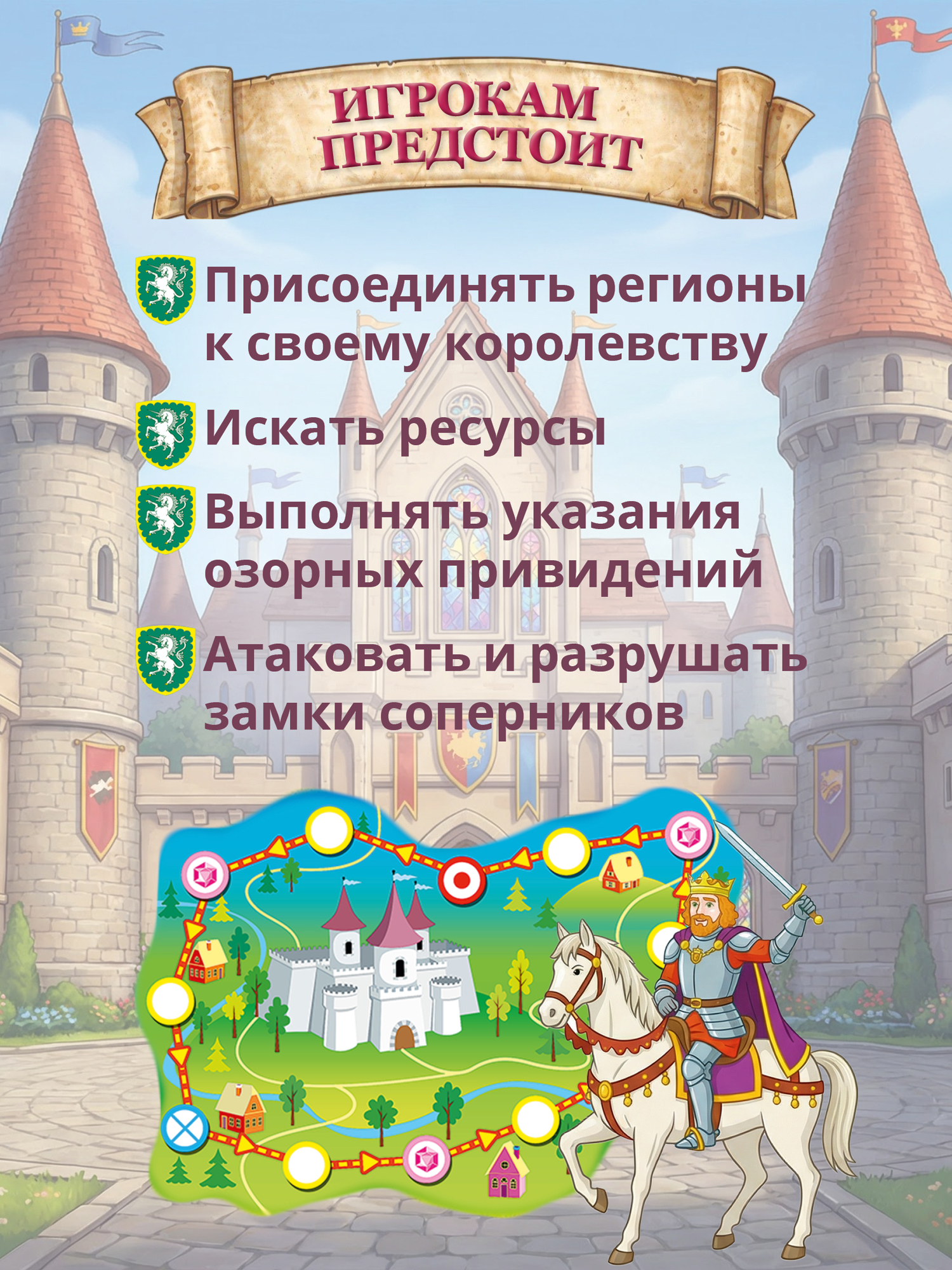 Настольная игра для детей «Короли и замки» – это увлекательная игра ходилка, во время которой игрокам нужно построить королевский замок быстрее, чем соперники. Для этого нужно будет присоединять к своему королевству разные регионы, искать ресурсы и выполнять указания озорных привидений. Привидения могут помочь, а могут и навредить, недаром они озорные. Кроме того, каждый король обладает своим особым свойством, которое здорово повышает шансы на выигрыш. А ещё, можно атаковать и разрушать замки соперников!