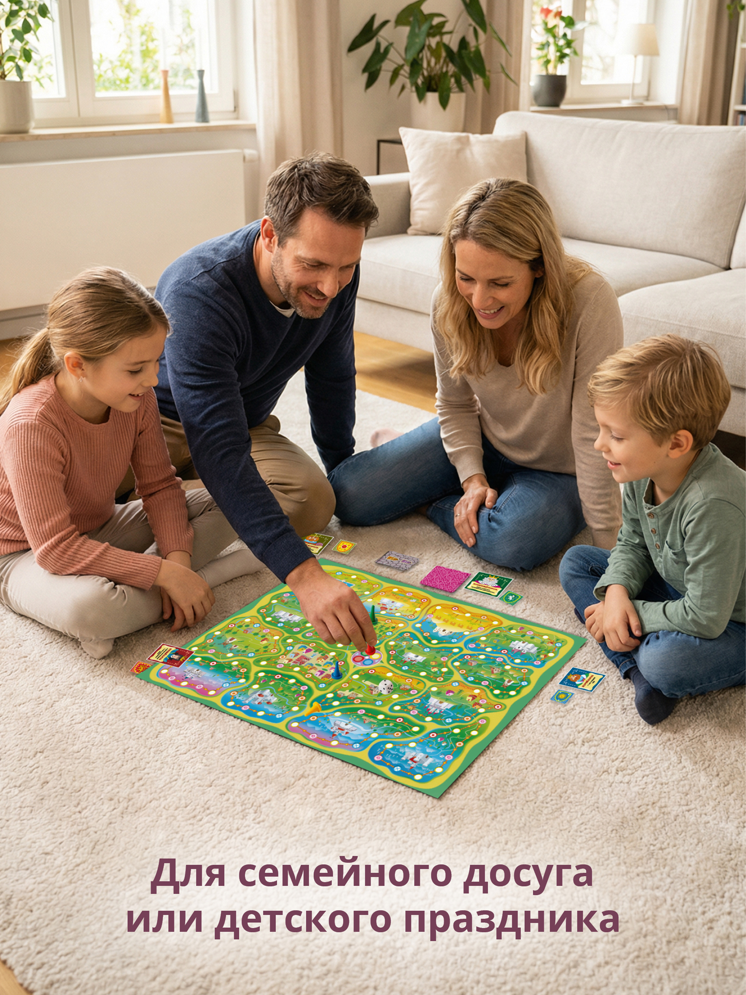 Ходилка для детей отлично подойдет для семейного досуга и будет незаменима на любом детском празднике. Семейная бродилка с карточками, фишками и кубиком развивает стратегическое мышление, командный дух и умение играть по правилам.