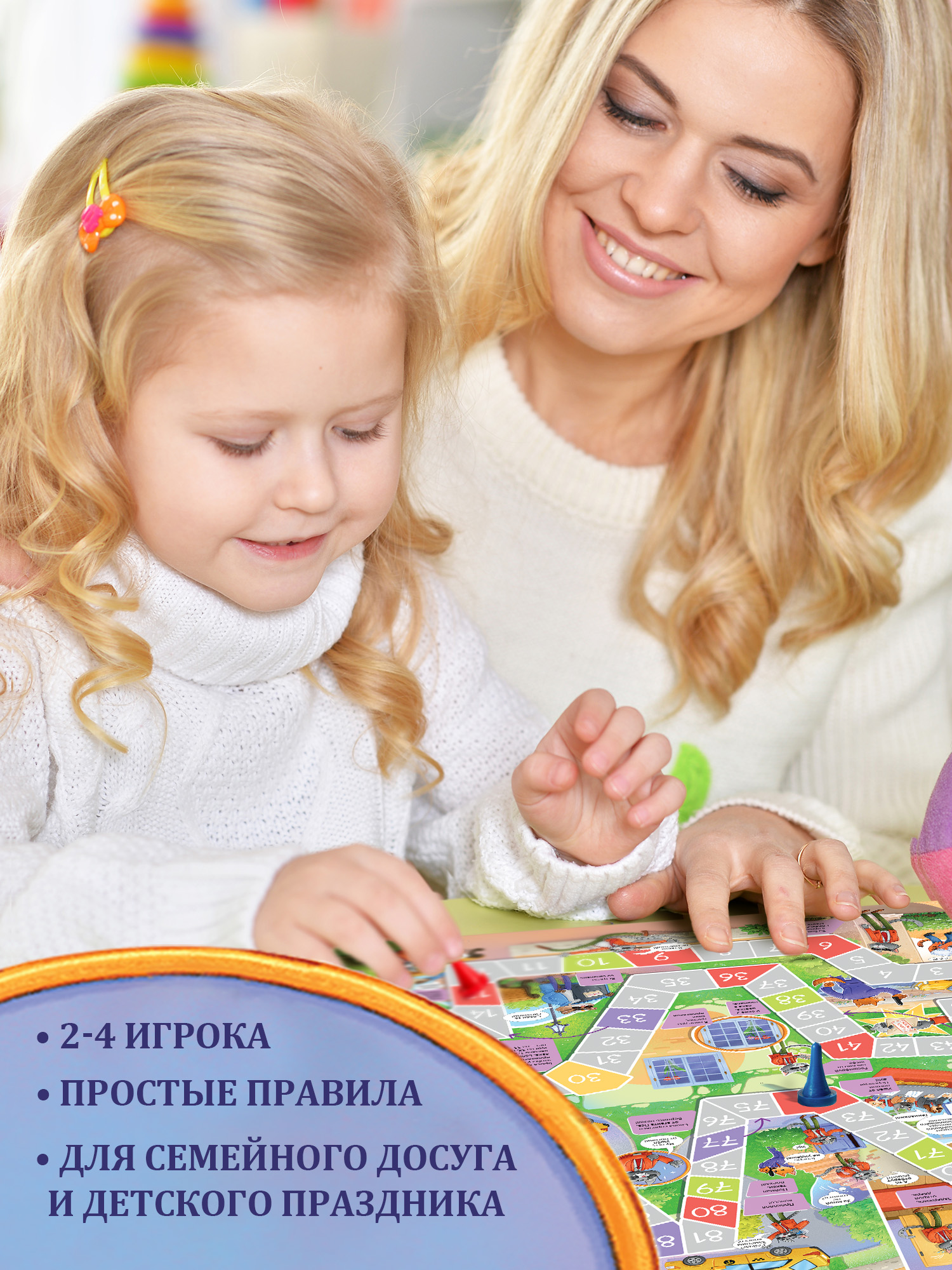В наборе: игровое поле, кубик и 4 фишки.