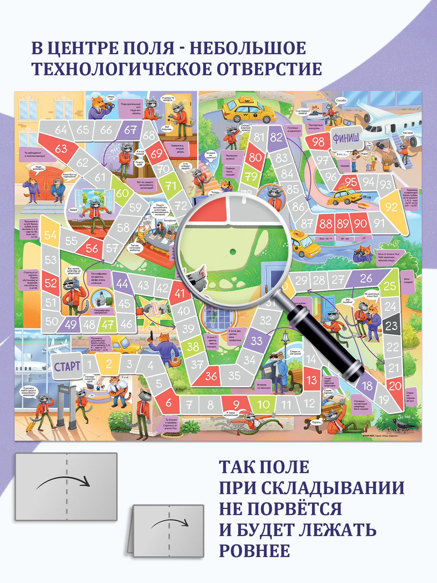 В центре игрового поля на сгибе есть небольшое технологическое отверстие, это сделано специально, чтобы поле не рвалось при складывании и лежало ровнее.