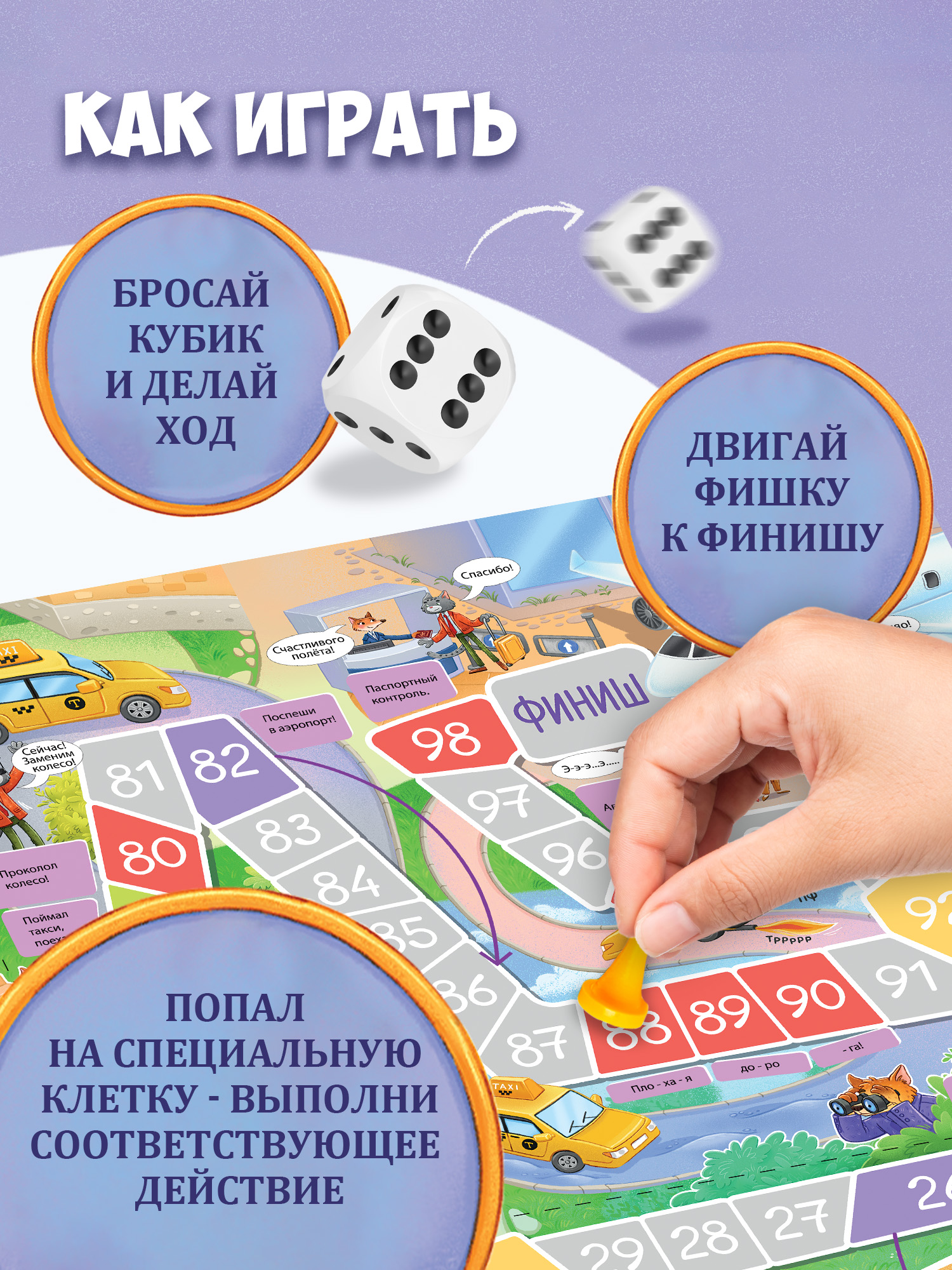 Передвигаться по игровому полю нужно будет с помощью фишек и кубика. Бросив кубик, игроки делают столько ходов по игровому полю, сколько очков выпало на кубике. Если фишка остановилась на специальной клетке, выполняют соответствующее действие. Выиграет тот, кто первым доберётся до финиша.