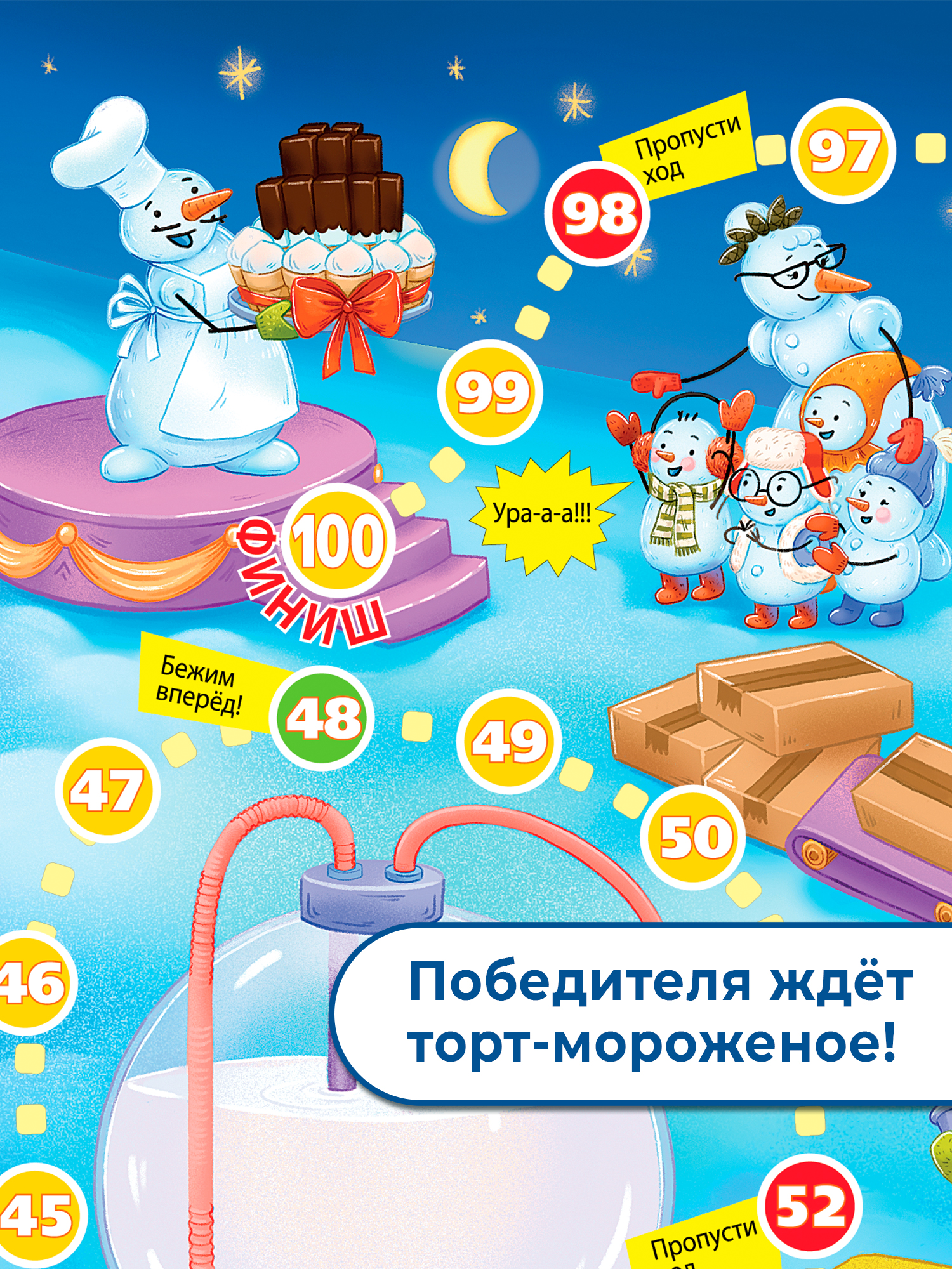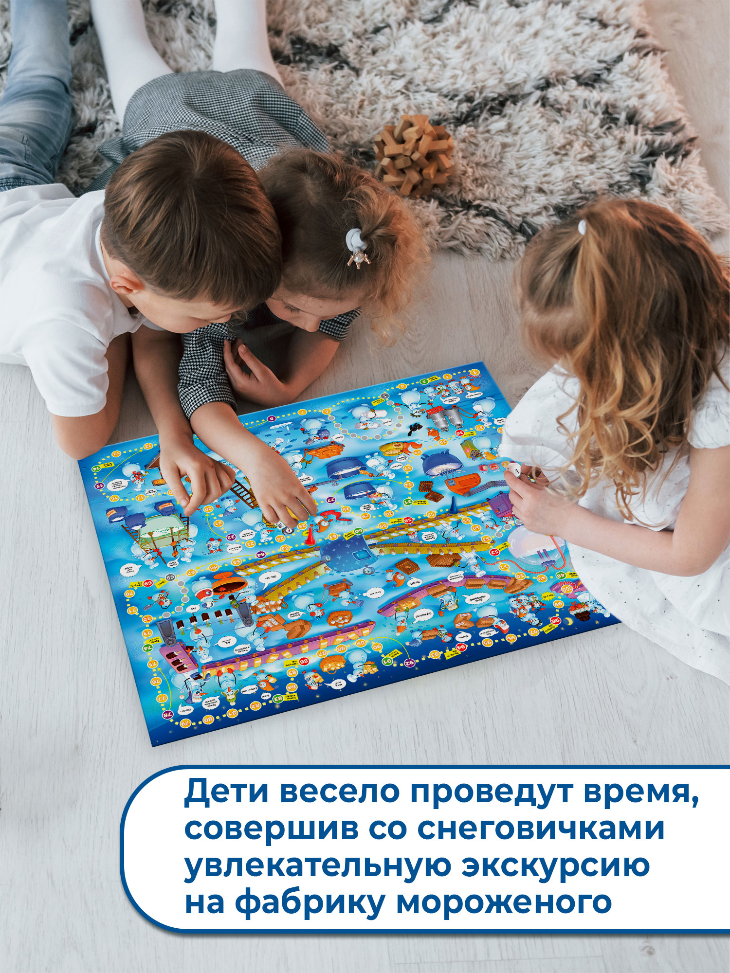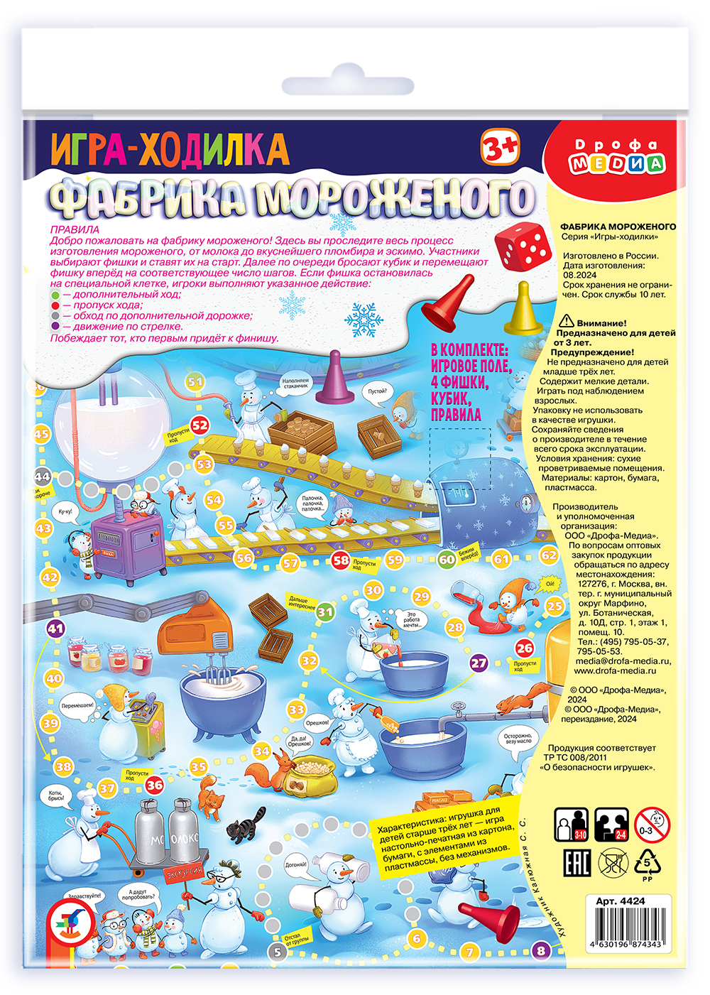 Традиционные игры-ходилки с кубиком и фишками («кинь-двинь») направлены на развитие эмоций, а также умения общаться и играть по правилам. Герои этой яркой игры – маленькие снеговички, которые пришли на фабрику, чтобы узнать, как делают мороженое. Отправляйтесь на экскурсию вместе с ними и проследите весь путь мороженого от молока и сливок до пломбира и эскимо!