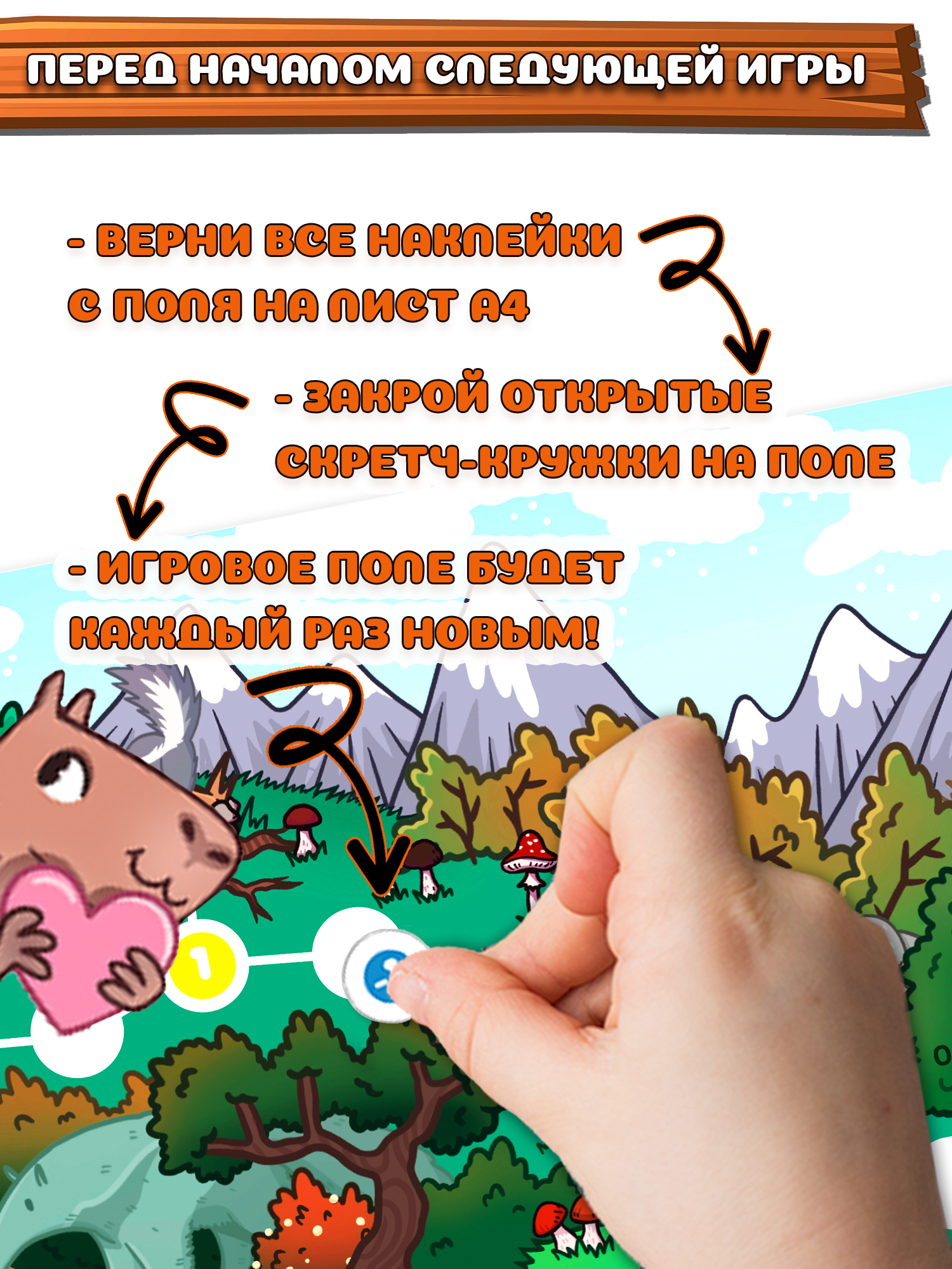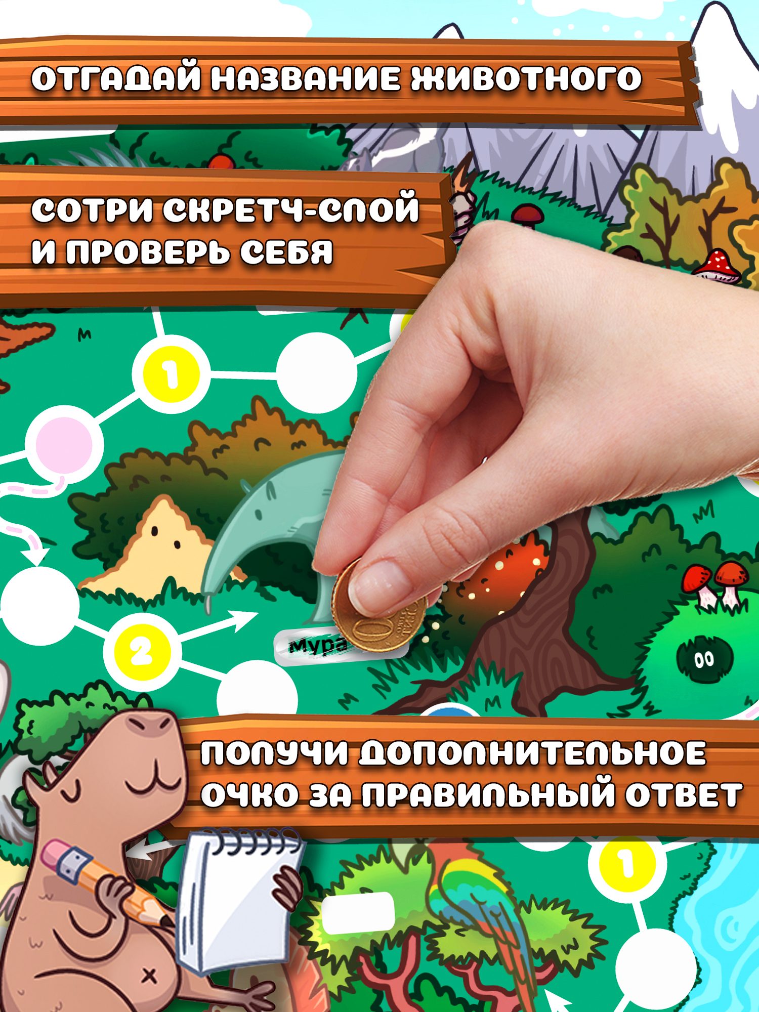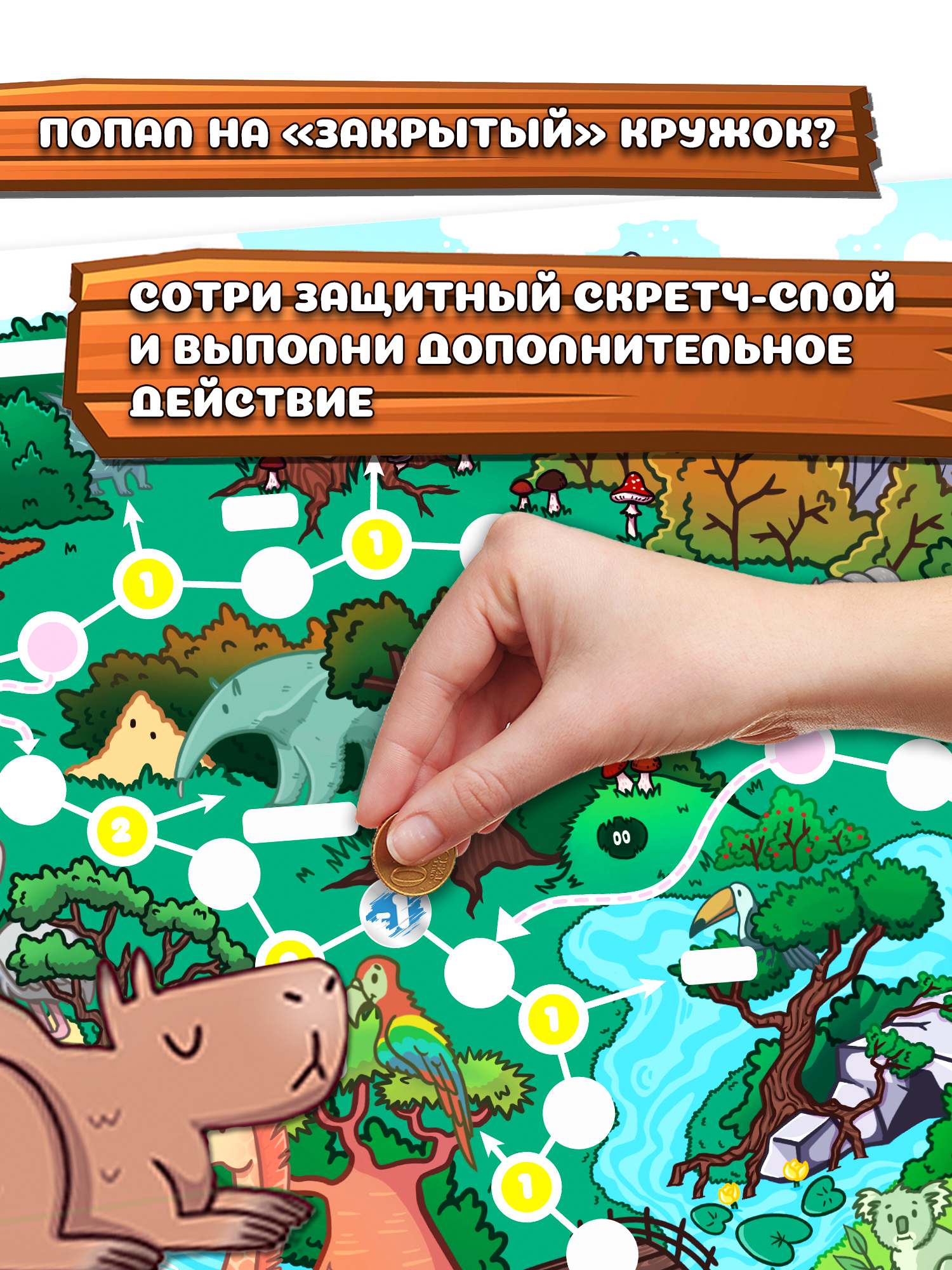 Перед вами необычная игра-ходилка с фишками и кубиком: после перемещения фишки нужно стереть защитный скретч-слой, чтобы узнать, какое приключение ждёт тебя на пути! Скретч — это слой блестящей краски, который не позволяет увидеть секретное изображение, как на лотерейном билете. Скретч-слой легко стирается и не оставляет следов на игровом поле.
