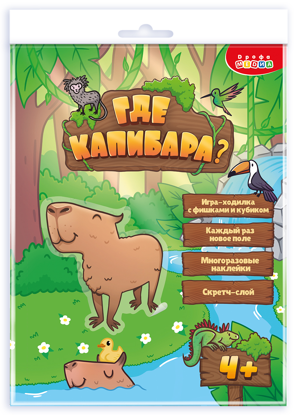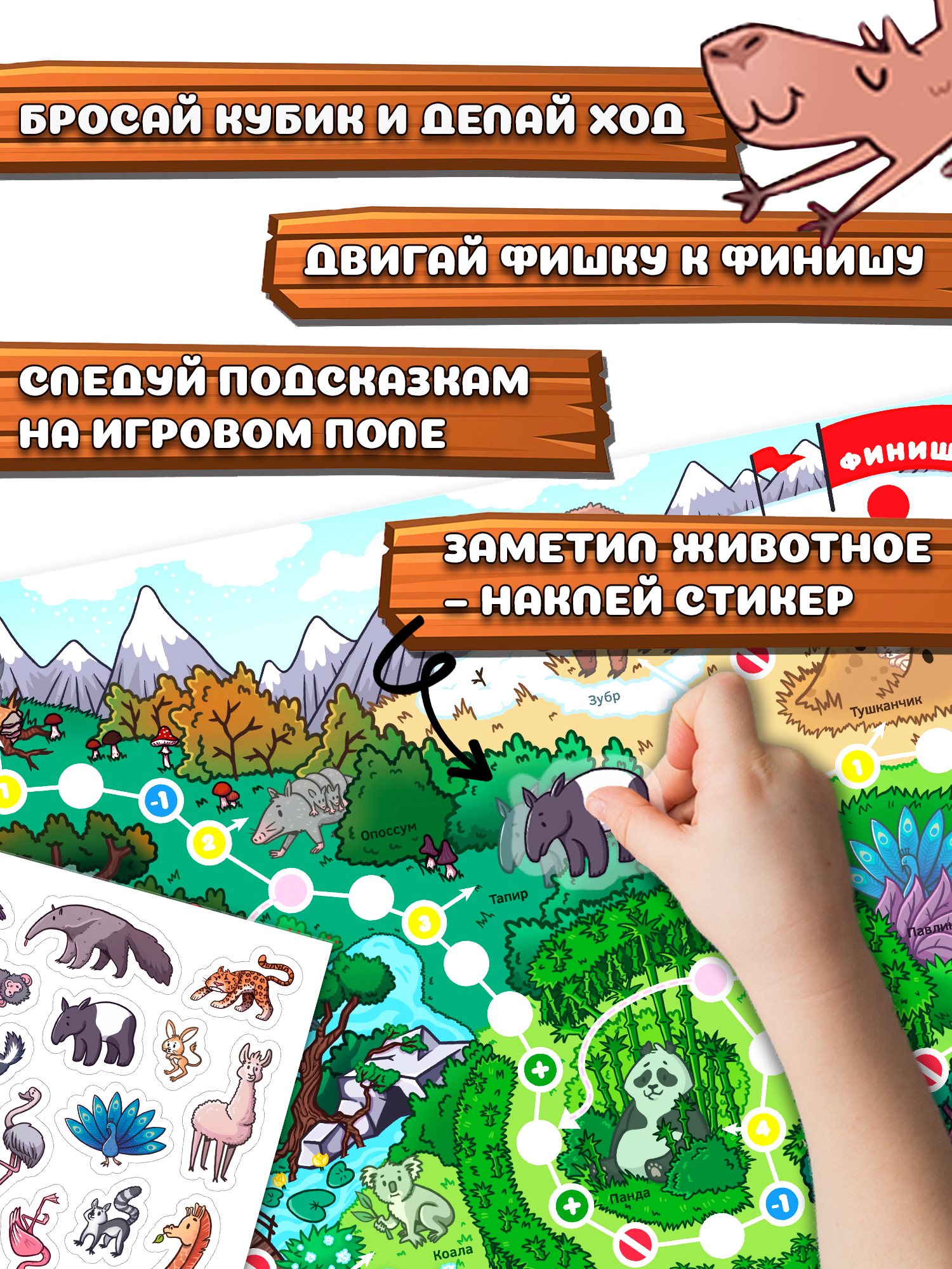 Кроме того, в игре 32 многоразовые пластиковые наклейки с животными, которые сделают игровое поле еще ярче, и 20 разноцветных наклеек, которые помогут изменять поле перед каждой игрой, делая маршрут непредсказуемым. Зарабатывай очки за редких животных, стирай скретч-слой, наклеивай наклейки!
