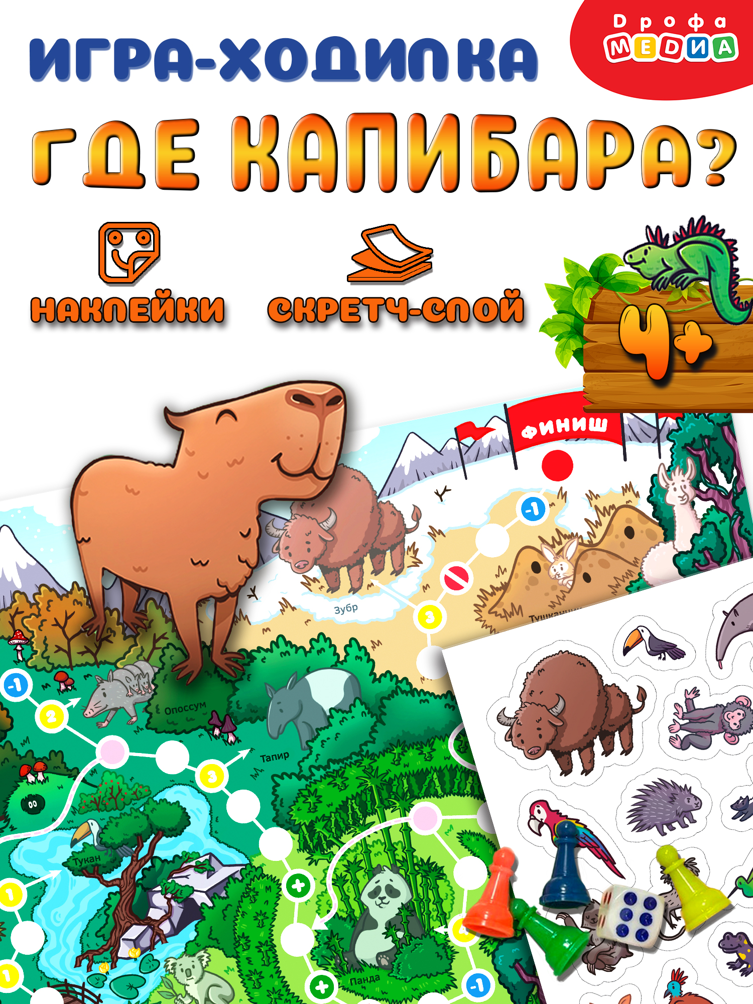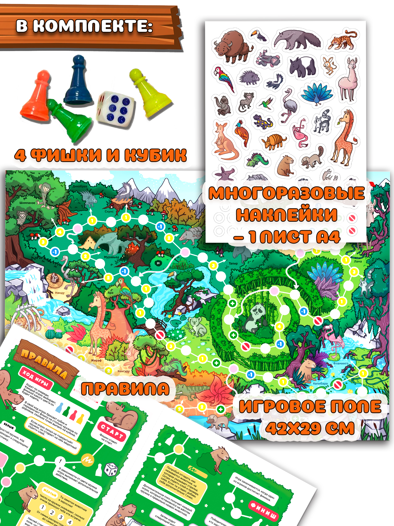 В комплекте: игровое поле, лист с наклейками, 4 фишки, кубик, правила.