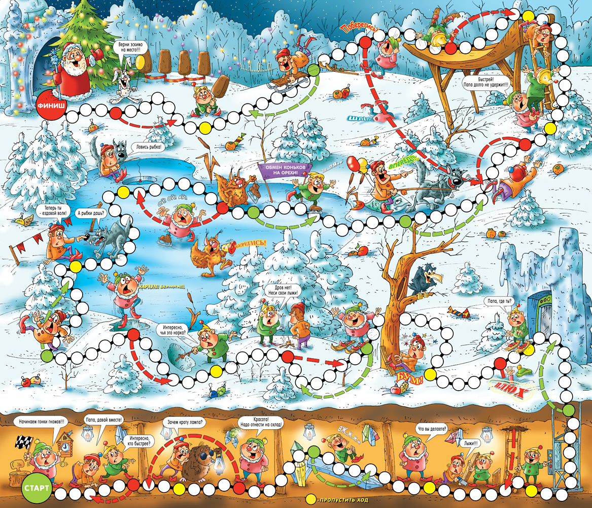 В центре игрового поля на сгибе вы увидите небольшое технологическое отверстие, это делается специально, чтобы поле не рвалось при складывании и лежало ровнее. Игра упакована в пакет с держателем, она занимает мало места, а потому её удобно хранить на игровой полке. Рекомендуем хранить кубик и фишки отдельно, чтобы поле было ровным.
