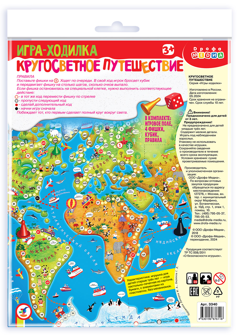В комплекте: игровое поле, 4 фишки, кубик.