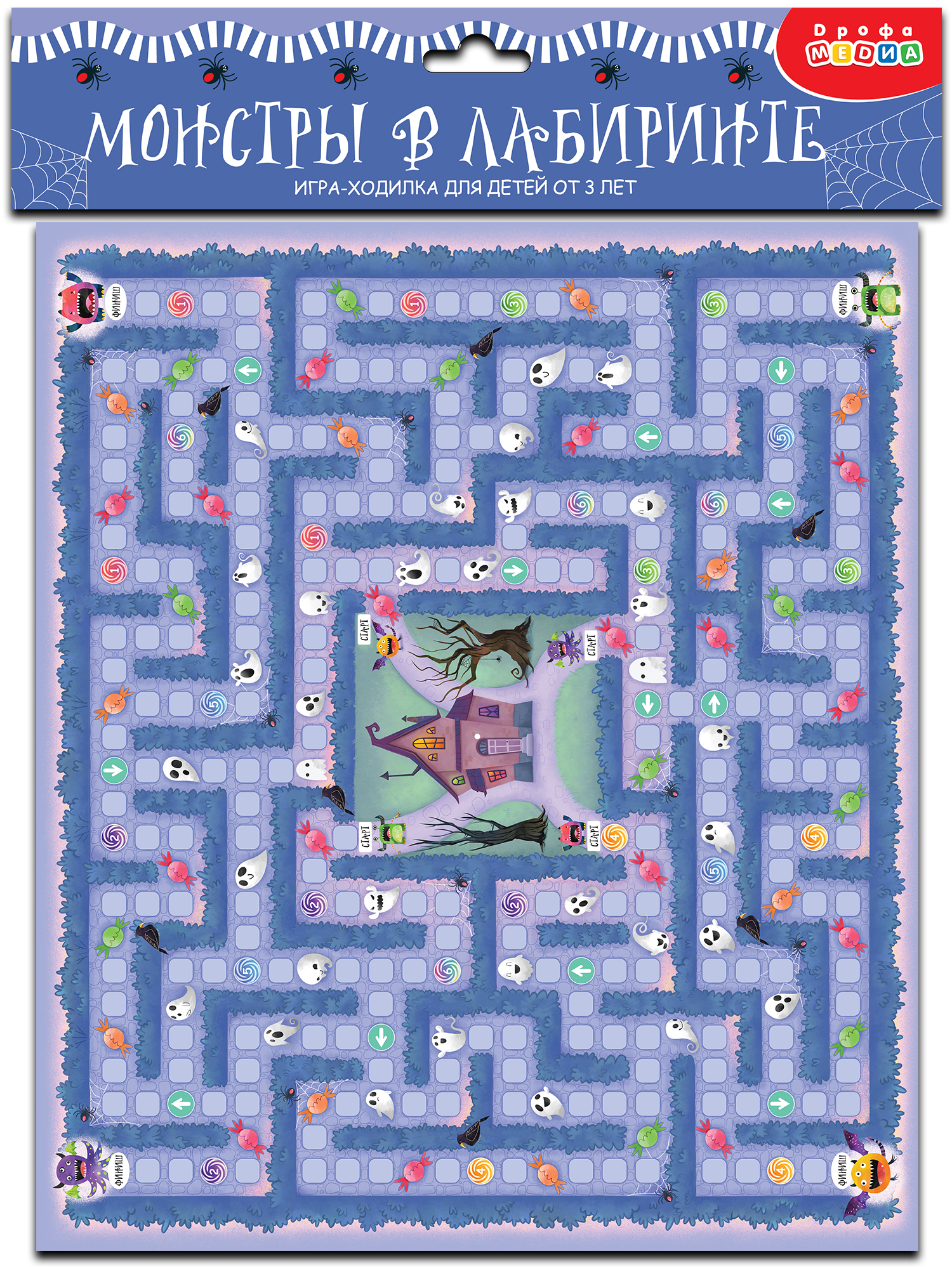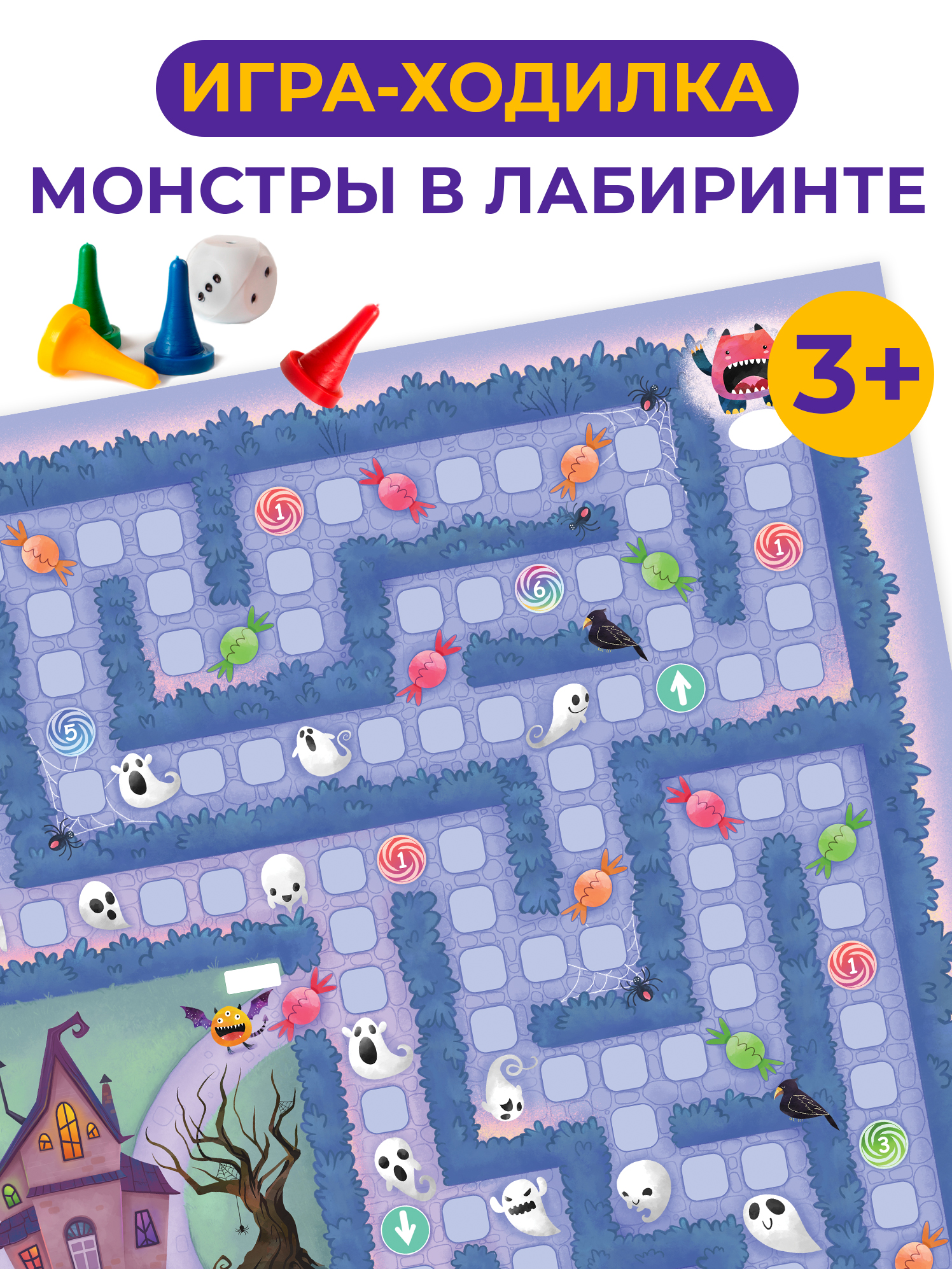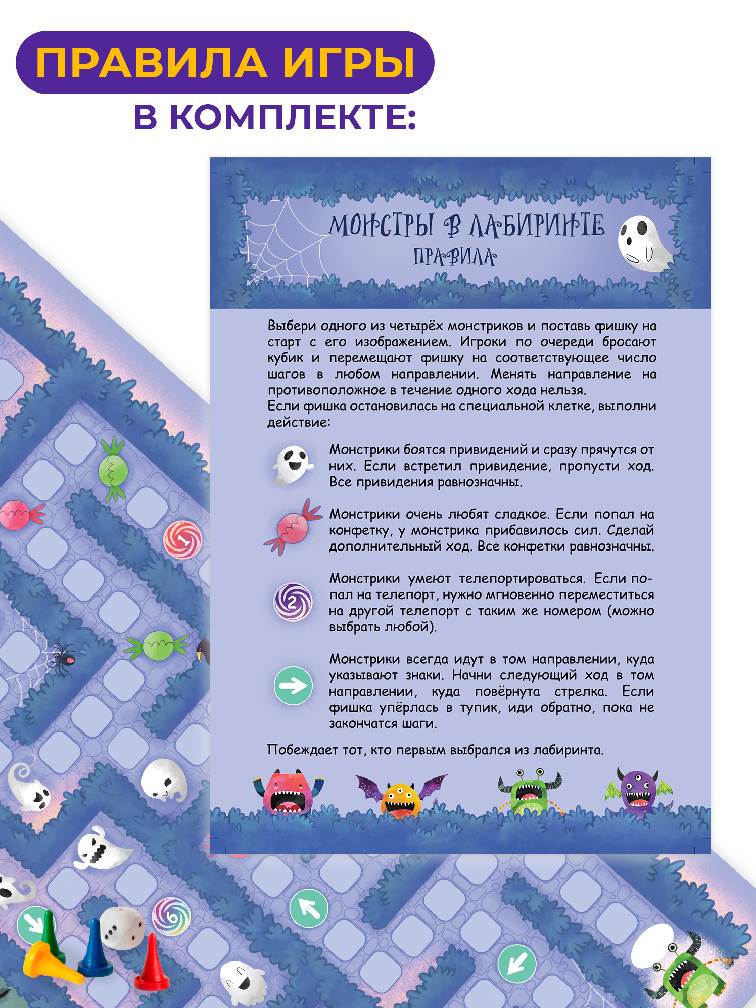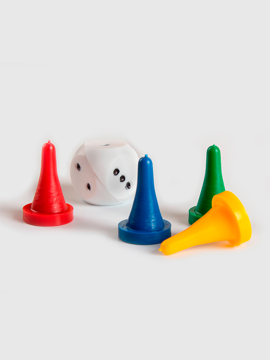 В комплекте: игровое поле, 4 фишки, кубик, правила.