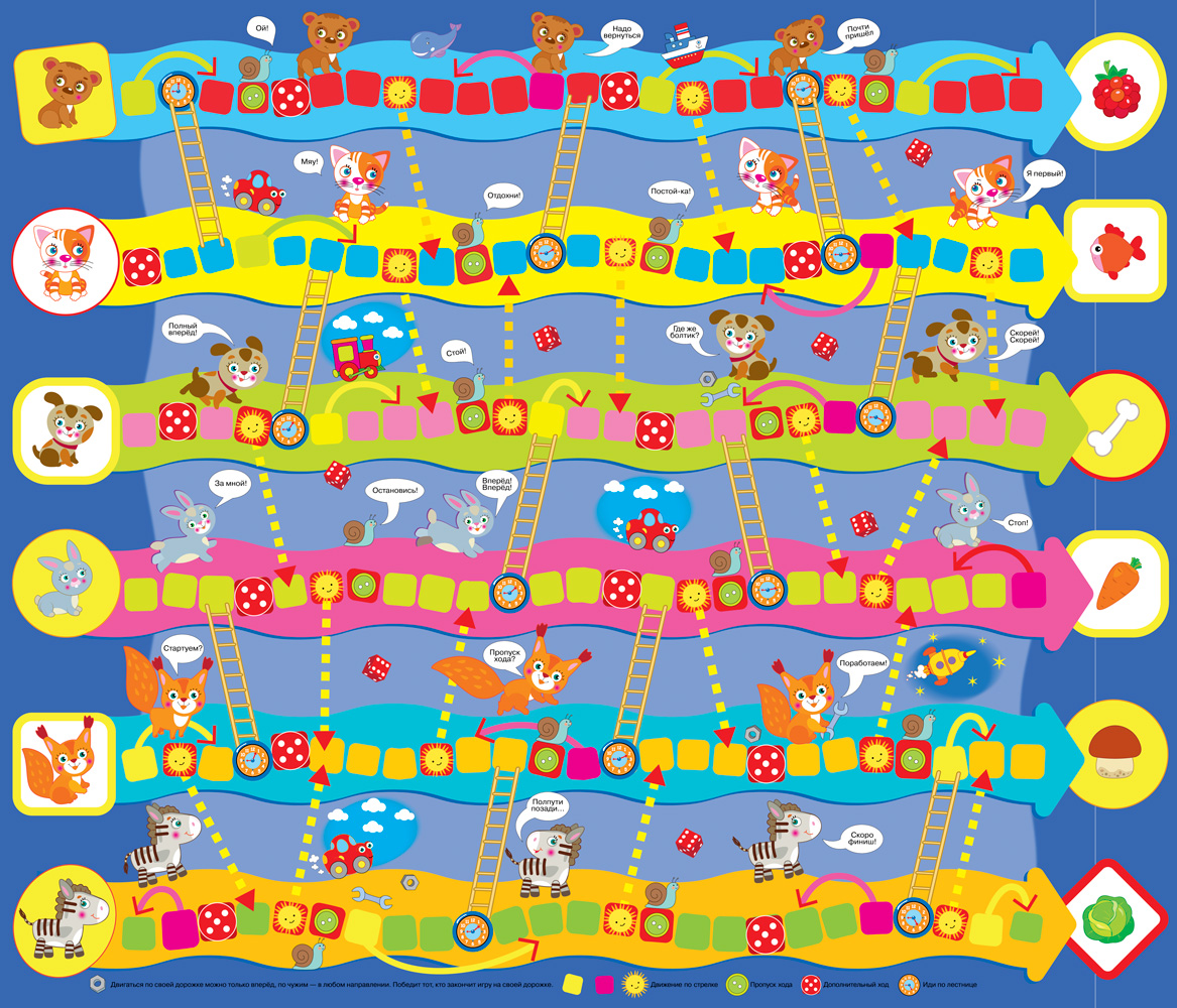 3. Двигаясь по дорожке, игрок выполняет все условия, которые описаны на игровом поле — передвигается по стрелке, пропускает ход, перемещается назад, перемещается на соседнюю дорожку.