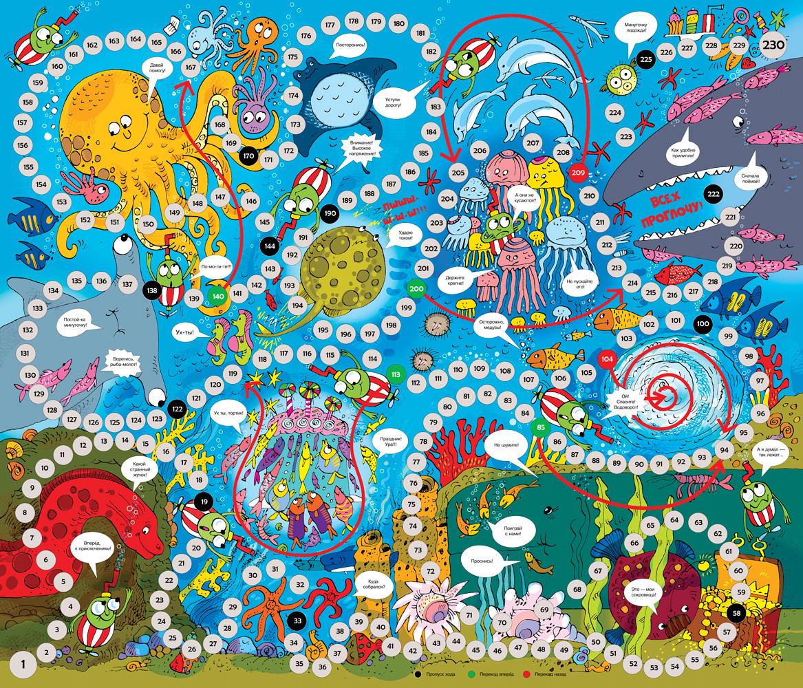 Традиционные игры-ходилки с кубиком и фишками направлены на развитие эмоций и умения ребёнка общаться с другими детьми, играть по правилам. С захватывающими и интересными играми ребята весело проведут своё свободное время, совершив увлекательное путешествие по подводному царству . Играть могут четверо. Фишки ставят на старт и определяют первенство хода. Бросив кубик, игроки делают столько ходов по игровому полю, сколько очков выпало на кубике. Выиграет тот, кто первым доберётся до финиша.