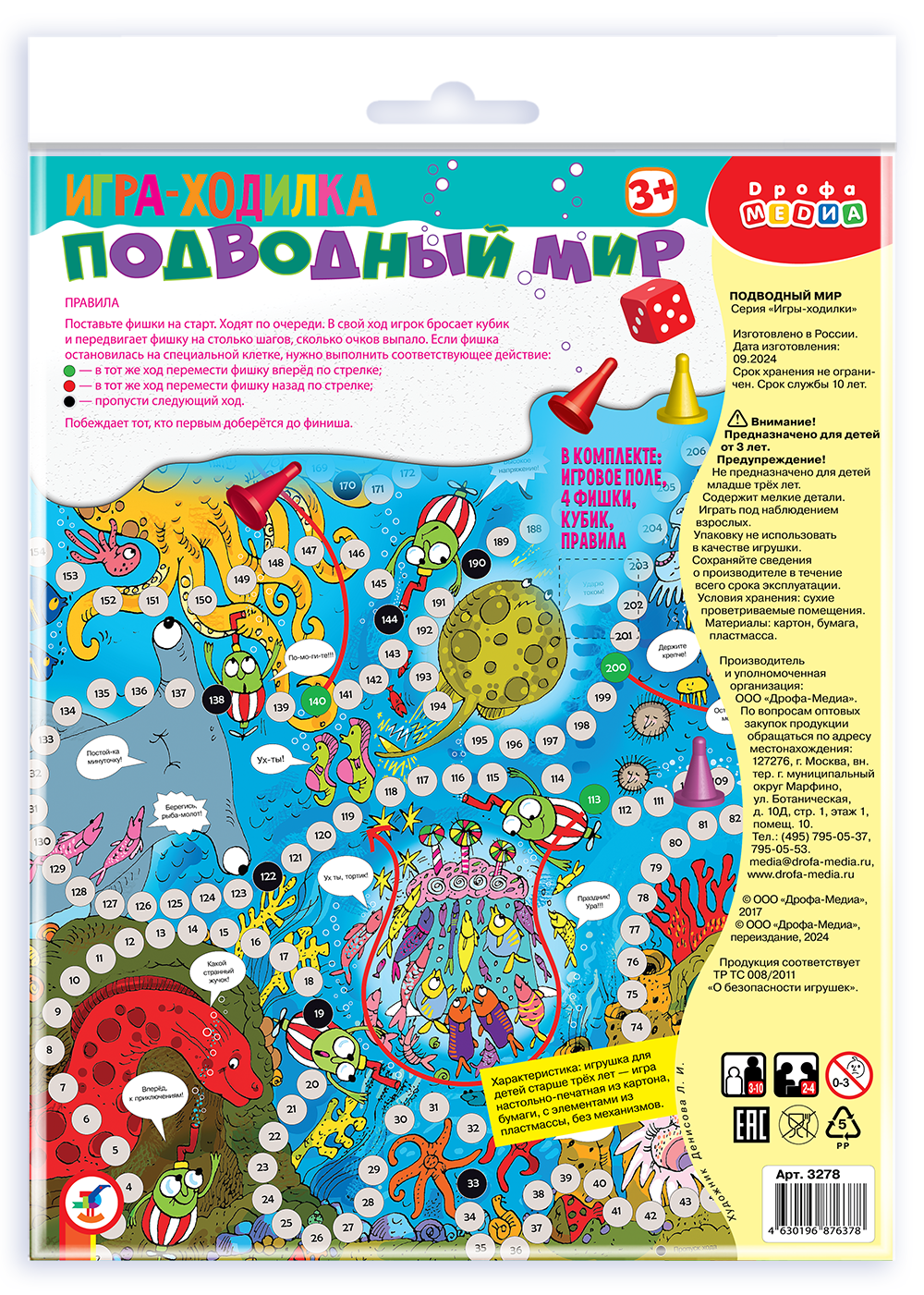 В комплекте: игровое поле, 4 фишки, кубик.
