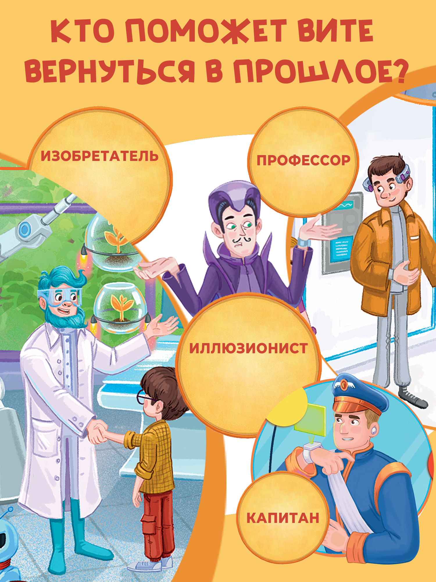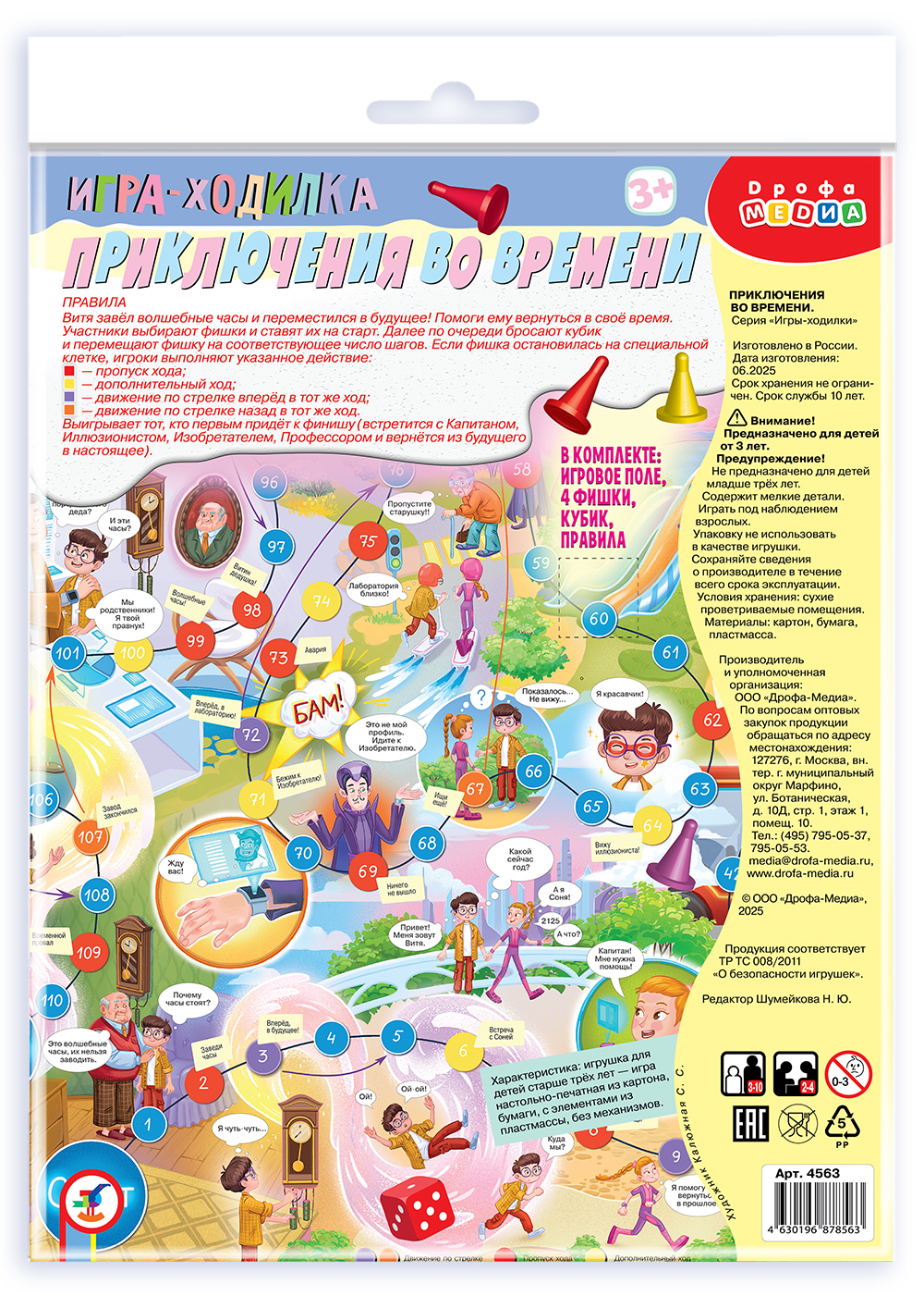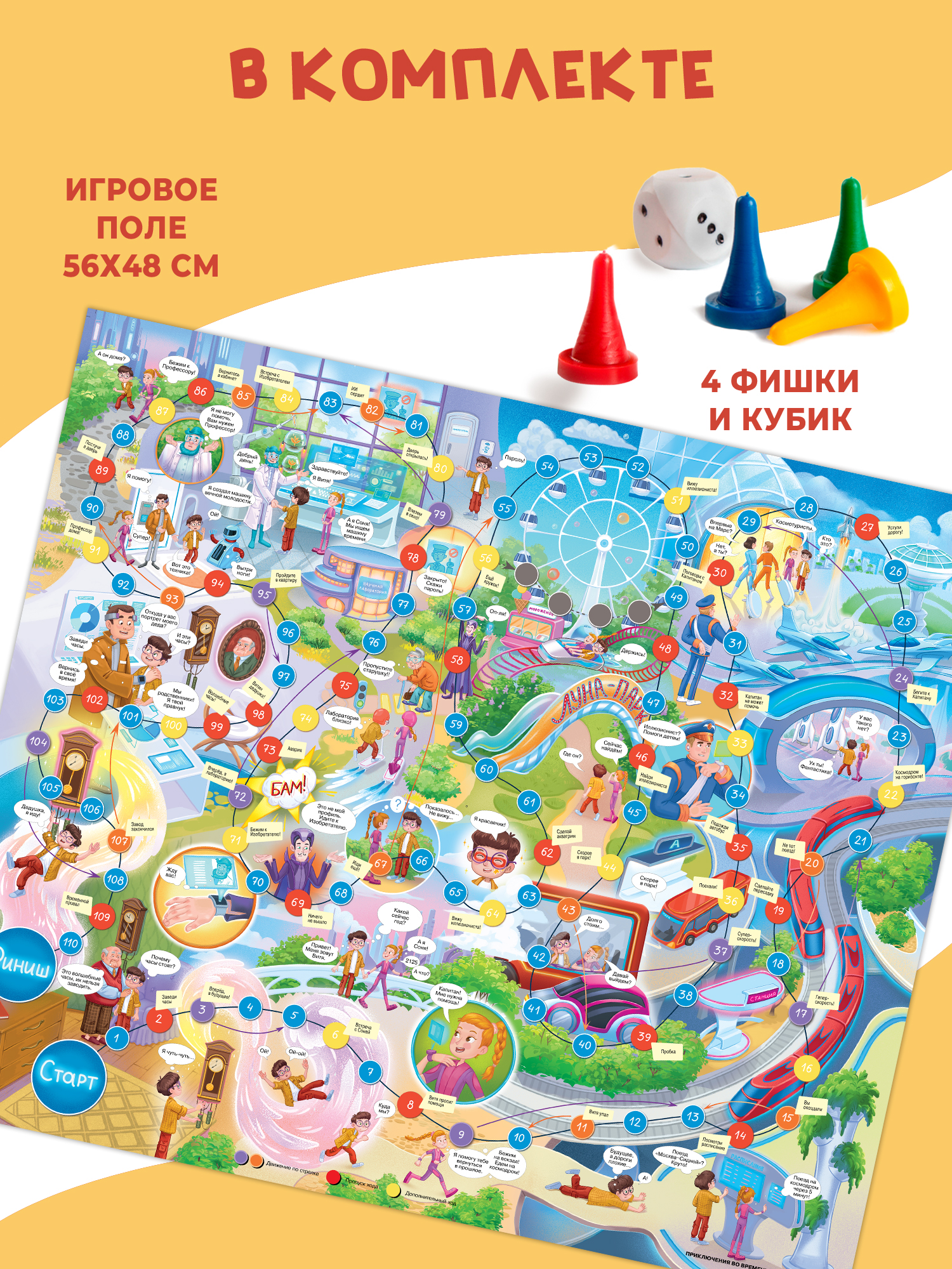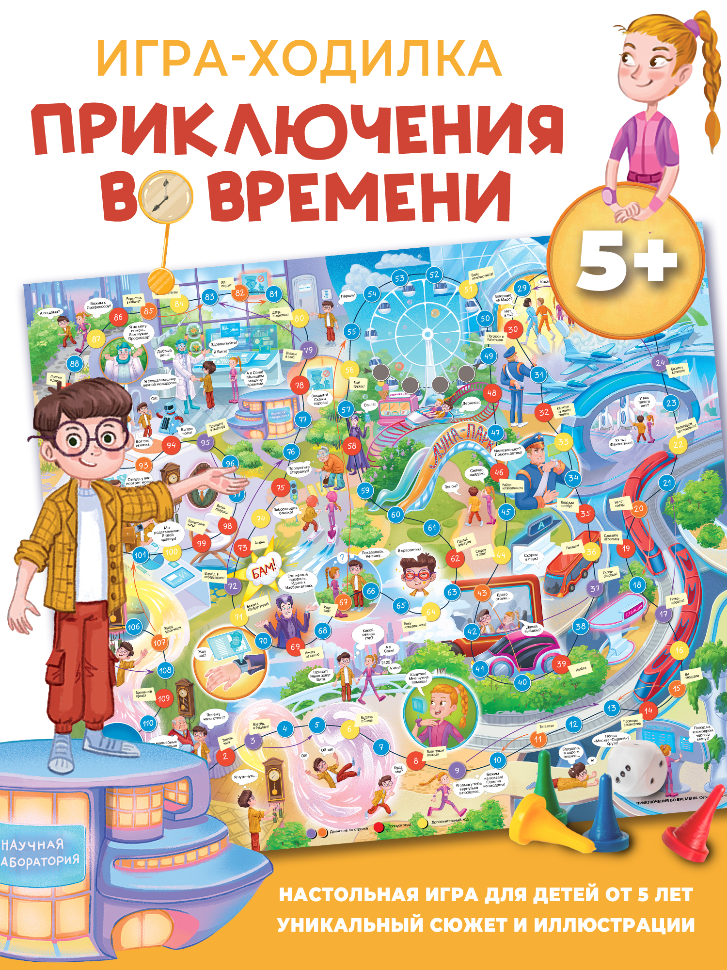 Настольная игра «Приключения во времени» – игра из серии ходилок, так любимых всеми детьми. Эта ходилка – настоящее приключение в далёком будущем! У Витиного дедушки были волшебные часы и, конечно, мальчик завёл их. Магия перенесла Витю в будущее и теперь ему нужно вернуться назад. Хорошо, что Витя встретил находчивую и смелую девочку Соню! Она предложила попросить помощи у Капитана космического корабля. Спойлер – Капитан не сможет помочь ребятам, поэтому им придётся обратиться к Иллюзионисту, Изобретателю и Профессору. Кто же отправит Витю в прошлое?