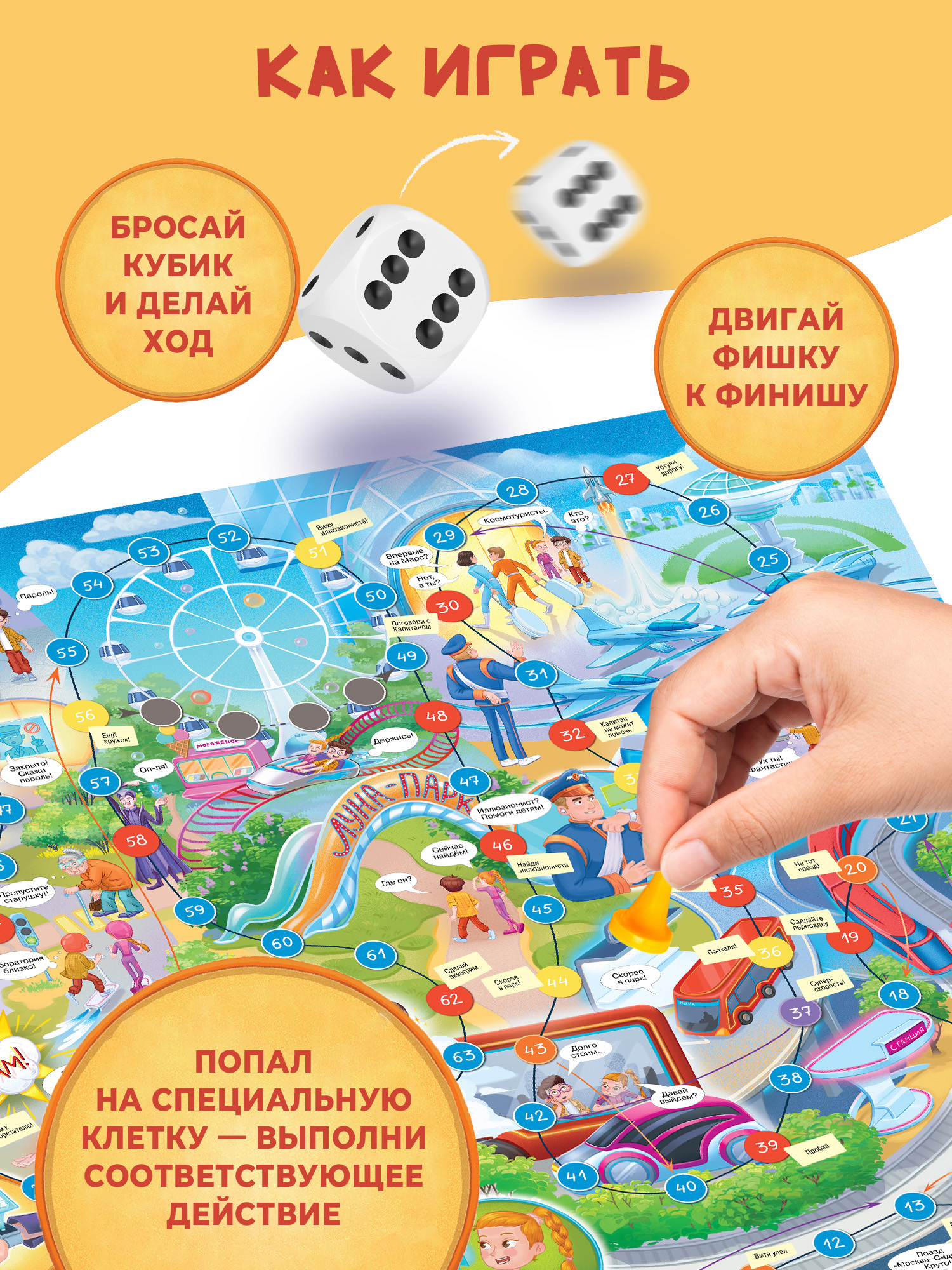 Передвигаться по игровому полю нужно будет с помощью фишек и кубика. Бросив кубик, игроки делают столько ходов по игровому полю, сколько очков выпало на кубике. Если фишка остановилась на специальной клетке, выполняют соответствующее действие. Выиграет тот, кто первым доберётся до финиша. Он-то и узнает, кто помог Вите вернуться к дедушке!