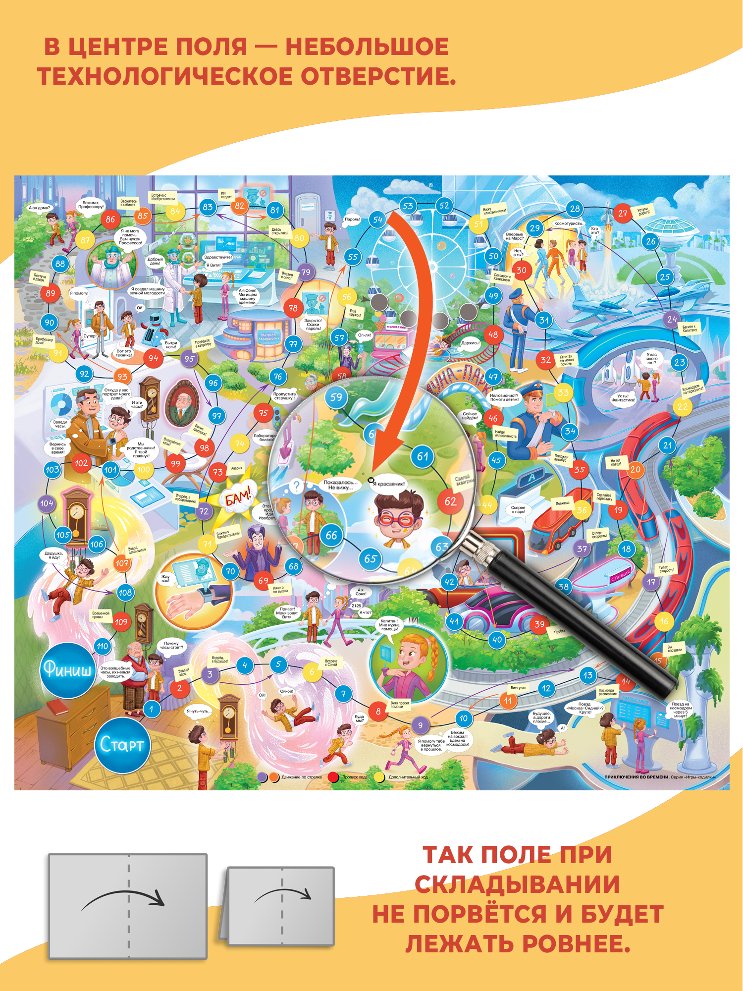 В центре игрового поля на сгибе есть небольшое технологическое отверстие, это сделано специально, чтобы поле не рвалось при складывании и лежало ровнее. Игра для детей упакована в пакет с держателем, она занимает мало места, а потому её удобно хранить на игровой полке. Рекомендуем хранить кубик и фишки отдельно, чтобы поле было ровным.