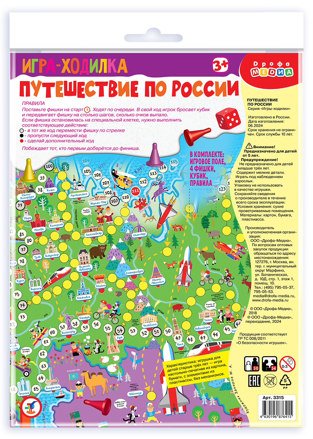 В центре игрового поля на сгибе вы увидите небольшое технологическое отверстие, это делается специально, чтобы поле не рвалось при складывании и лежало ровнее. Игра упакована в пакет с держателем, она занимает мало места, а потому её удобно хранить на игровой полке. Рекомендуем хранить кубик и фишки отдельно, чтобы поле было ровным.