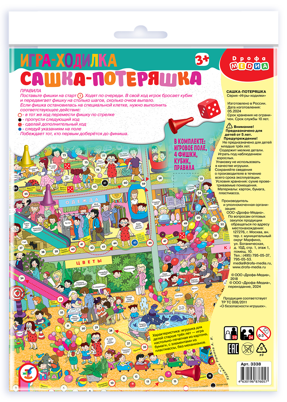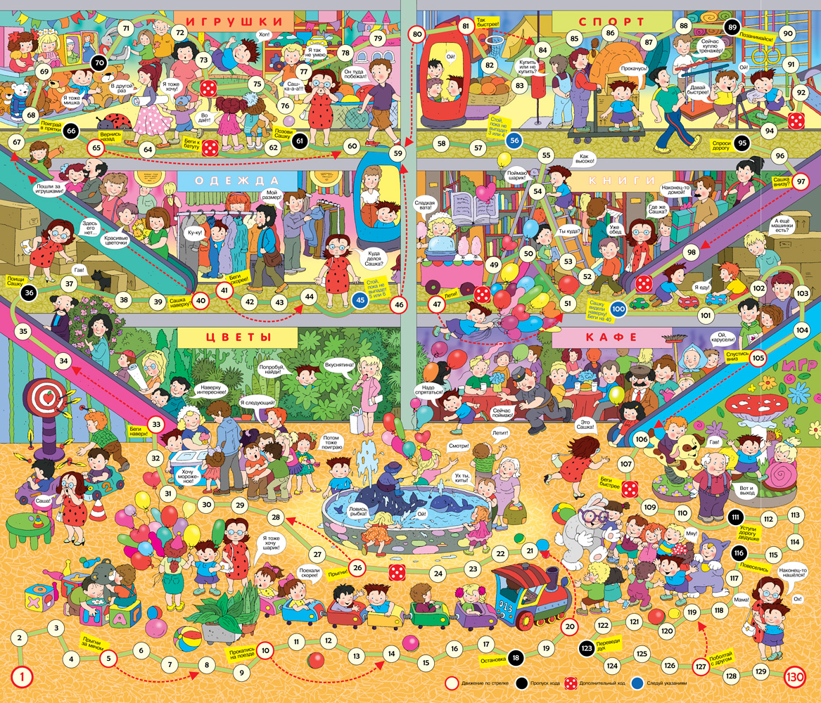 Игра-ходилка, в которой игрокам нужно помочь маме найти потерявшегося ребёнка. Сашка-потеряшка тот ещё озорник! Пока мама ищет его в огромном супермаркете, мальчик вовсю развлекается: прыгает на батуте, притворяется игрушкой, катается в лифте и даже летает на воздушных шарах. На игровой дорожке детей подстерегает много клеточек-сюрпризов, приятных и не очень: дополнительные ходы, движение по стрелкам вперёд или назад и, конечно же, пропуски хода. Поле очень интересно разглядывать, до того оно насыщено событиями и диалогами персонажей. Ваши фишки уже на старте? Тогда вперёд!