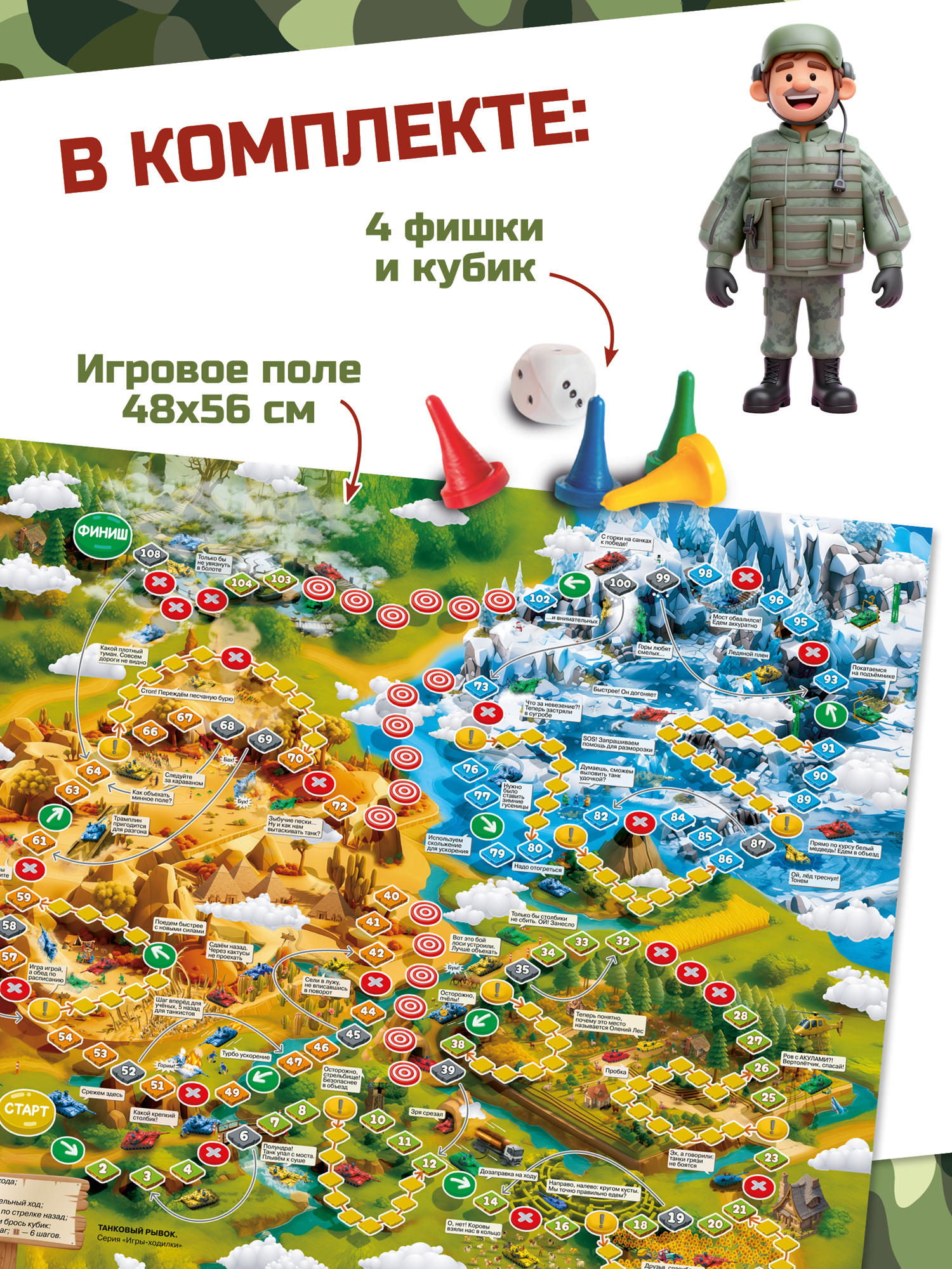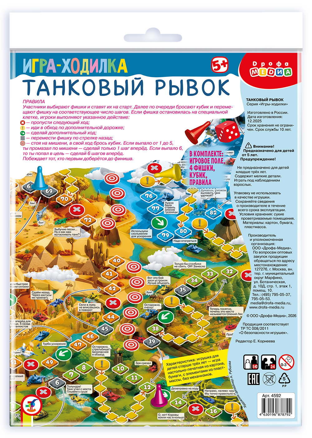 Настольная игра «Танковый рывок» – это ходилка с кубиком и фишками, которая не оставит равнодушными даже взрослых. Поэтому она отлично подойдёт в качестве развлечения для всей семьи. Простые знакомые правила и яркие весёлые картинки без труда увлекут ребёнка.