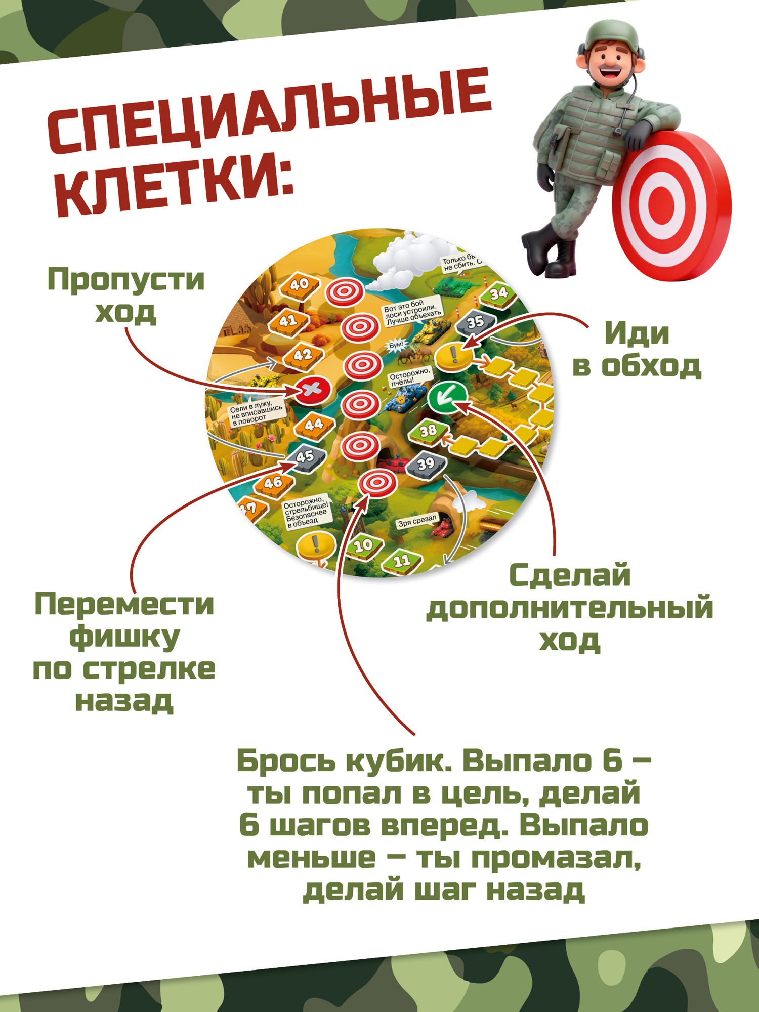 – стоя на мишени, в свой ход брось кубик. Если выпало от 1 до 5, ты промазал по мишени – сделай только 1 шаг вперёд. Если выпало 6, то ты попал в цель – сделай 6 шагов вперёд.