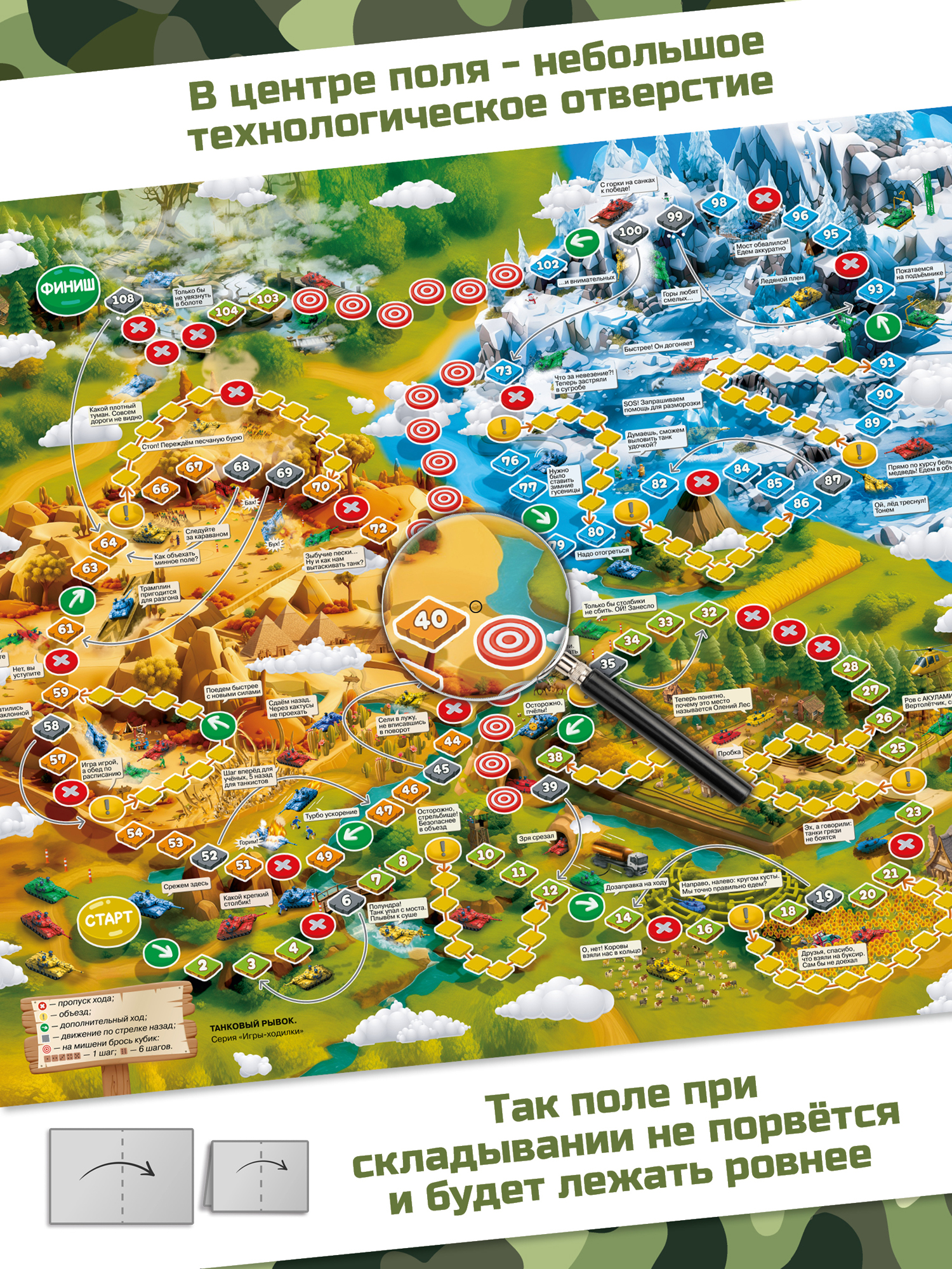 В центре игрового поля на сгибе вы увидите небольшое технологическое отверстие, это делается специально, чтобы поле не рвалось при складывании и лежало ровнее. Игра упакована в пакет с держателем, она занимает мало места, а потому её удобно хранить на игровой полке. Рекомендуем хранить кубик и фишки отдельно, чтобы поле было ровным.