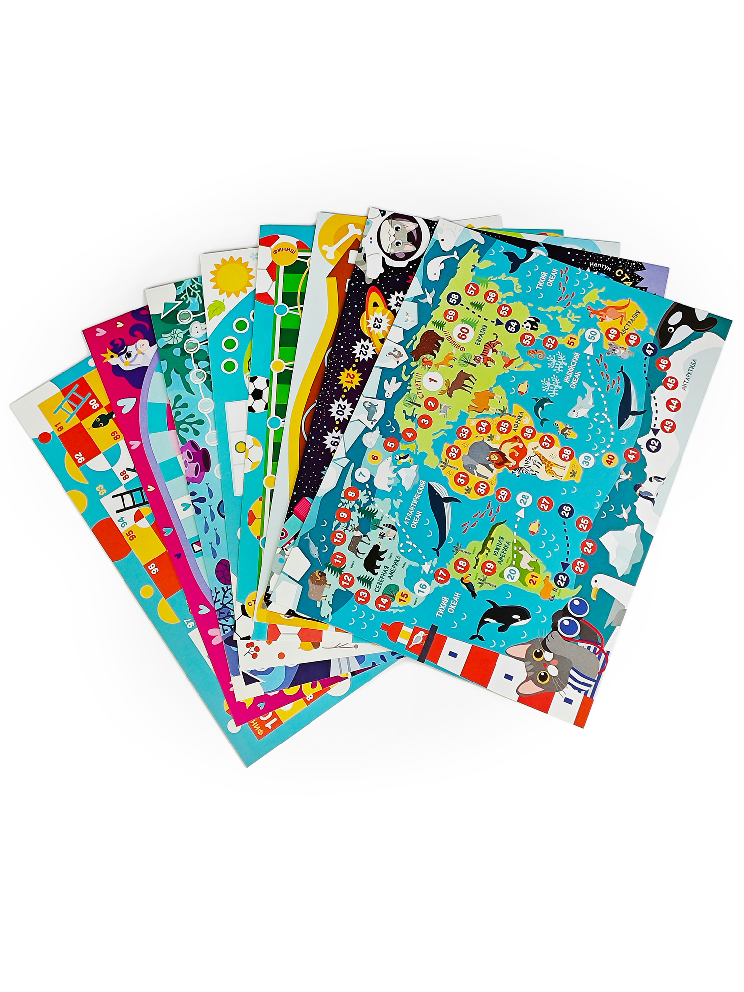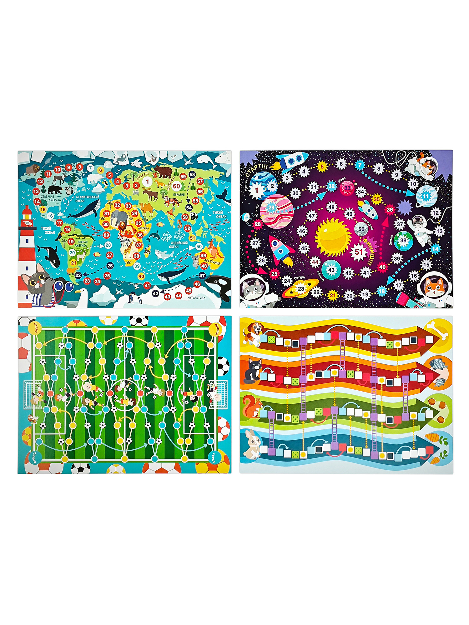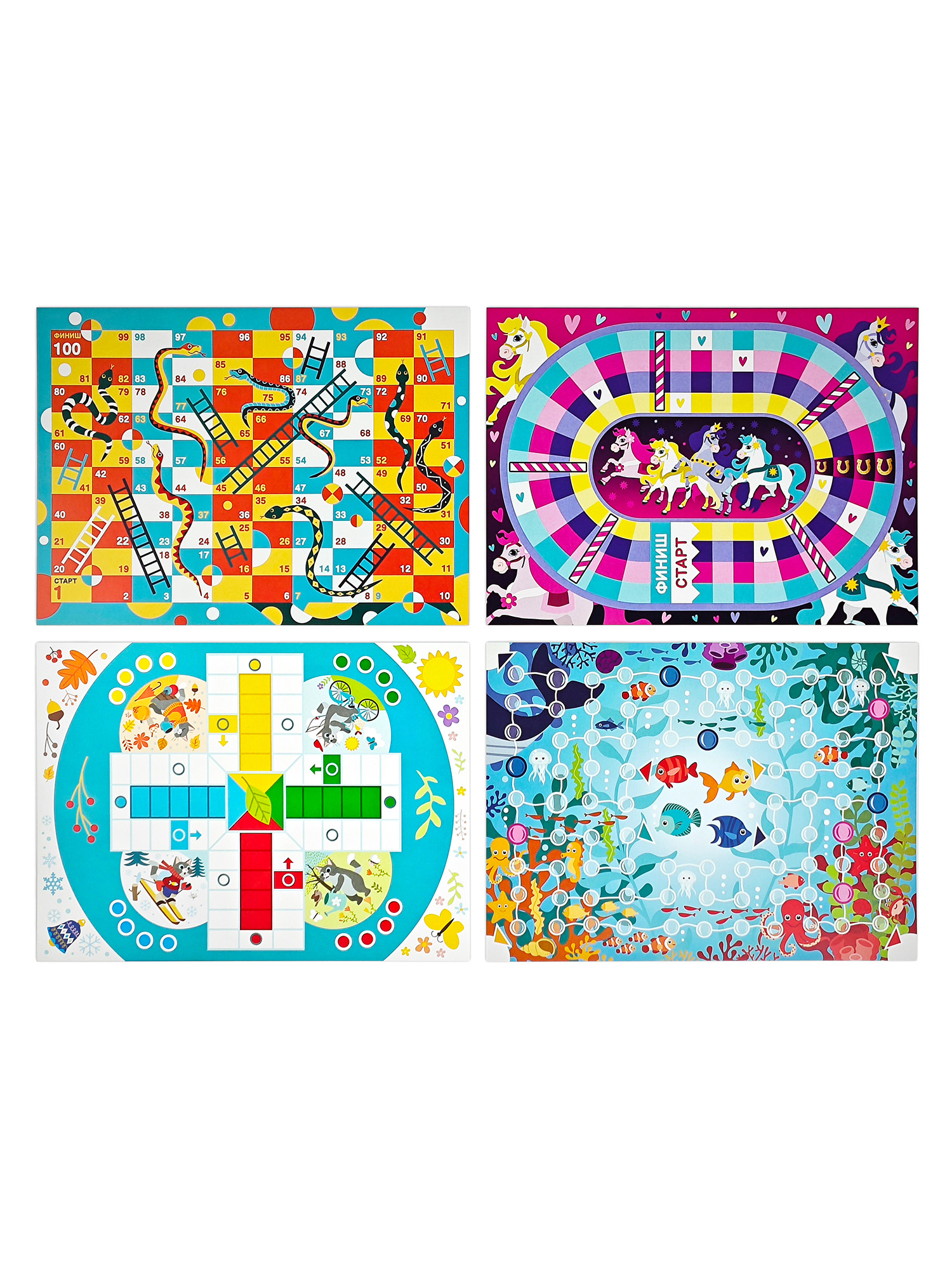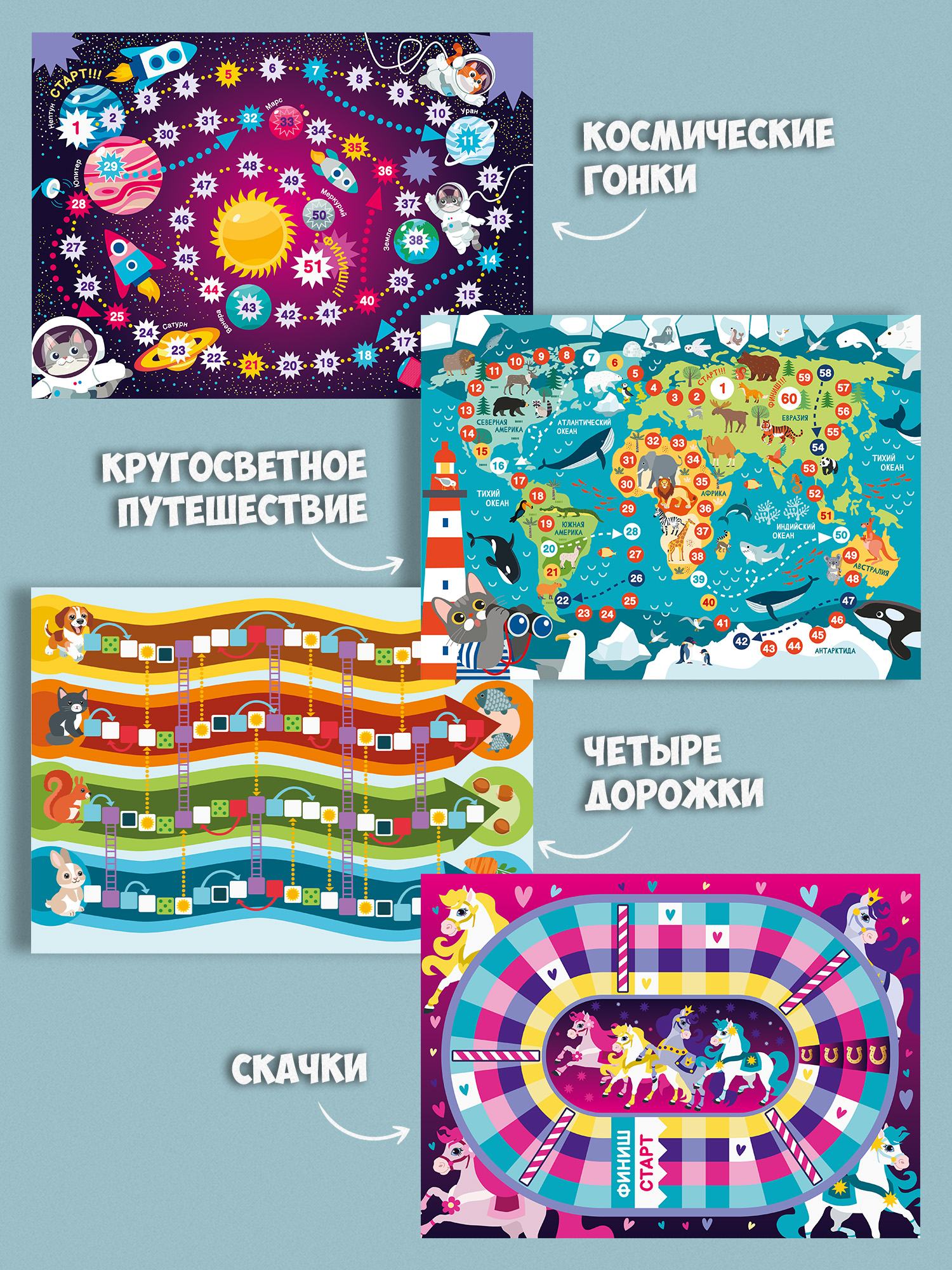 В наборе вы найдёте 8 абсолютно разных игр на любой вкус — классические ходилки (с одной дорожкой, лудо, лестницы и змеи), а также уникальные (с необычными правилами). Игры отлично подходят для детской вечеринки, семейных посиделок, детского сада и школы.