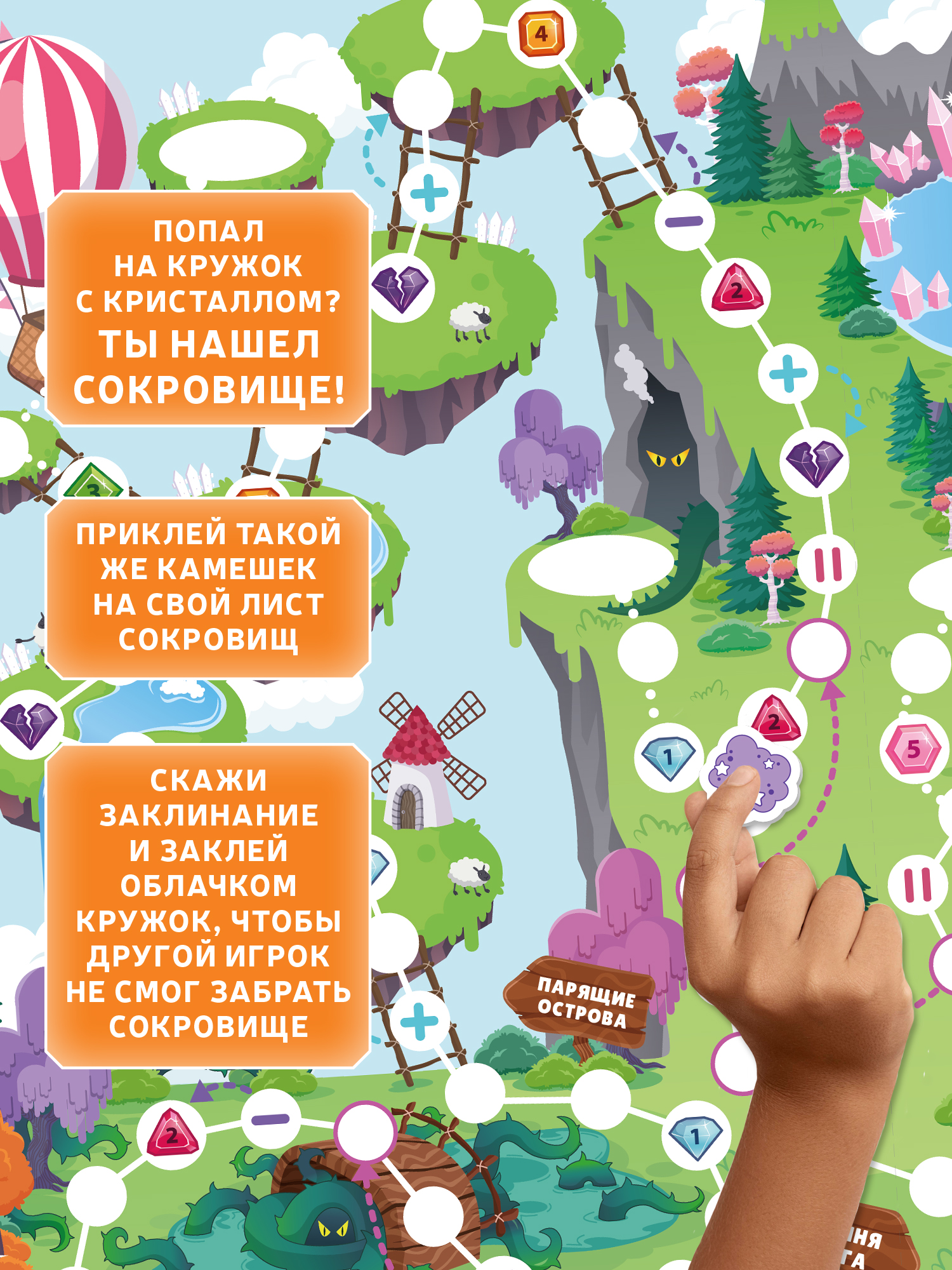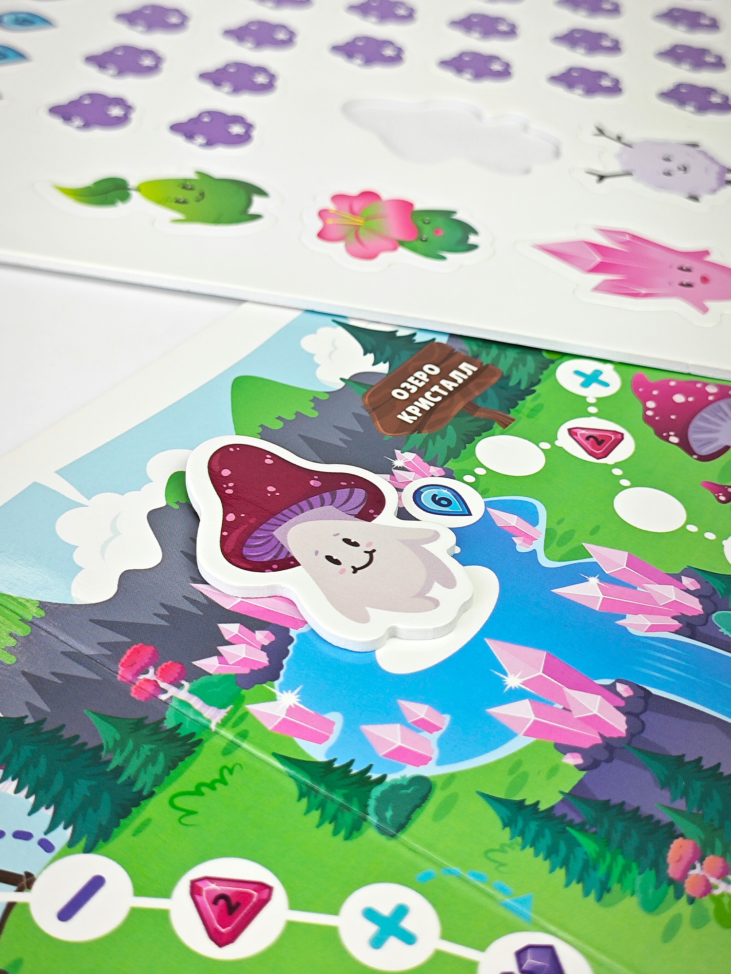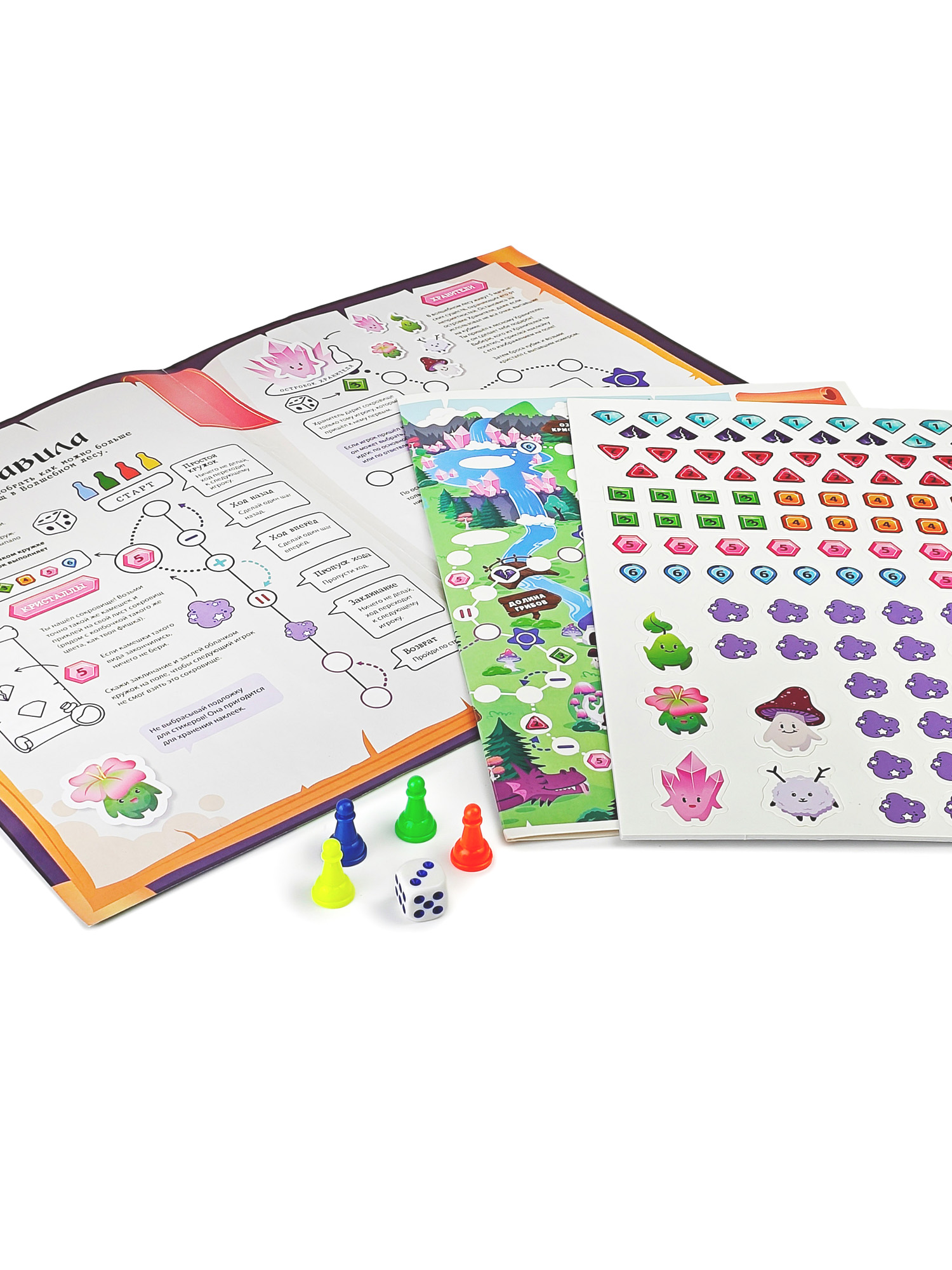 В комплекте: игровое поле, лист с объёмными многоразовыми наклейками, 4 фишки, кубик, правила.