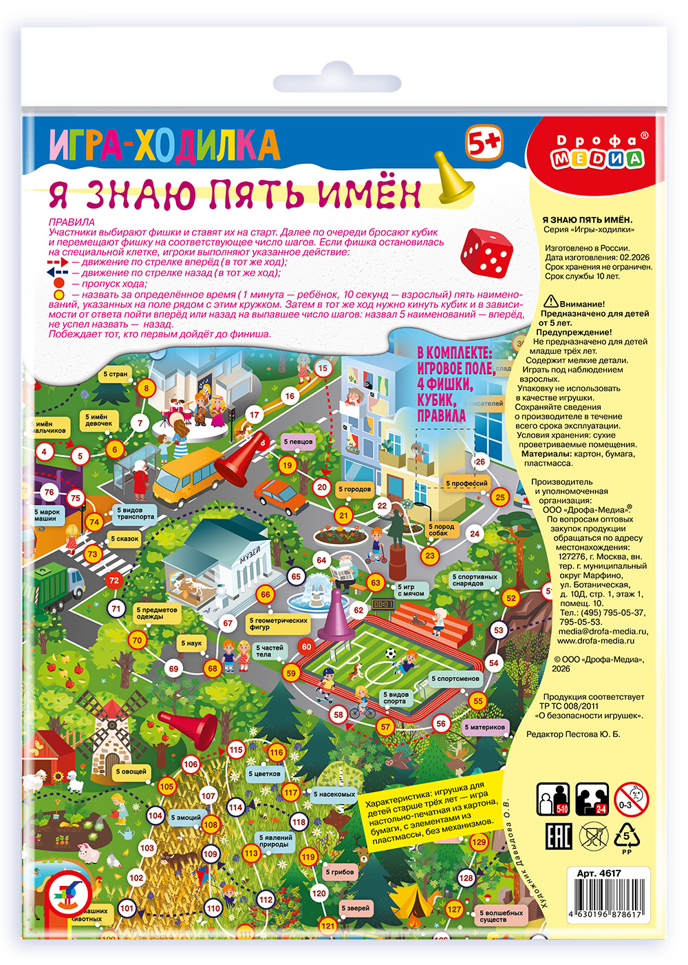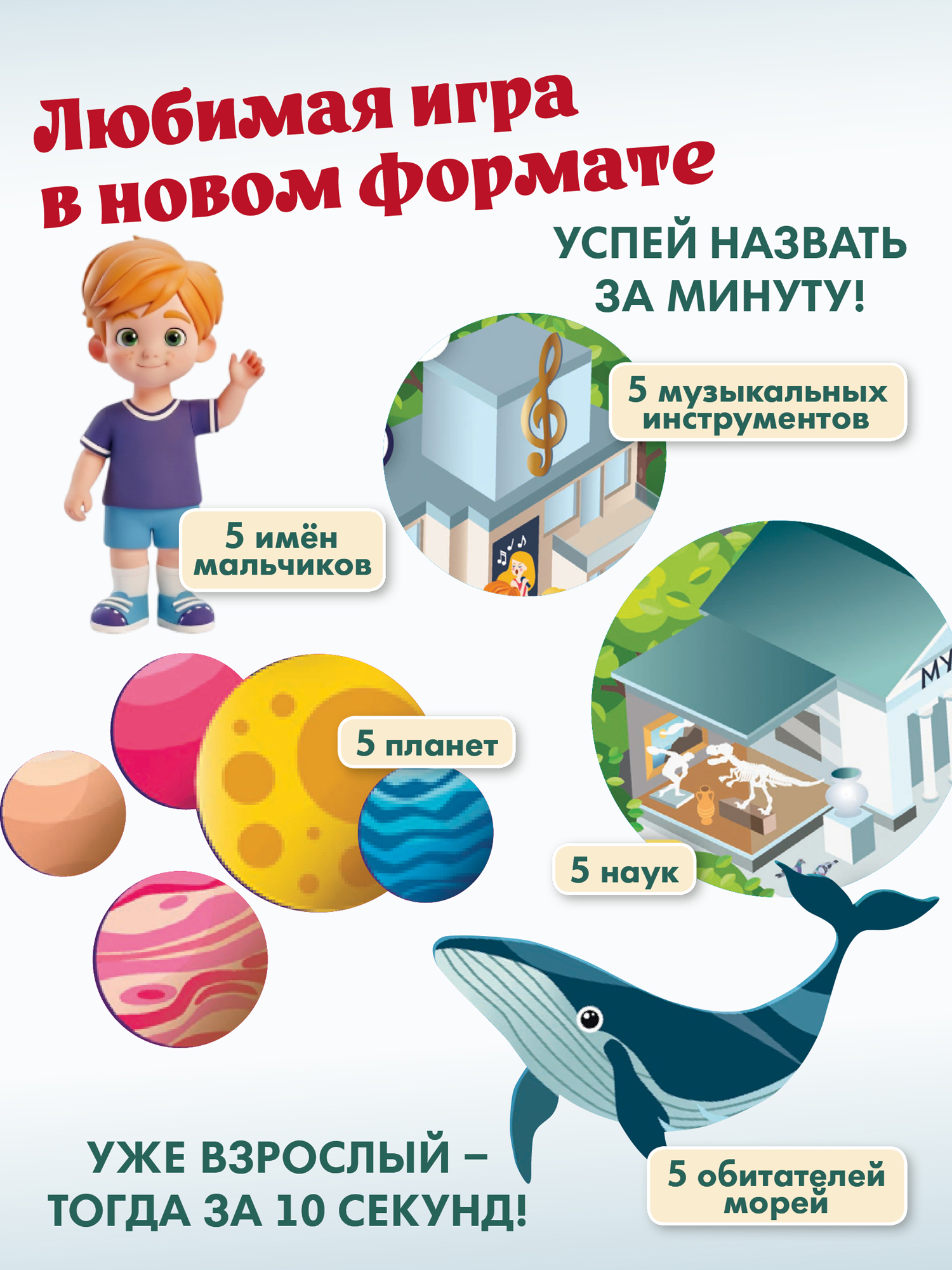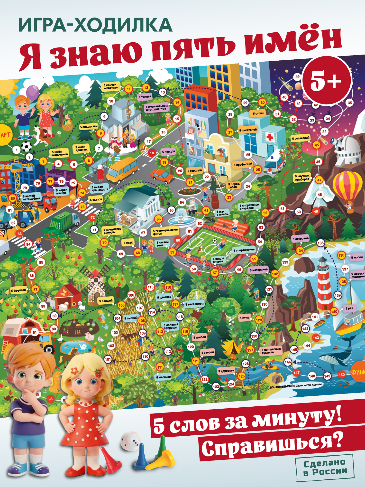 Настольная игра «Я знаю пять имён» – игра из серии ходилок, так любимых всеми детьми. Помните дворовую игру с мячом, где нужно было назвать пять имён мальчиков, девочек, пять овощей, пять стран и ещё много чего? Эта ходилка позволит сыграть в такую игру, но кидать здесь нужно не мяч, а кубик! Проверим, кто справится с заданиями лучше: взрослые или дети. Игра только кажется лёгкой, пока у вас не появляется ограничение по времени…