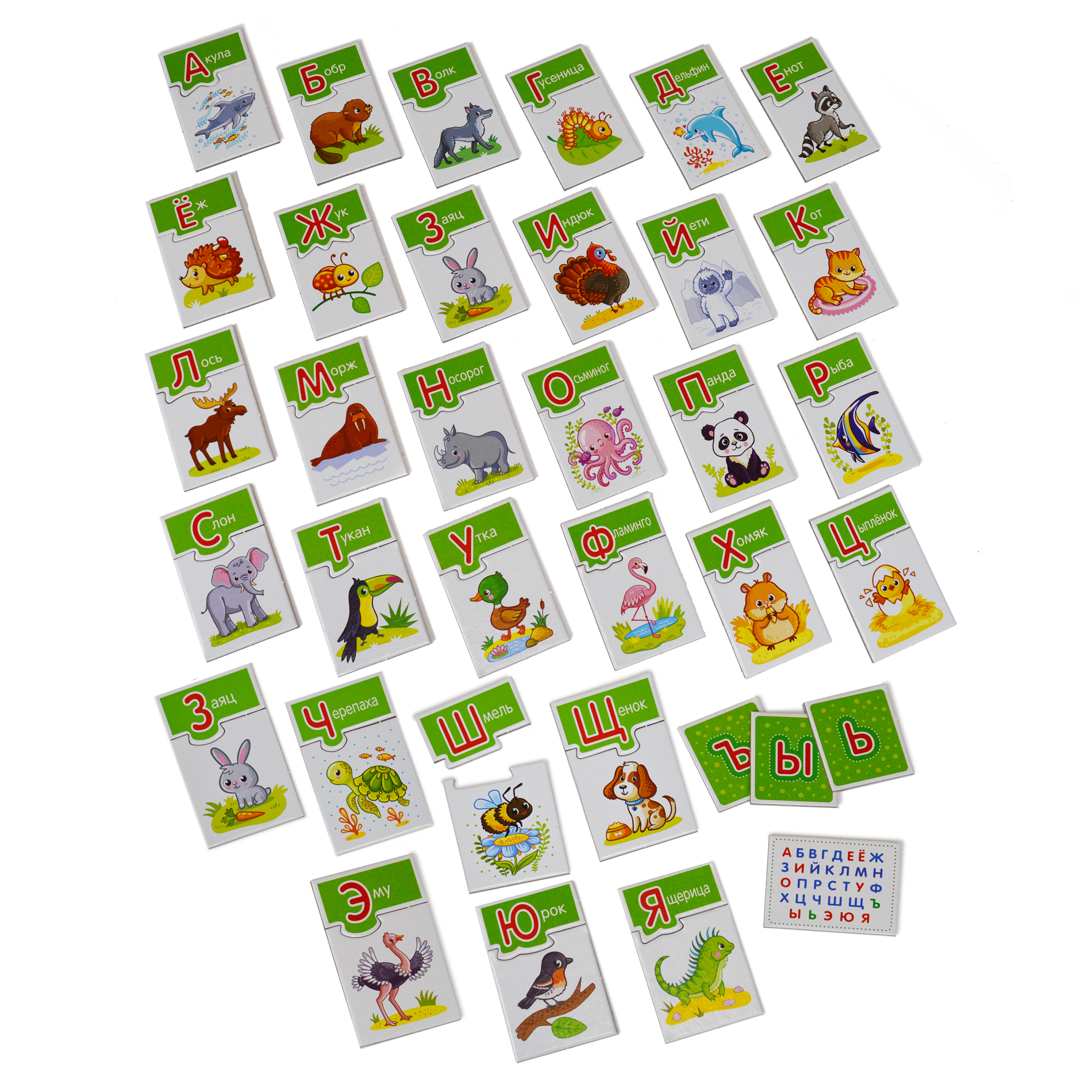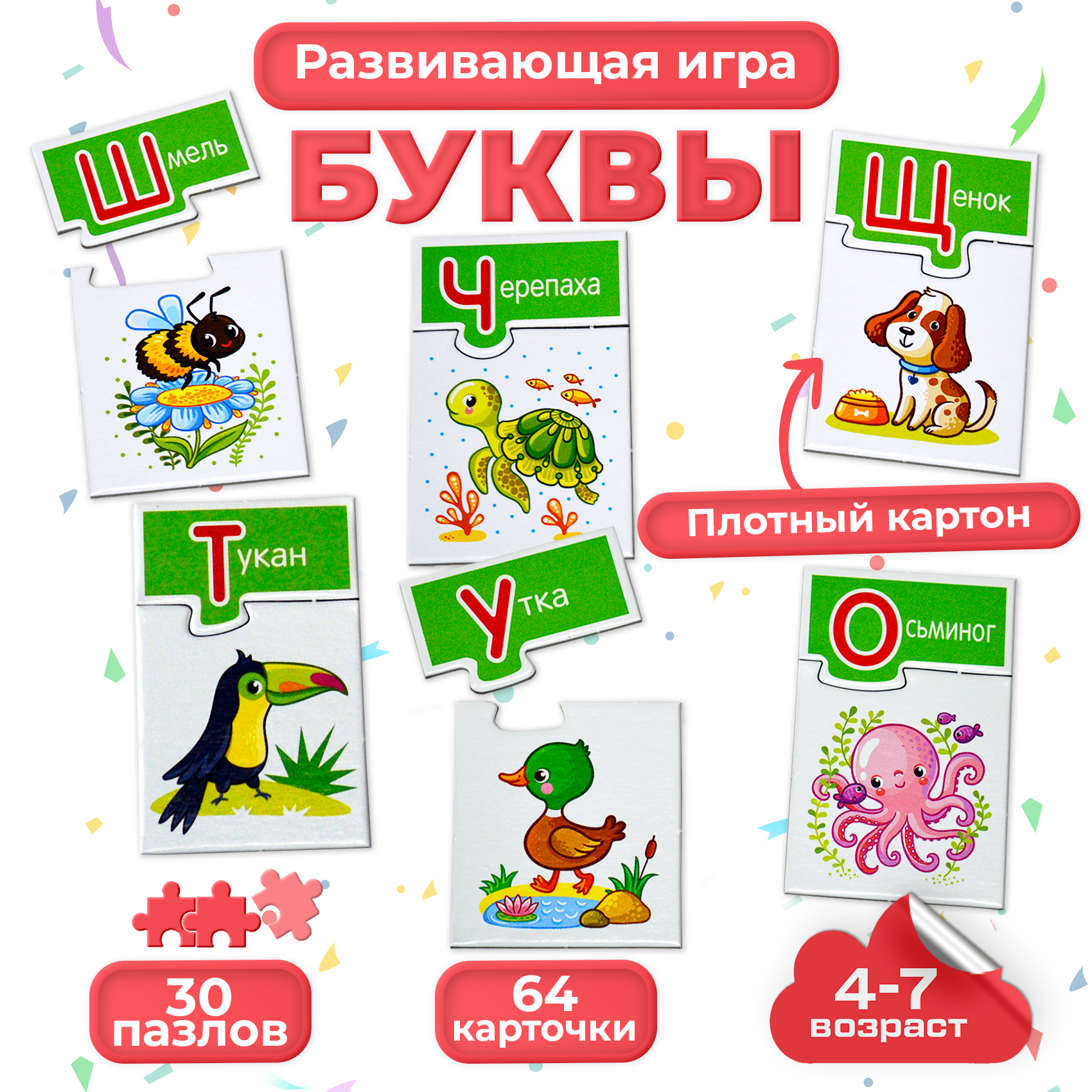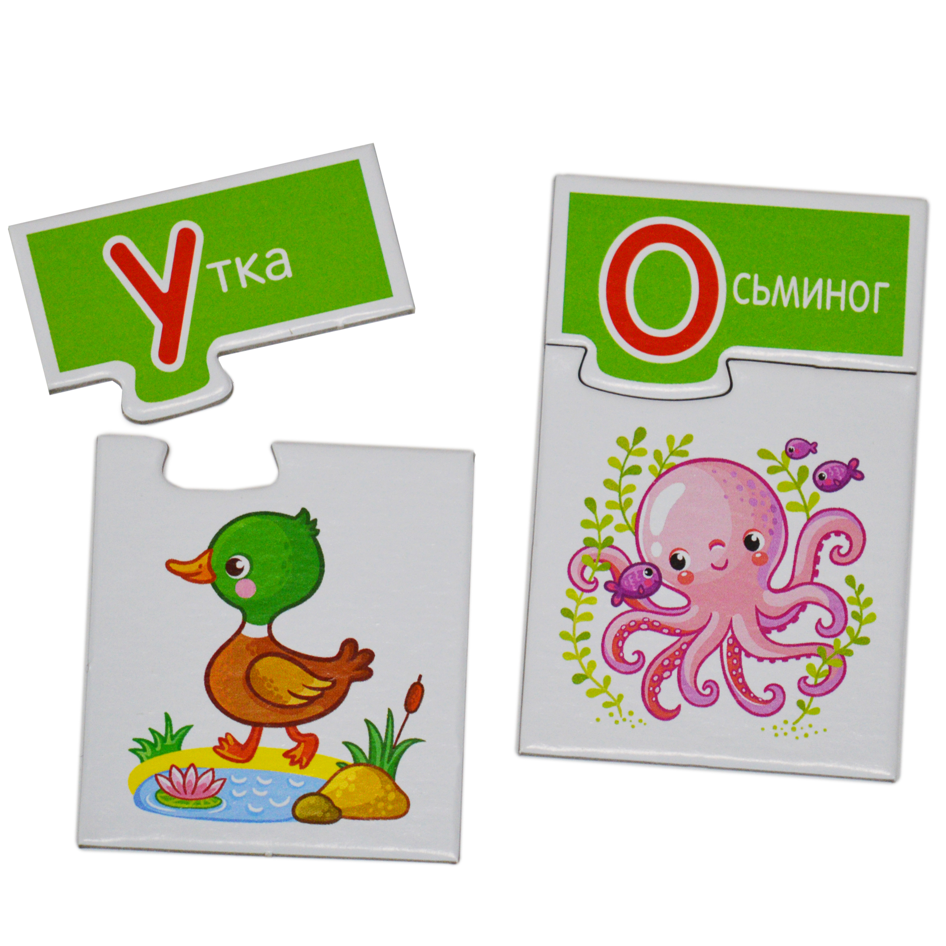 На карточках изображены очаровательные животные. Ребёнку нужно определить первый звук в названии и подобрать соответствующую карточку с буквой. Если всё сделано правильно, две фигурные карточки соединяться по принципу пазла.