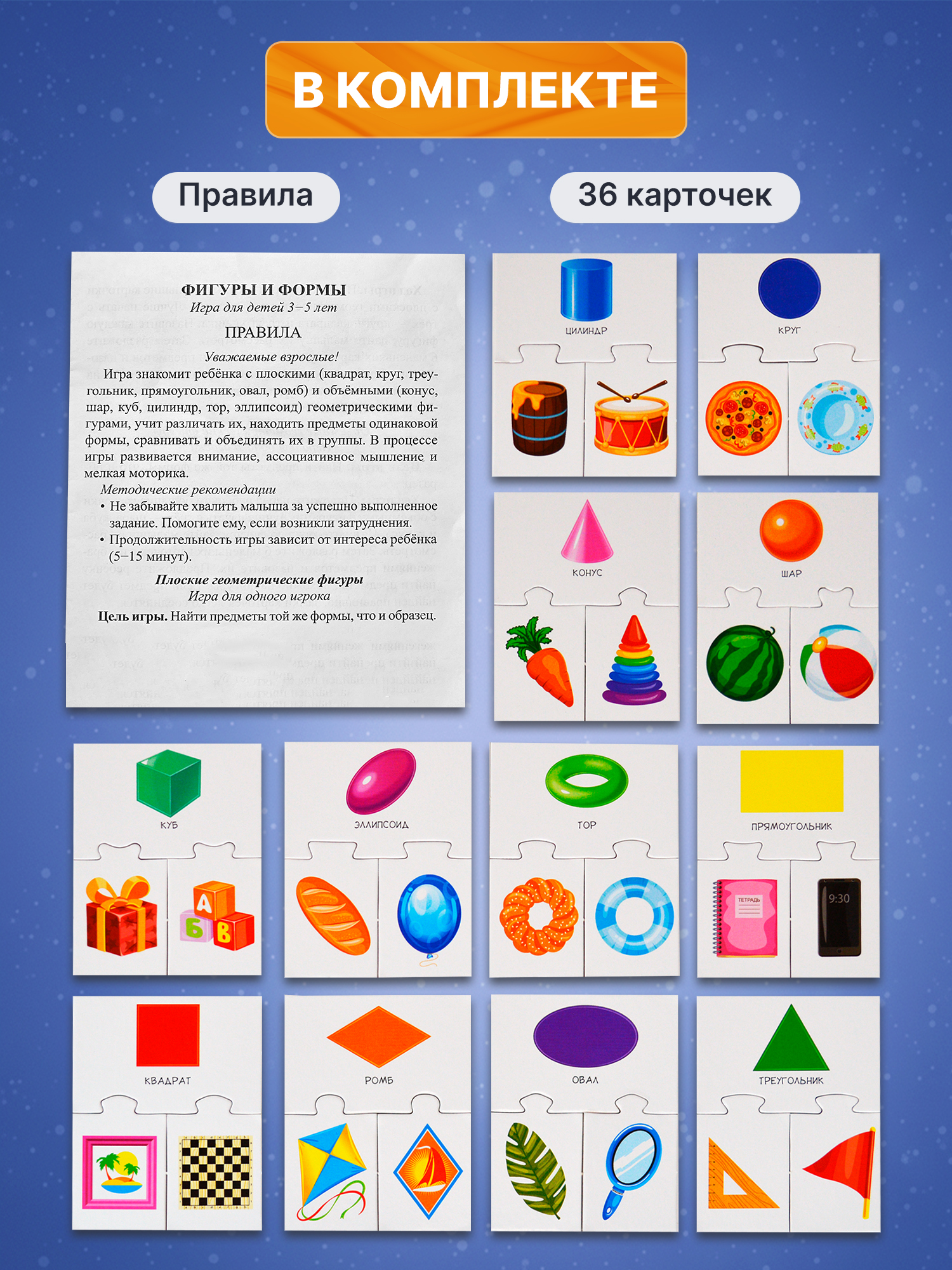 В комплект игры входят: 36 карточек, правила.