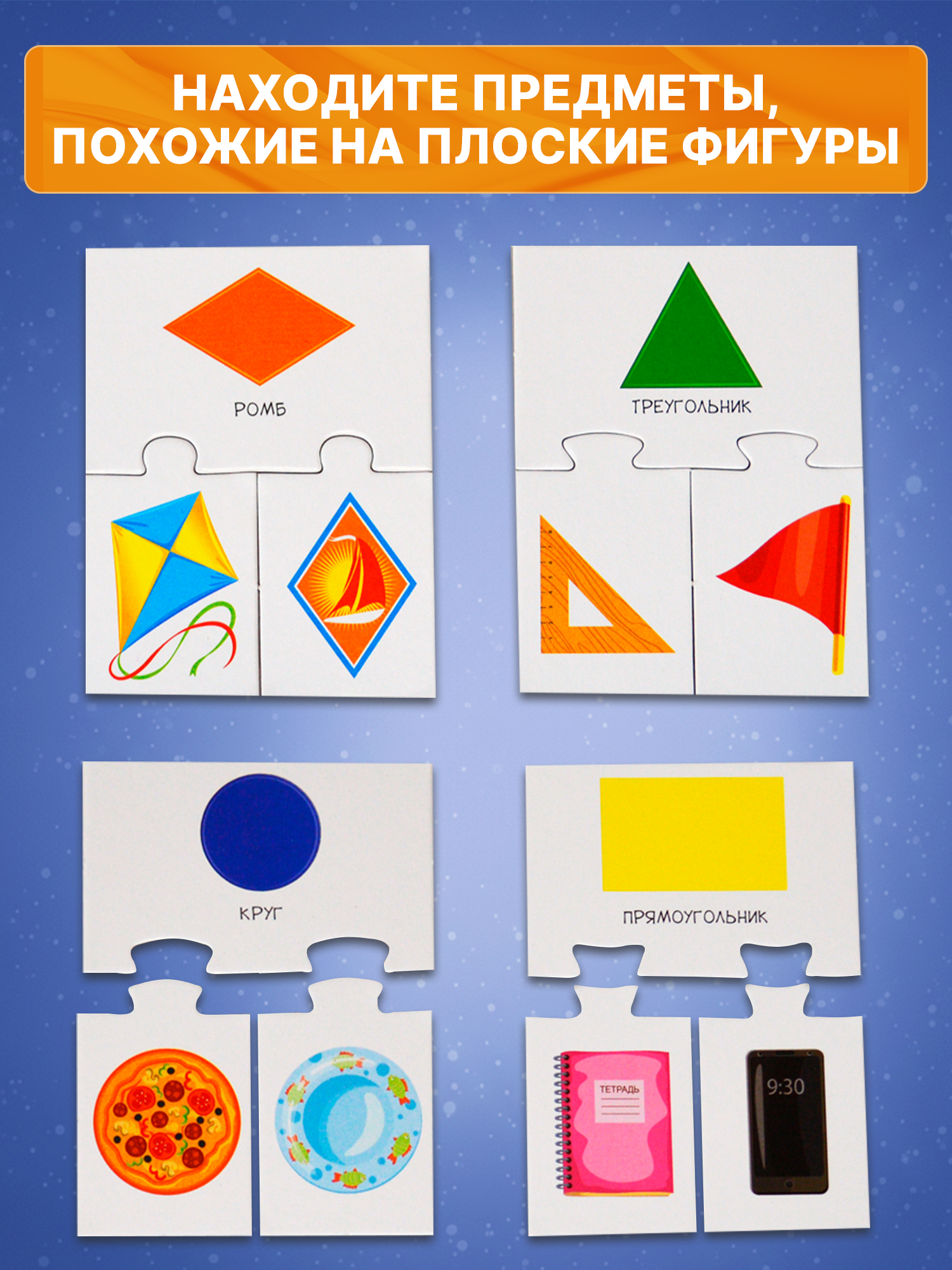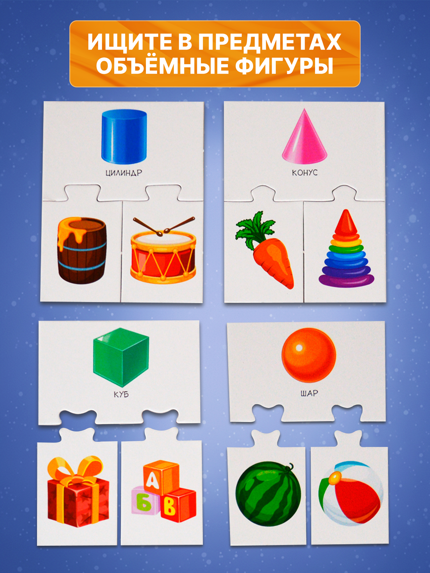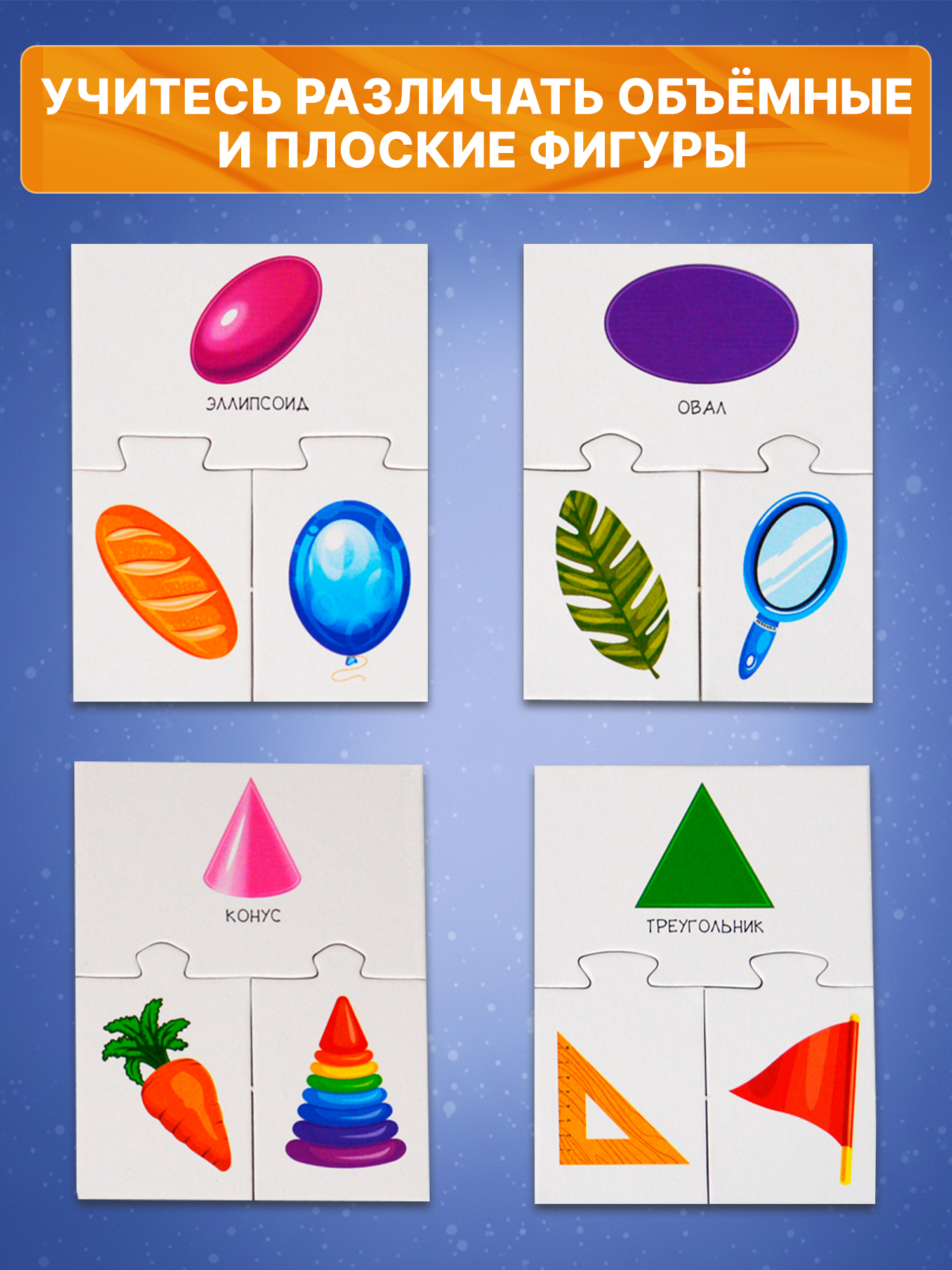 Игра знакомит с плоскими (квадрат, круг, треугольник, прямоугольник, овал, ромб) и объёмными (конус, шар, куб, цилиндр, тор, эллипсоид) геометрическими фигурами, научит различать их. Ребёнок узнает, какие предметы похожи на геометрические фигуры, научится сравнивать их и объединять в группы.