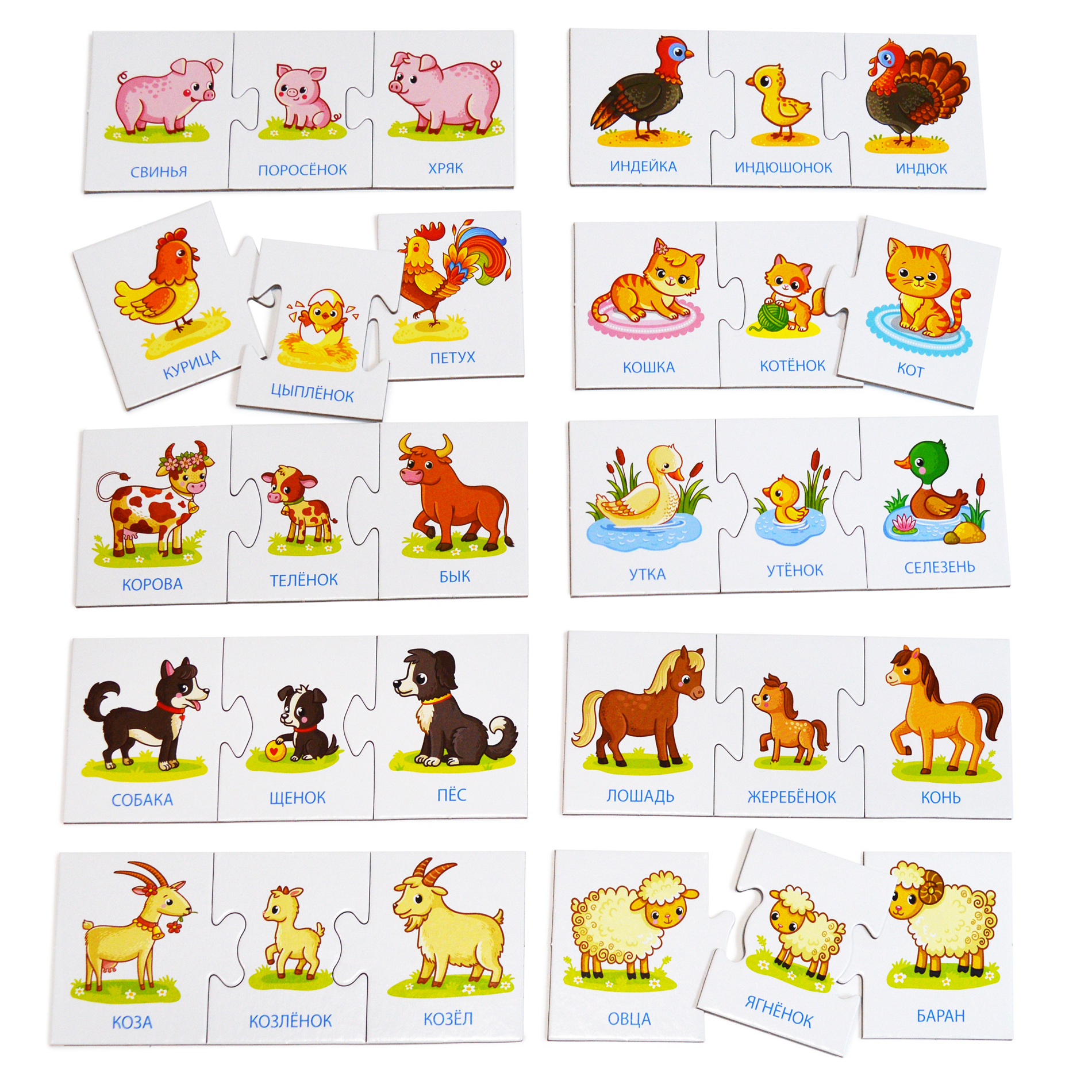 Игра-ассоциация познакомит детей с домашними животными, названиями детёнышей, научит различать их по внешним признакам и объединять в семьи, развивает внимание, мышление, мелкую моторику.