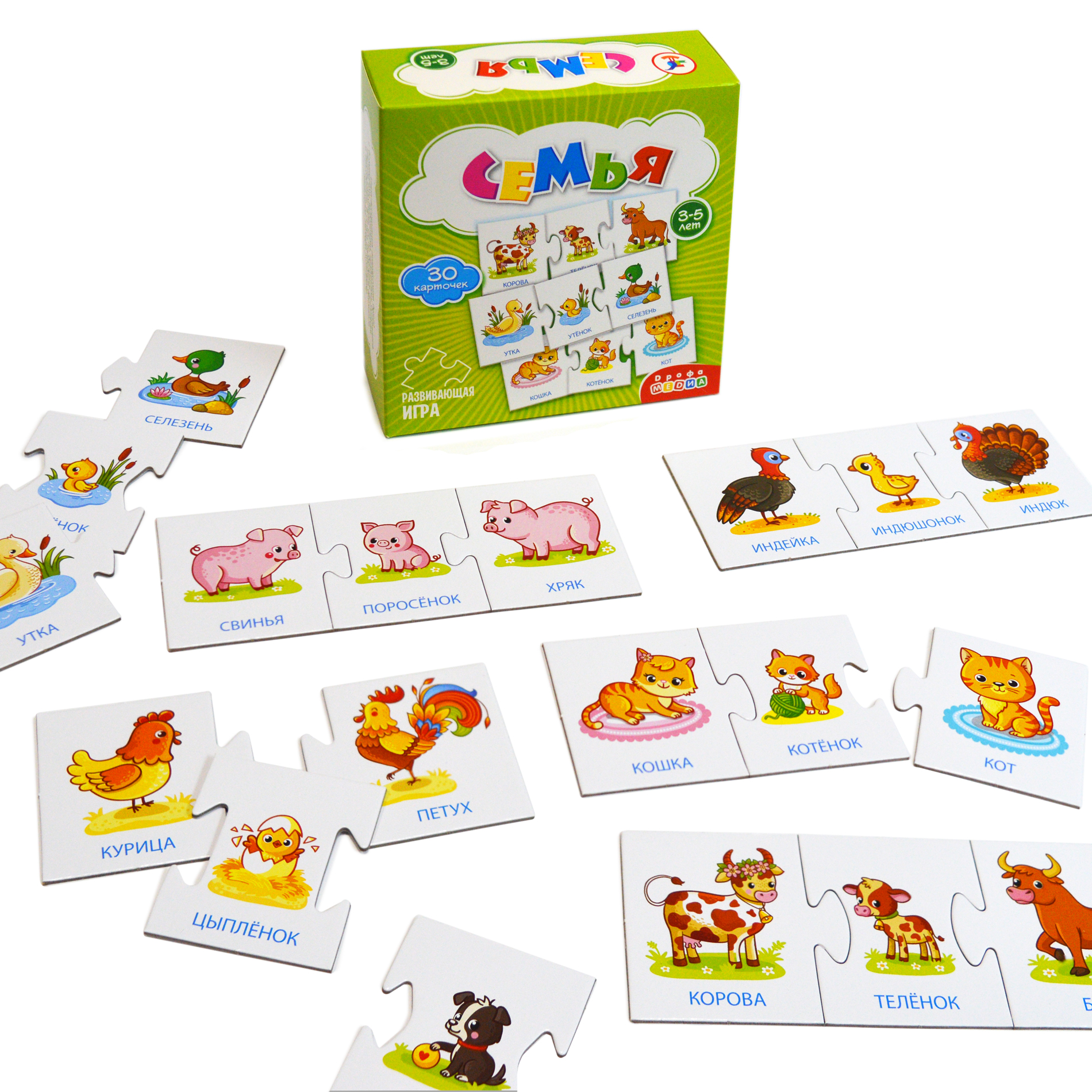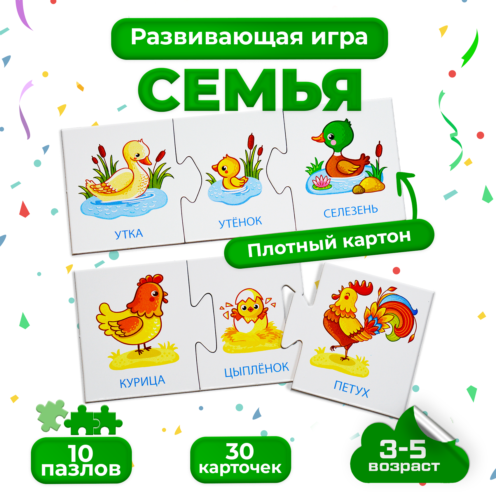 На карточках изображены очаровательные животные. Ребёнку нужно собрать тройки животных, относящихся к одной семье (папа, мама и детёныш). Если всё сделано правильно, три карточки соединятся при помощи пазлового замка. Всего 10 семей (30 животных).