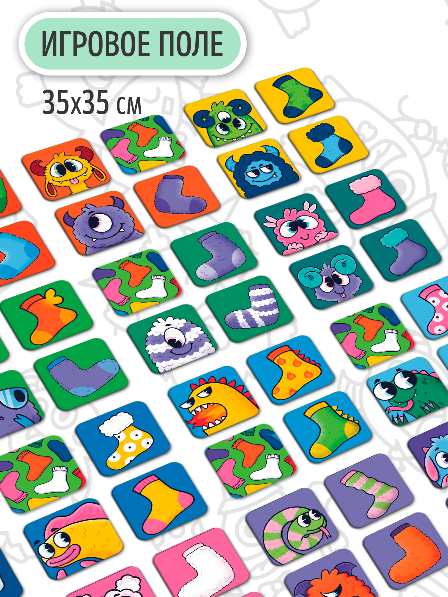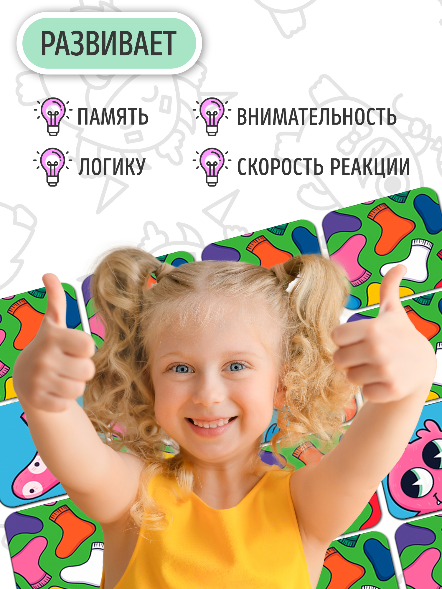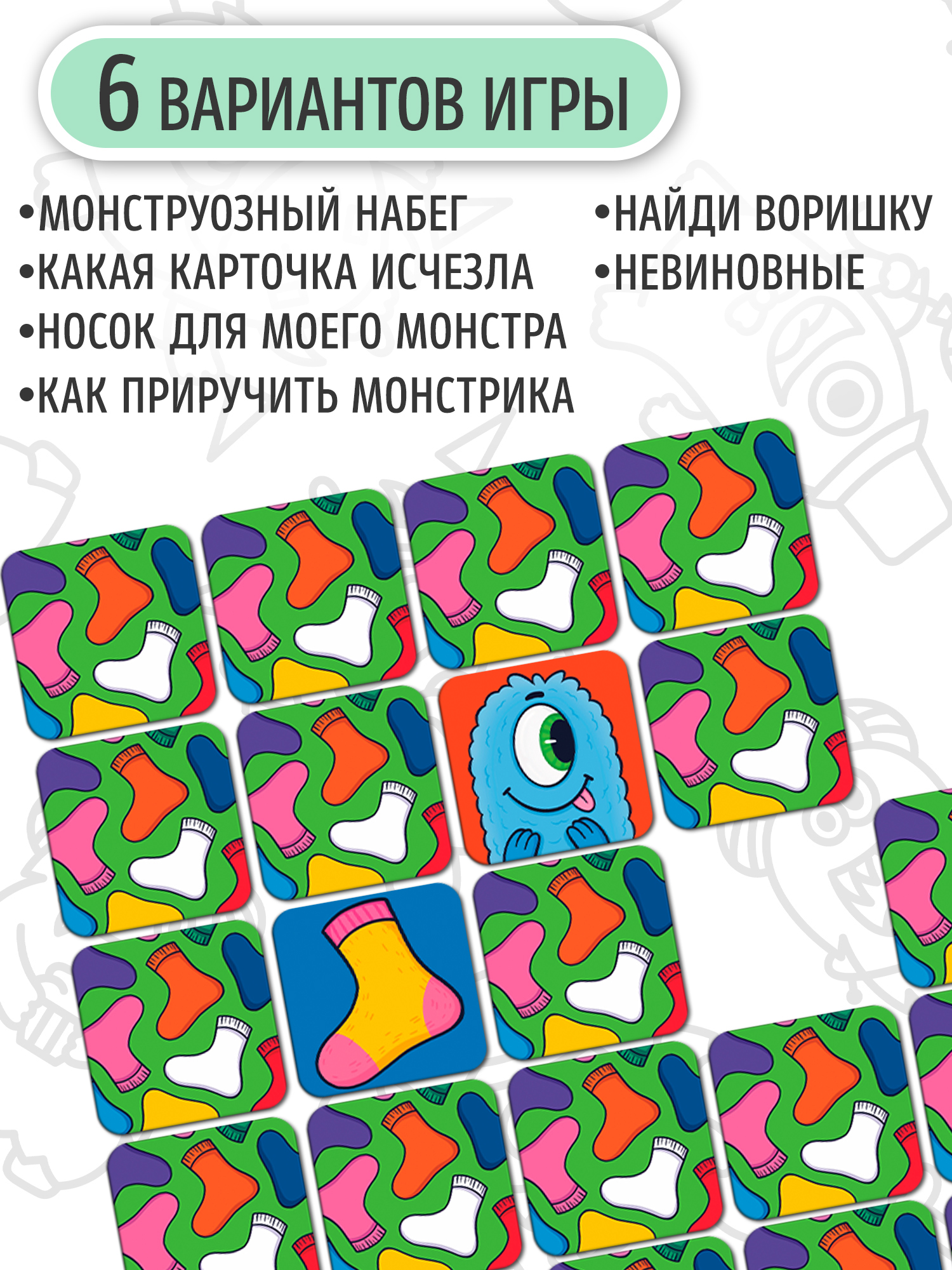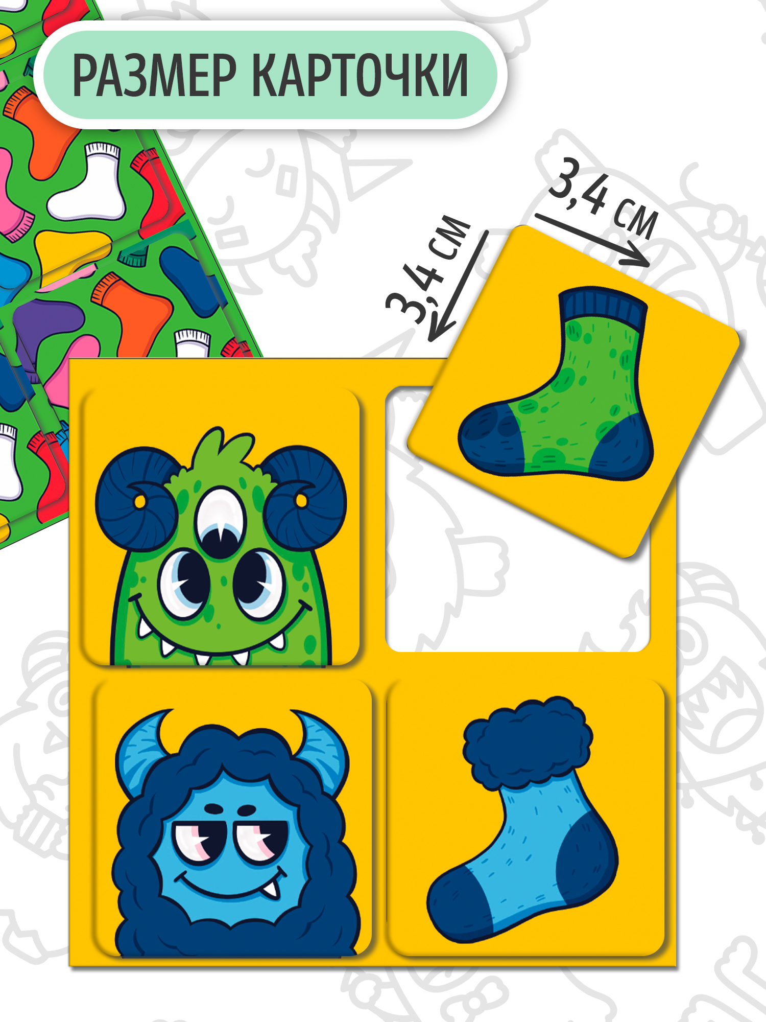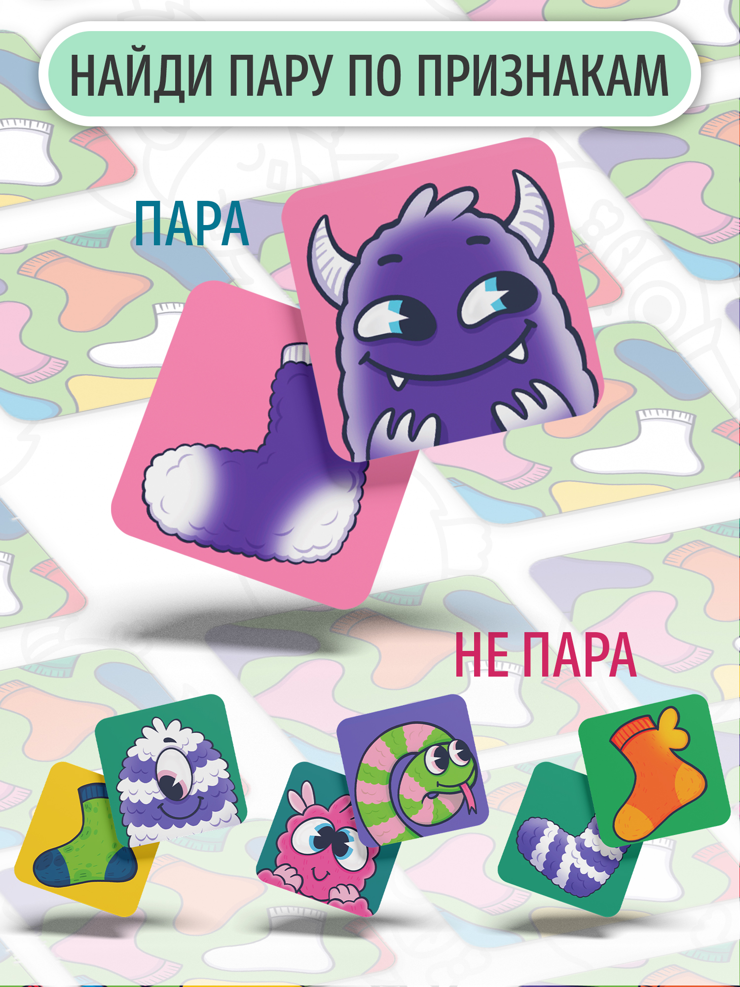 Игра устроена по принципу мемо, где пары формируются из монстрика и носочка на основании одинаковых визуальных признаков. Скорее разложи карточки с монстриками и носочками и определи, какой монстрик какой носок утащил.
