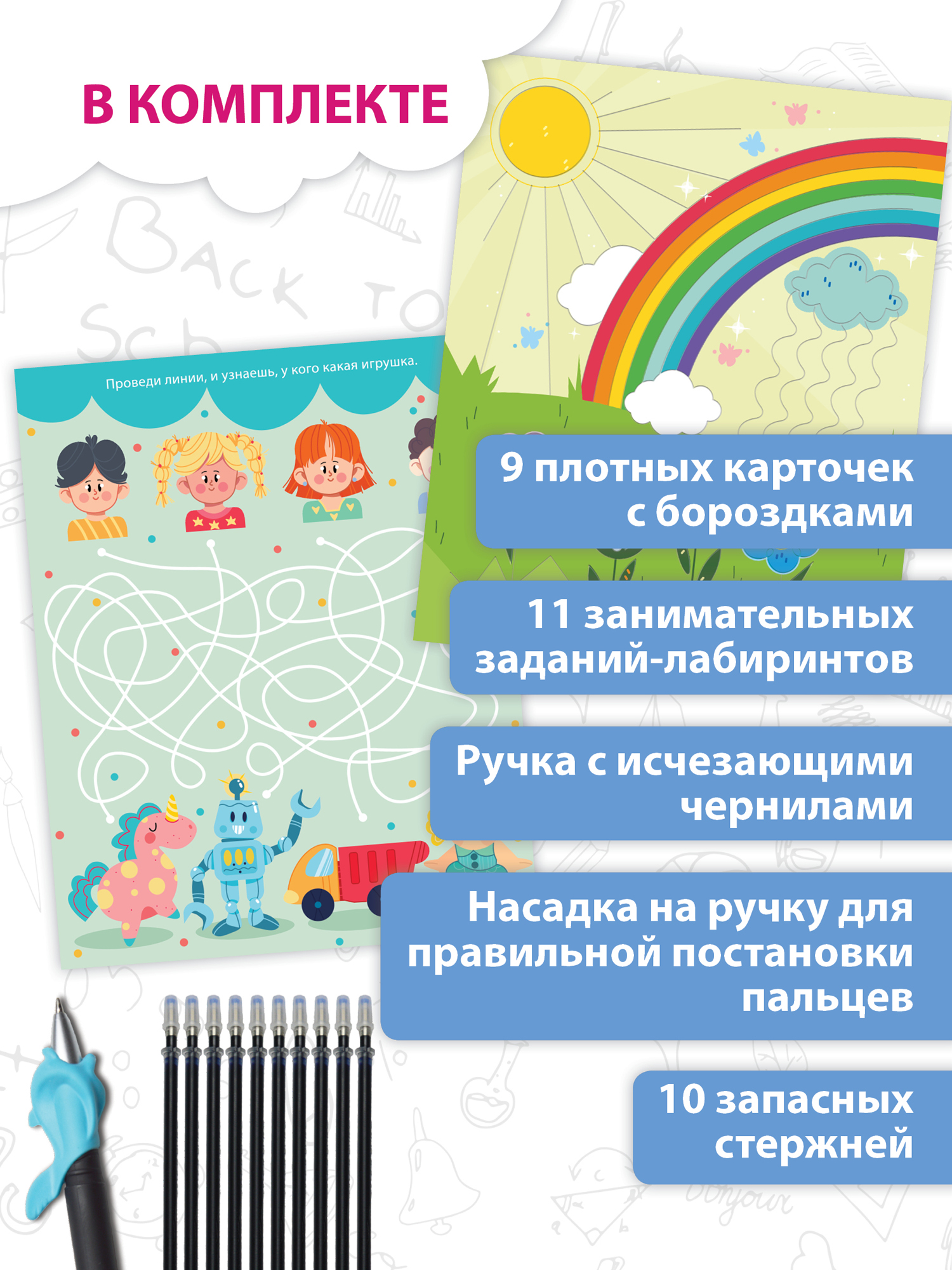 В комплекте: 9 карточек с тиснением, 2 карточки без тиснения, ручка, 10 стержней, насадка на ручку.