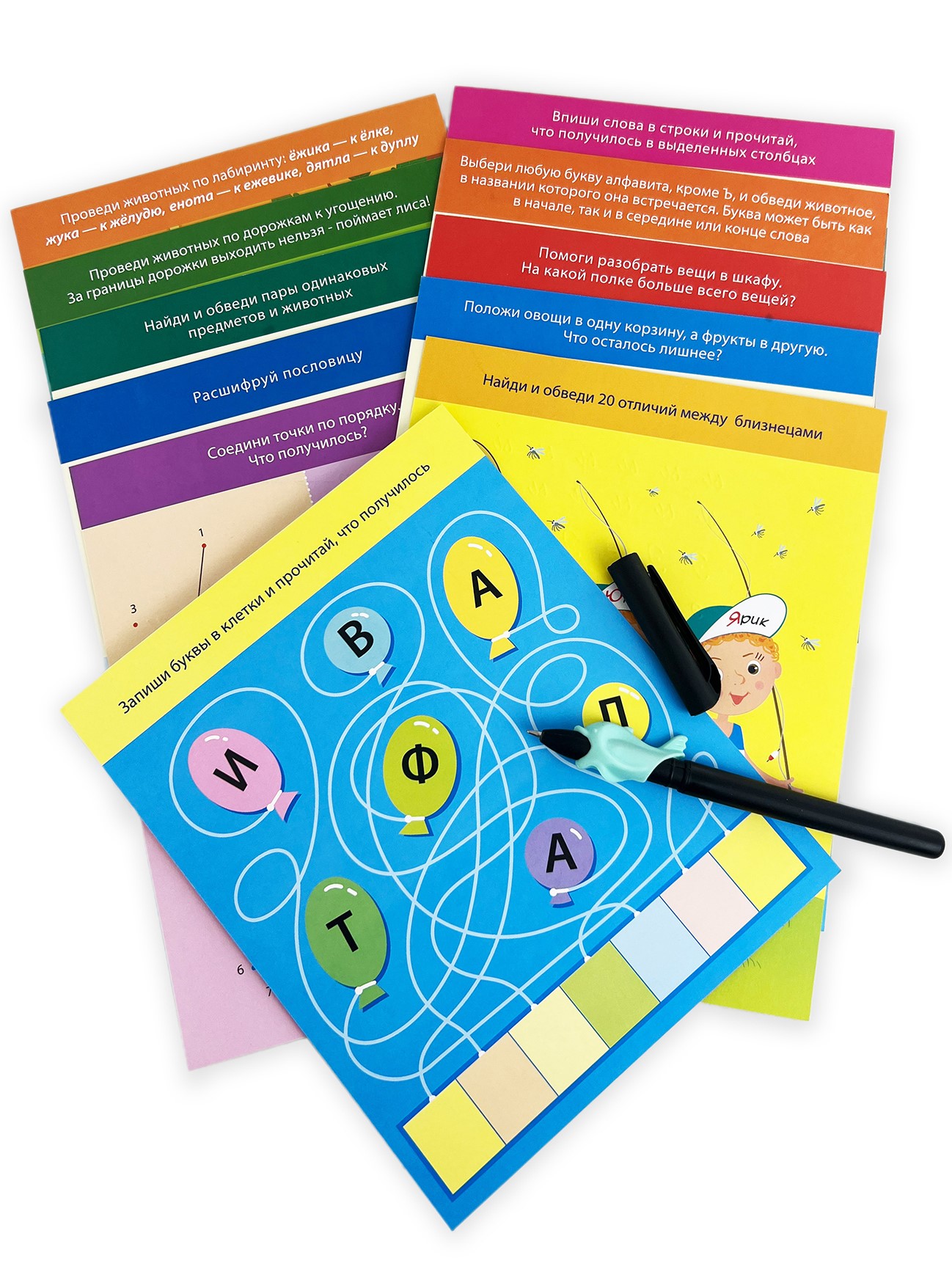 На обороте карточек — занимательное задание (лабиринт, соедини по точкам, найди отличия или одинаковые предметы и т. п.).