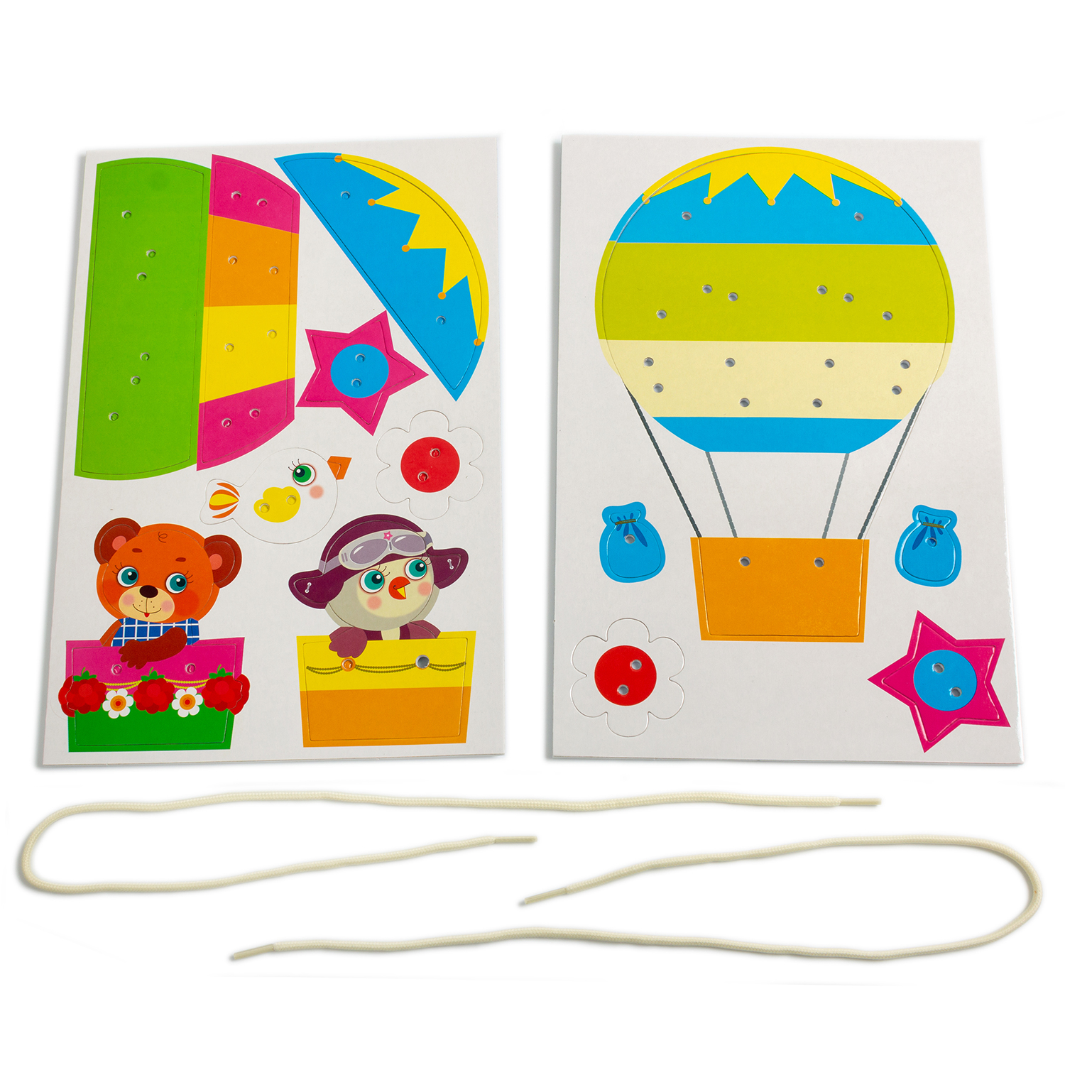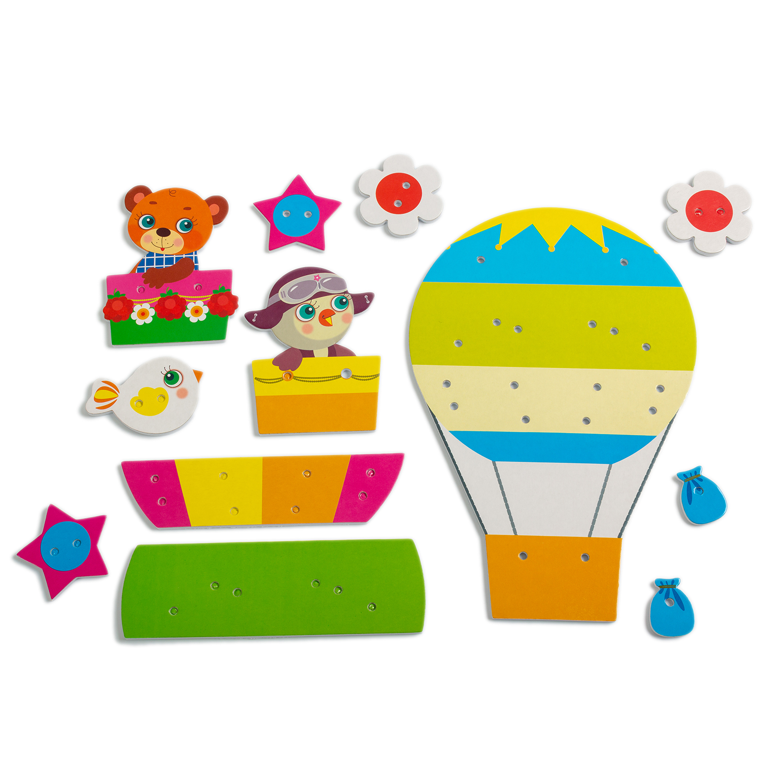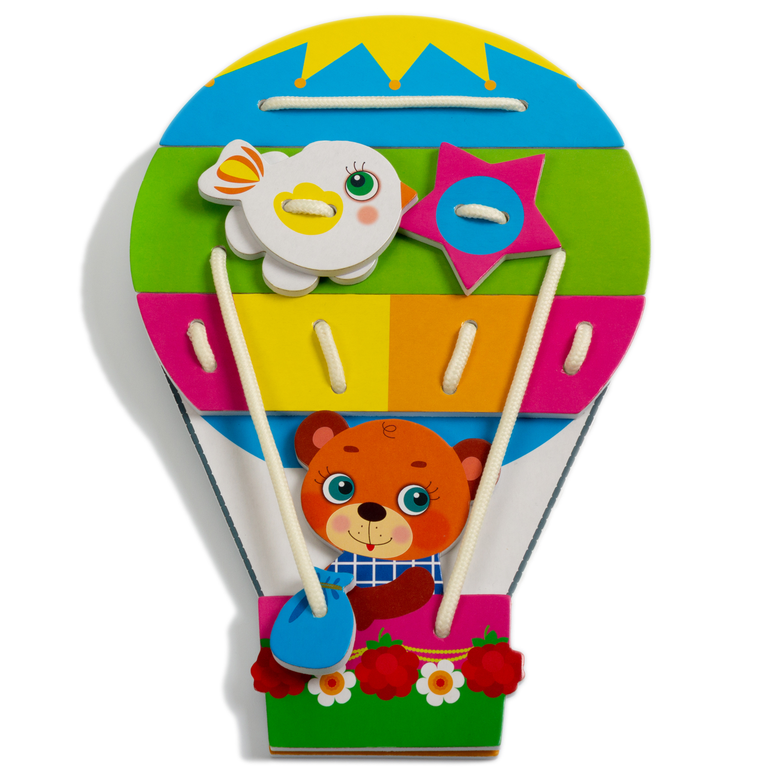 В игре можно украсить воздушный шар цветами или звёздами, натянуть канаты, закрепить балласт и посадить в корзину капитана. А когда все детали на своих местах — самое время дать волю фантазии и поиграть! Во время игры ребёнок научится контролировать точность движений рук, обогатит тактильный опыт и освоит навык простой шнуровки.