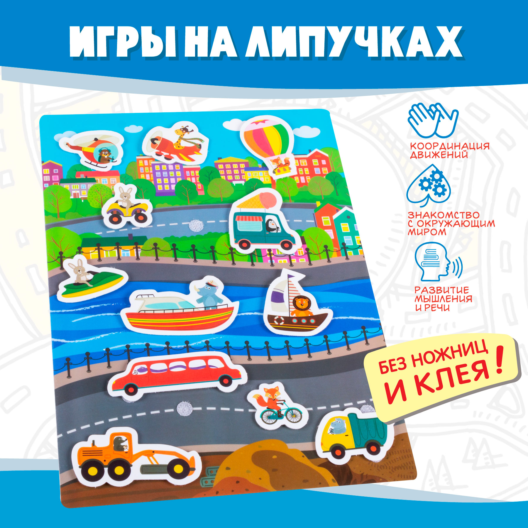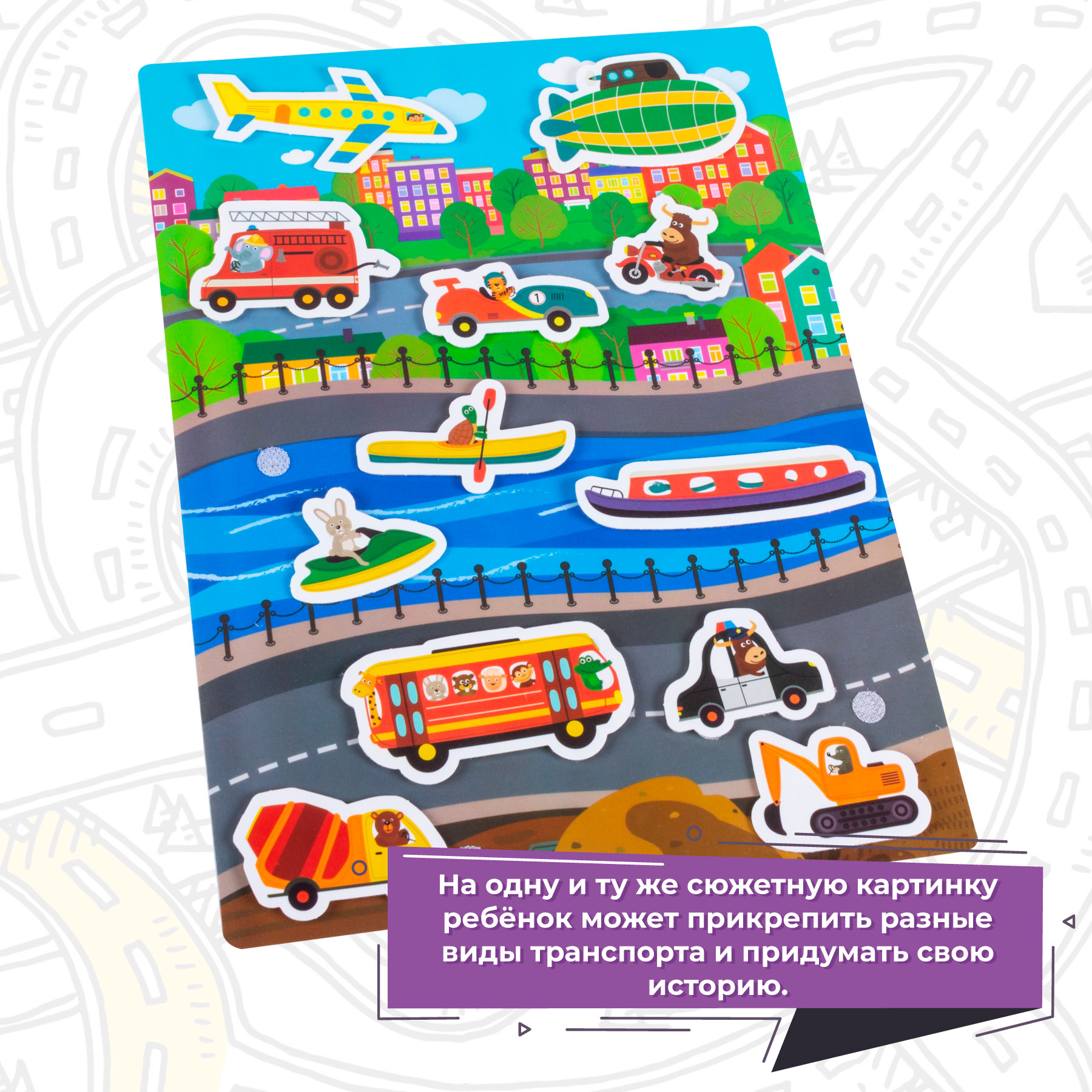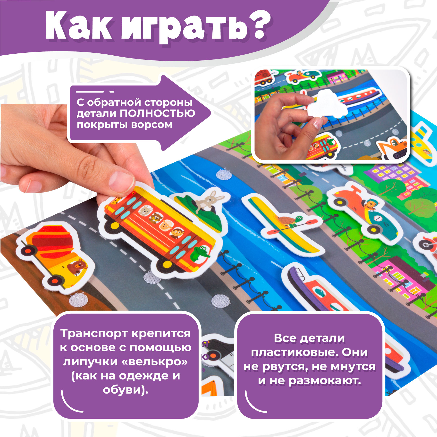 Игра знакомит с разными видами транспорта - наземным, водным и воздушным, учит пользоваться липучками, развивает речь, мышление, воображение, мелкую моторику.