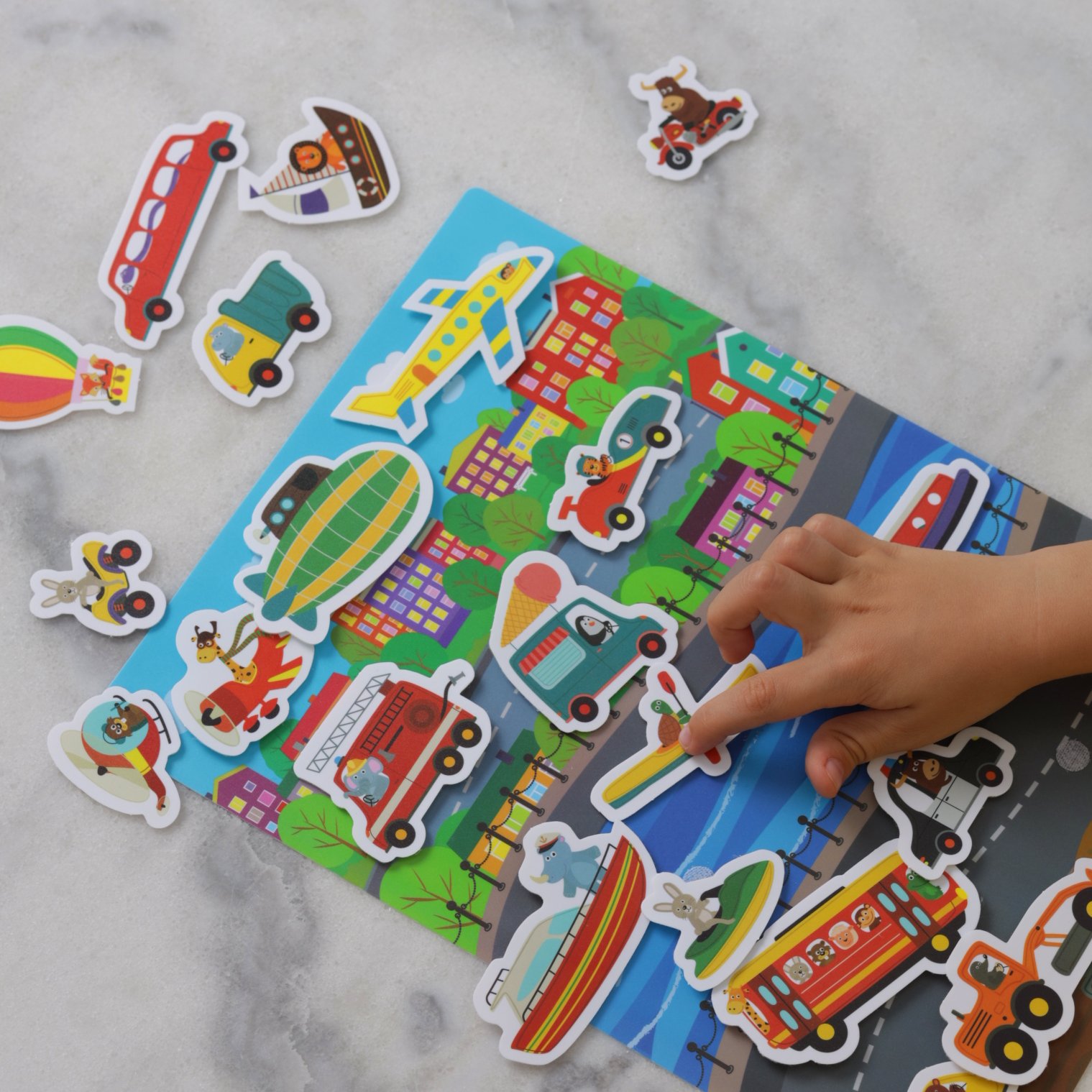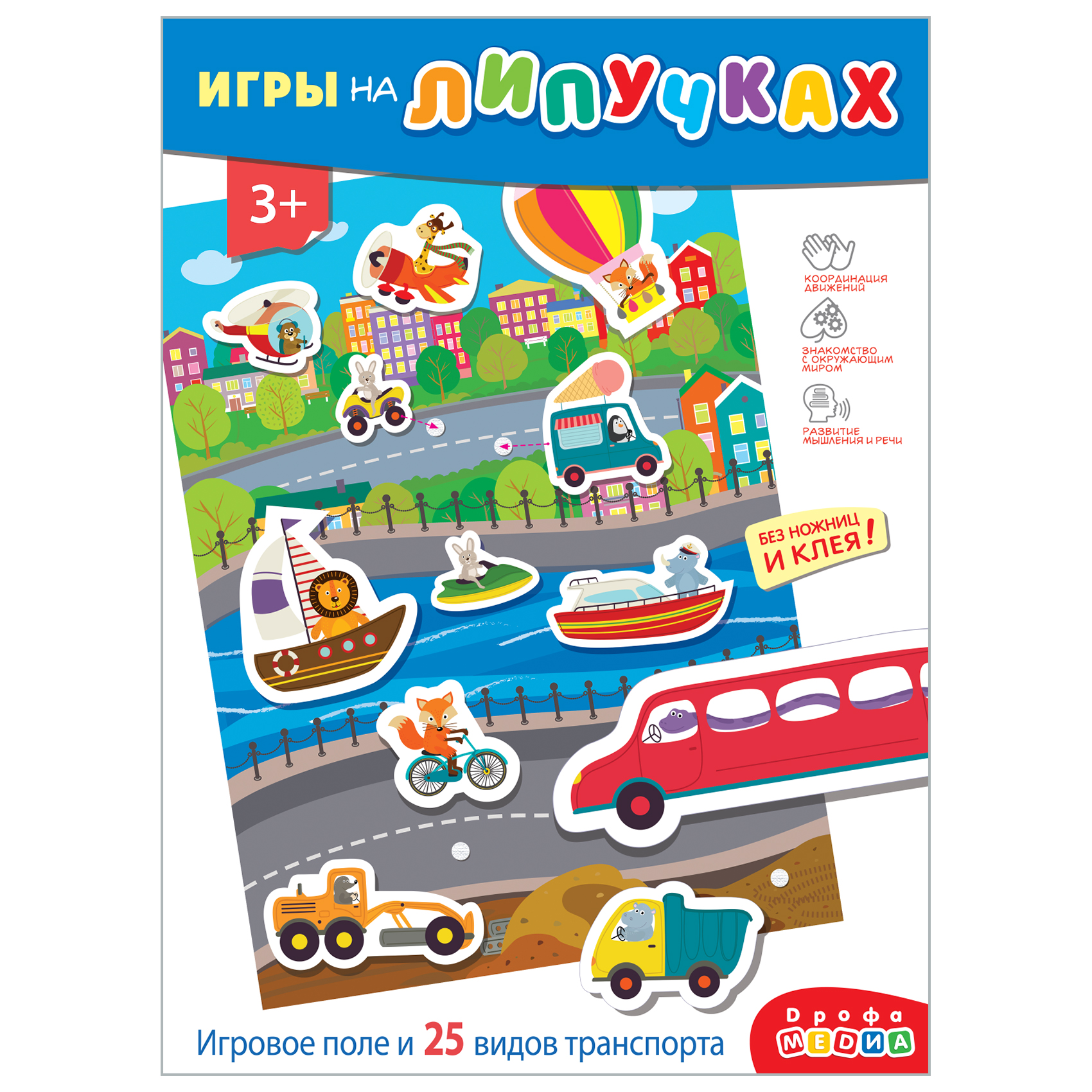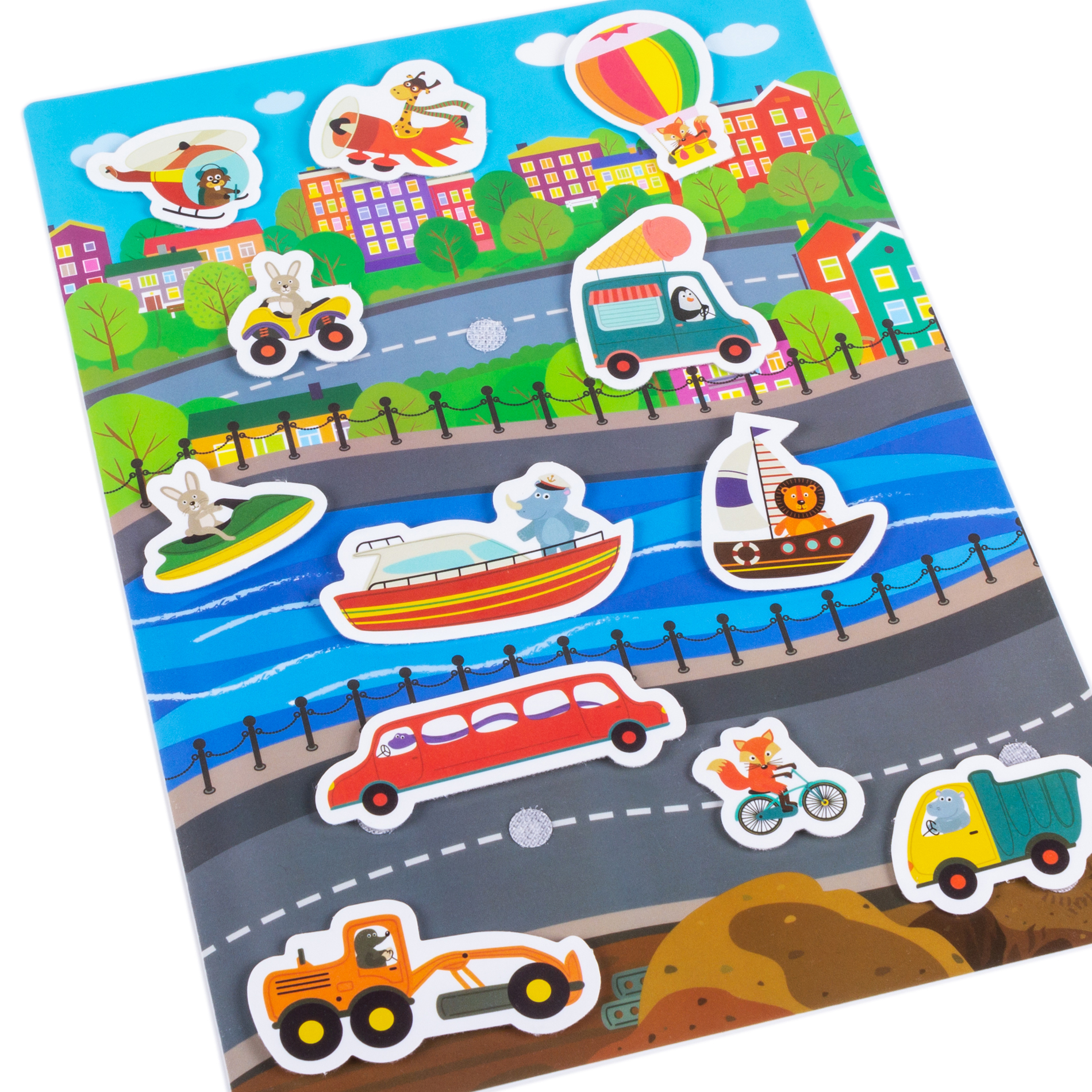 Игра знакомит с разными видами транспорта - наземным, водным и воздушным, учит пользоваться липучками, развивает речь, мышление, воображение, мелкую моторику.