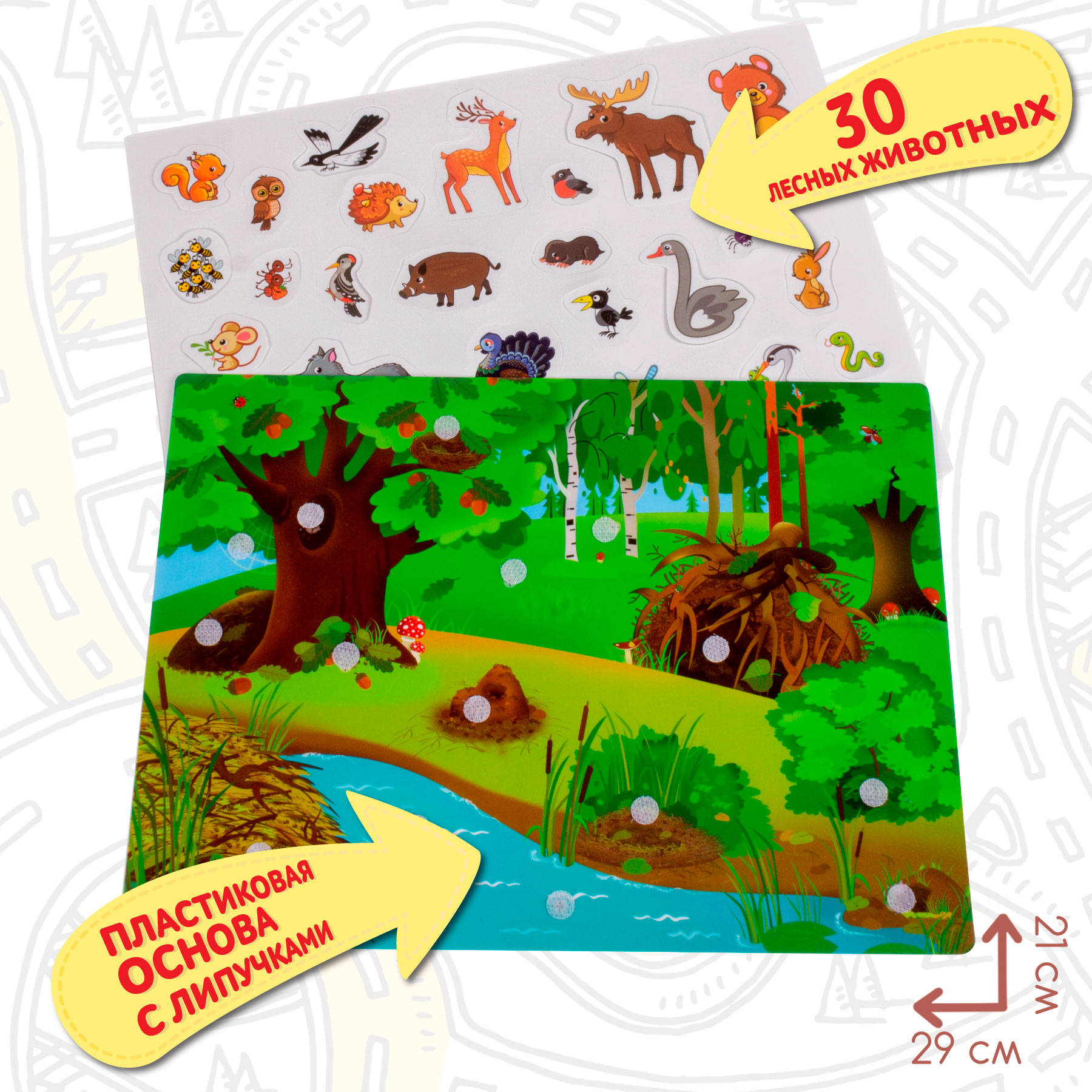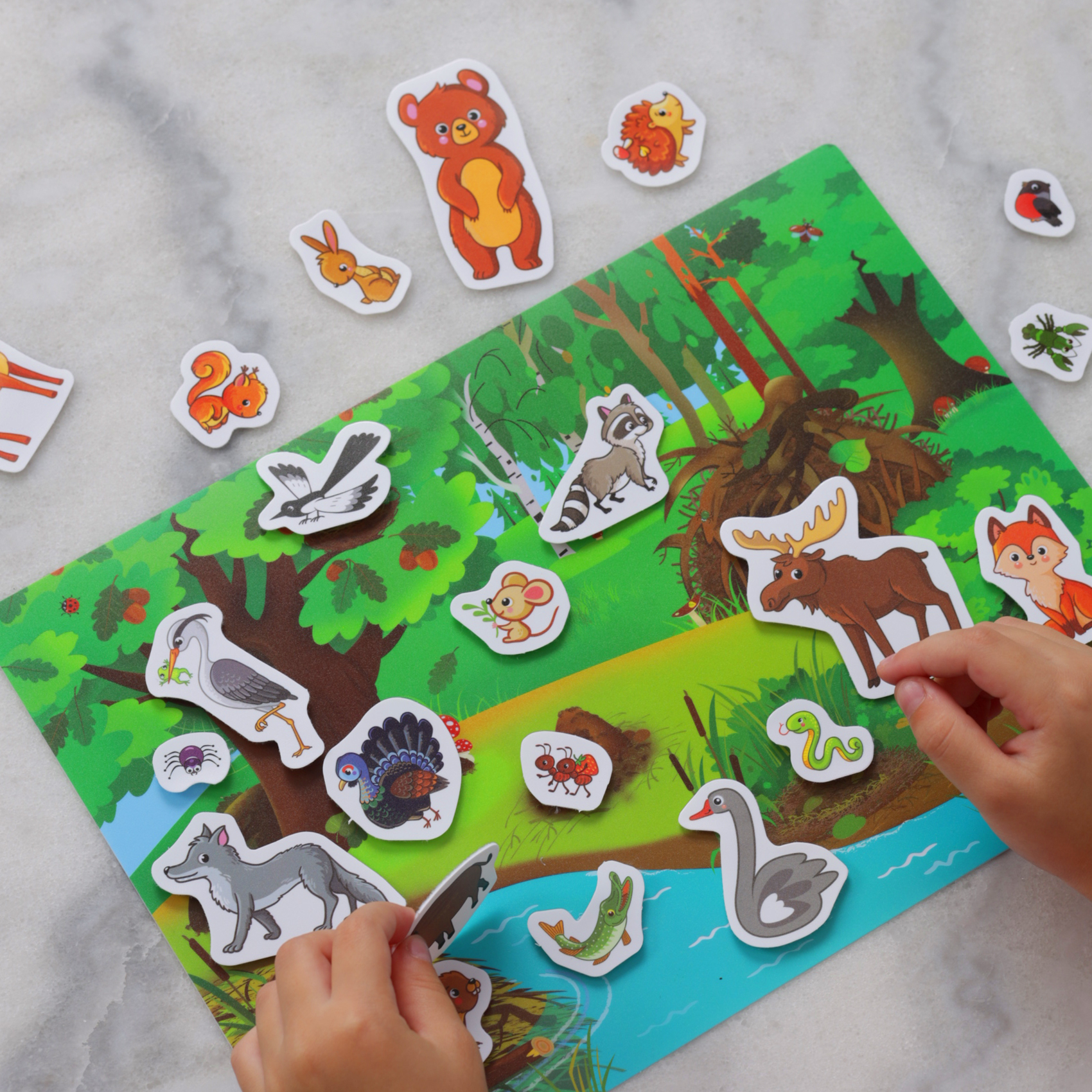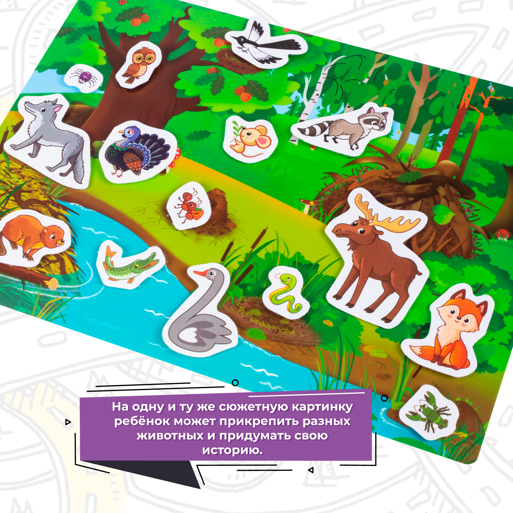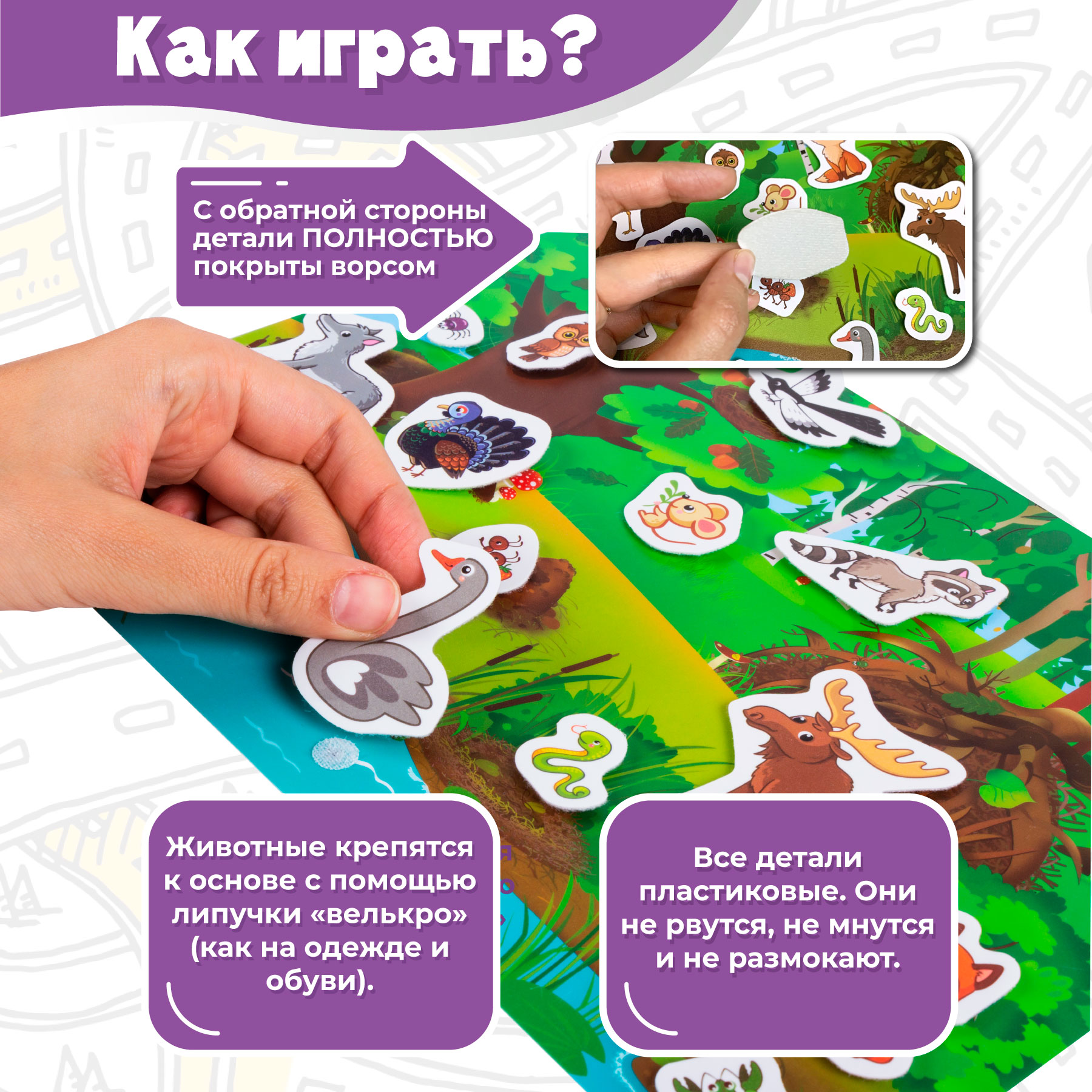 Животные крепятся к игровому полю с помощью липучки «велькро» (как на одежде и обуви). Ребёнок может придумать свою историю о приключениях зверят в лесу.