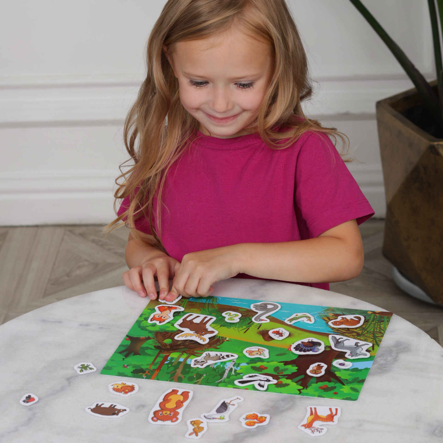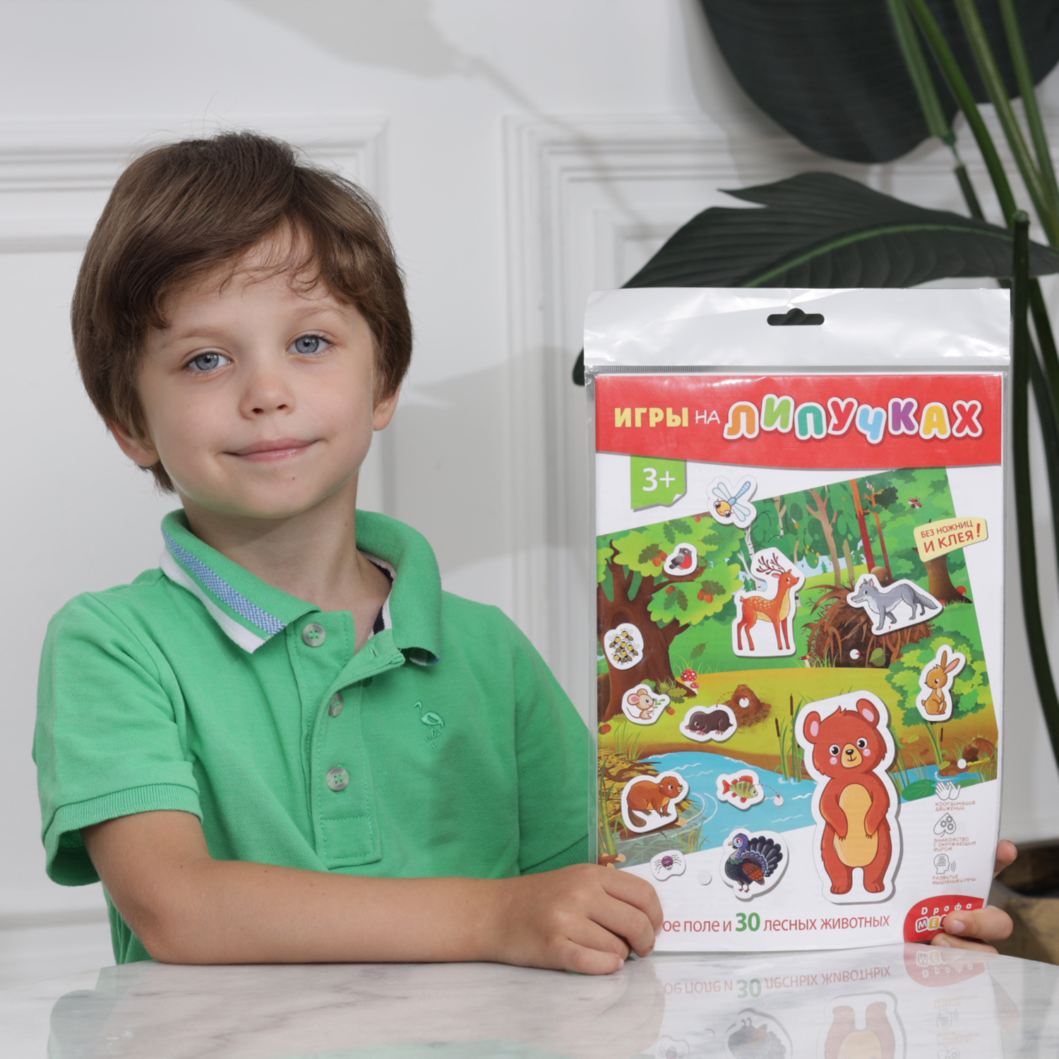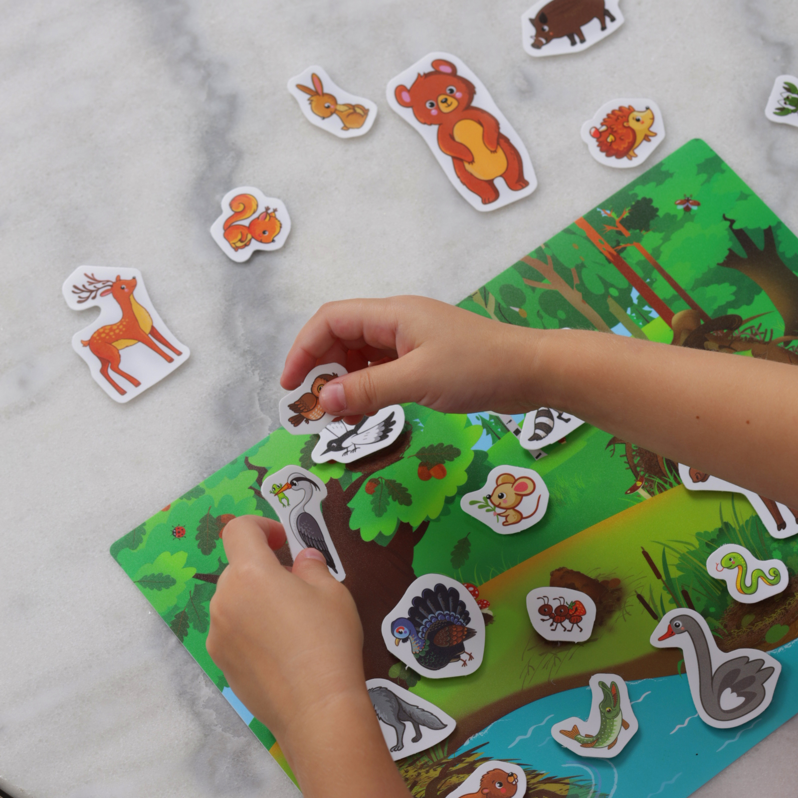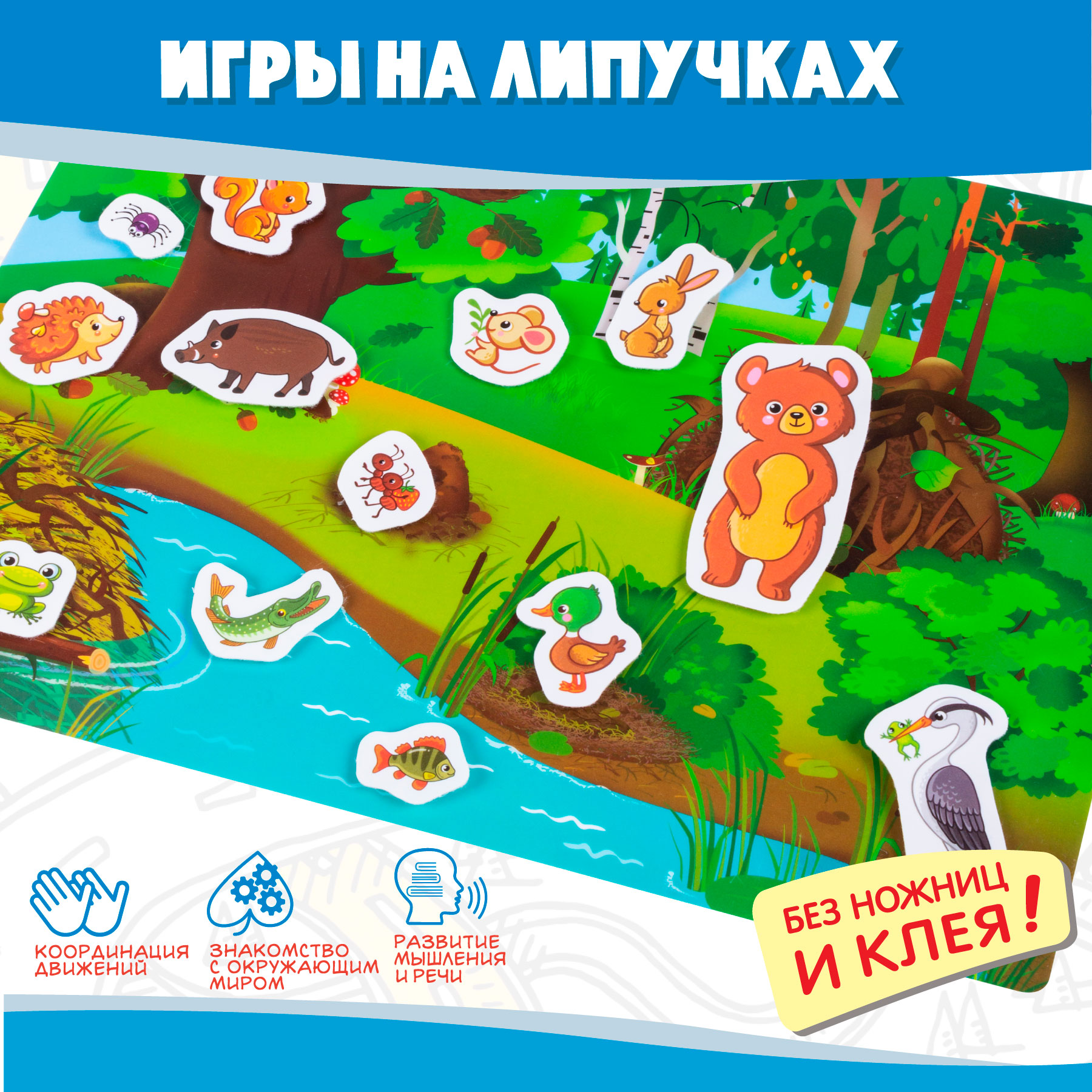 Животные крепятся к игровому полю с помощью липучки «велькро» (как на одежде и обуви). Ребёнок может придумать свою историю о приключениях зверят в лесу.
